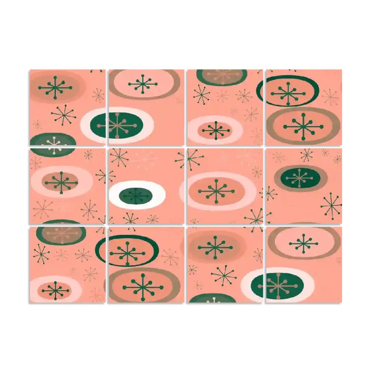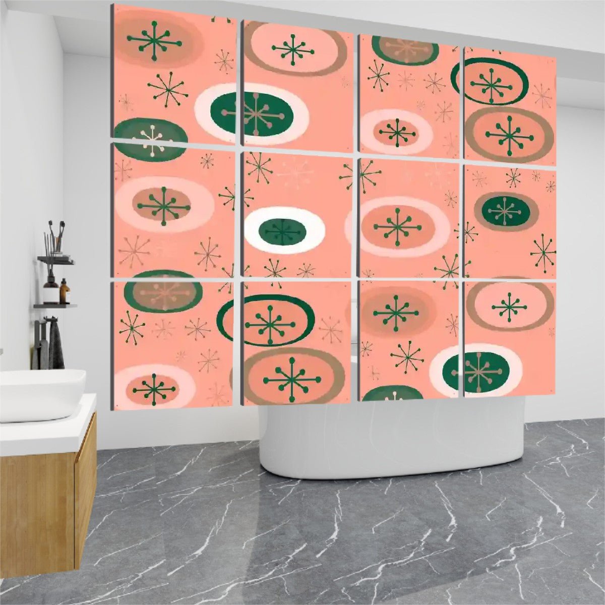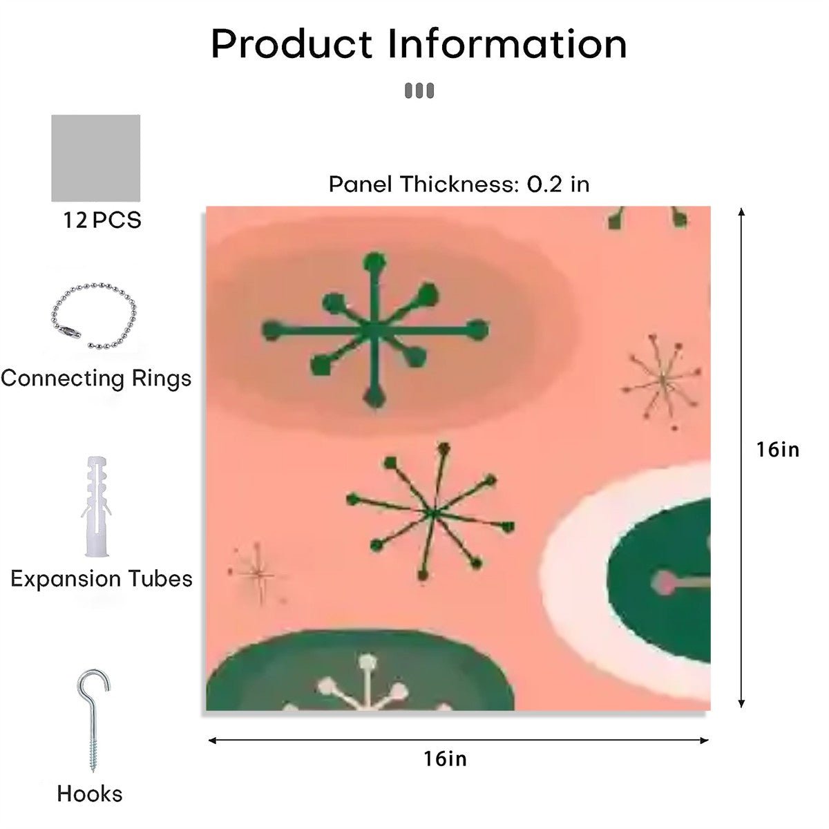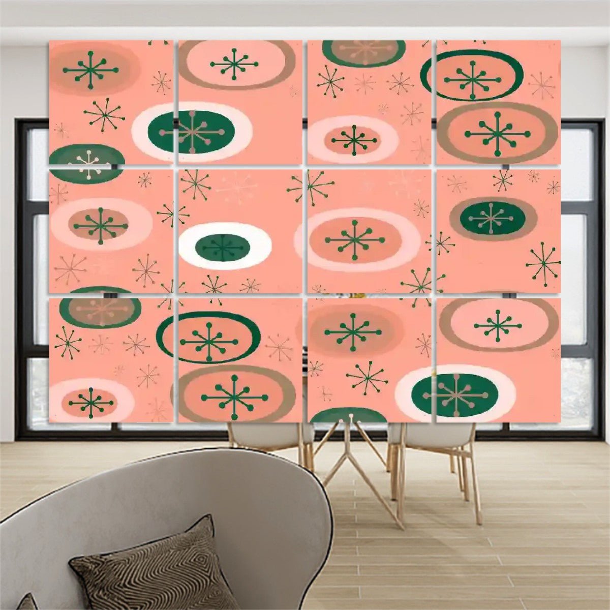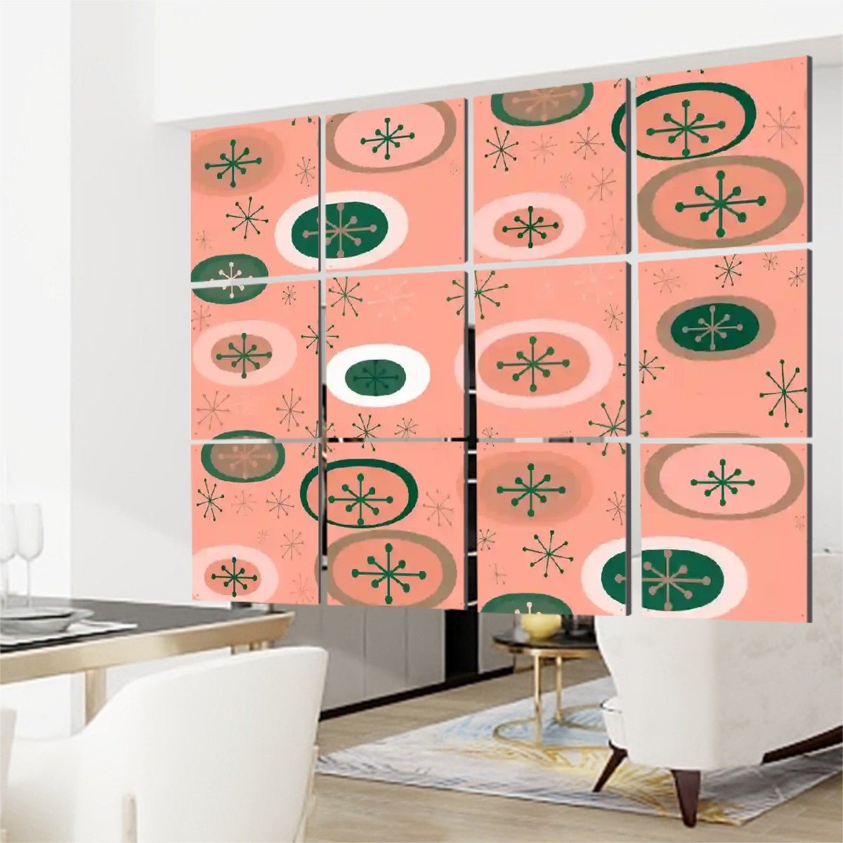Verwandeln Sie Ihren Raum mit diesem hängenden Raumteiler im Atomic Starburst-Design in ein Mid-Century-Traumland. Mit klassischen Googie-inspirierten Kugeln, Atomexplosionen und geometrischen Formen in Vintage-Rosa- und Grüntönen verleiht dieser auffällige Raumteiler jedem Raum Retro-Flair. Ob als Raumteiler, Hintergrund oder dekoratives Element – dieser leichte und dennoch robuste Raumteiler strahlt den nostalgischen Charme der 50er und 60er Jahre aus.