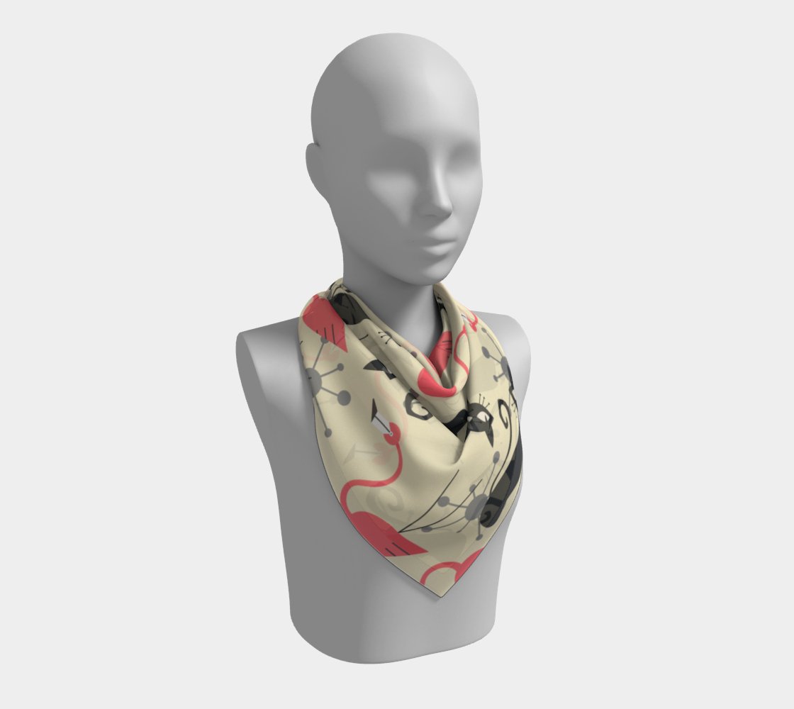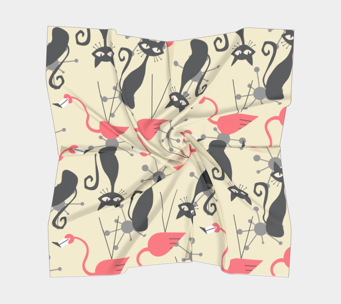 Dieser fabelhafte Seidenschal mit einer verspielten Mischung aus Atomic Cats und kitschigen Flamingos verleiht jedem Outfit einen Hauch von Mid-Century-Modern-Flair. Mit seinem weichen Seidenstoff ist er gleichermaßen stylisch und gemütlich. Zeigen Sie Ihre skurrile Seite mit diesem einzigartigen Accessoire! (Eine tolle Wahl!)