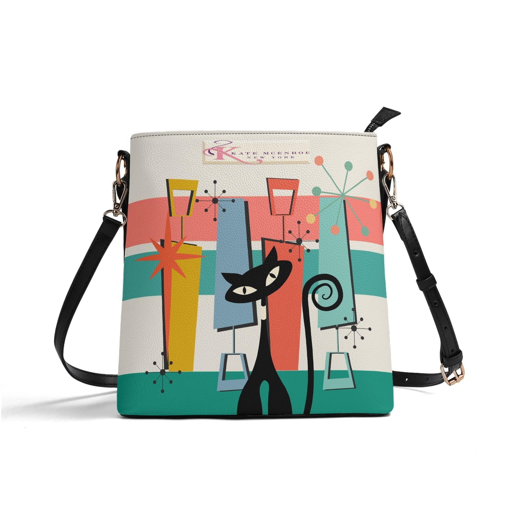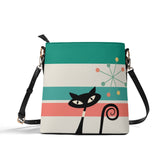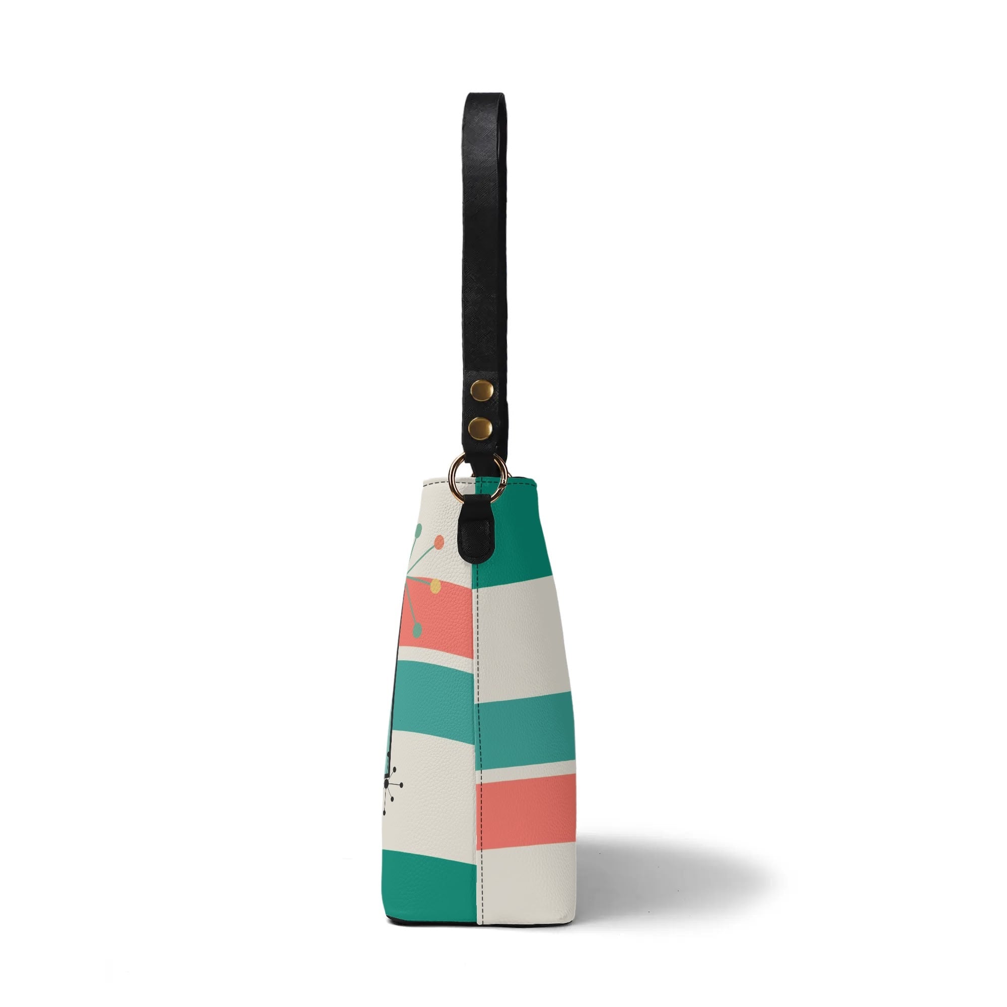 Atomic Cat Mid Century Modern Teal Coral Cream Gestreifte Crossbody Bucket Bag, Retro Geometrische Handtasche