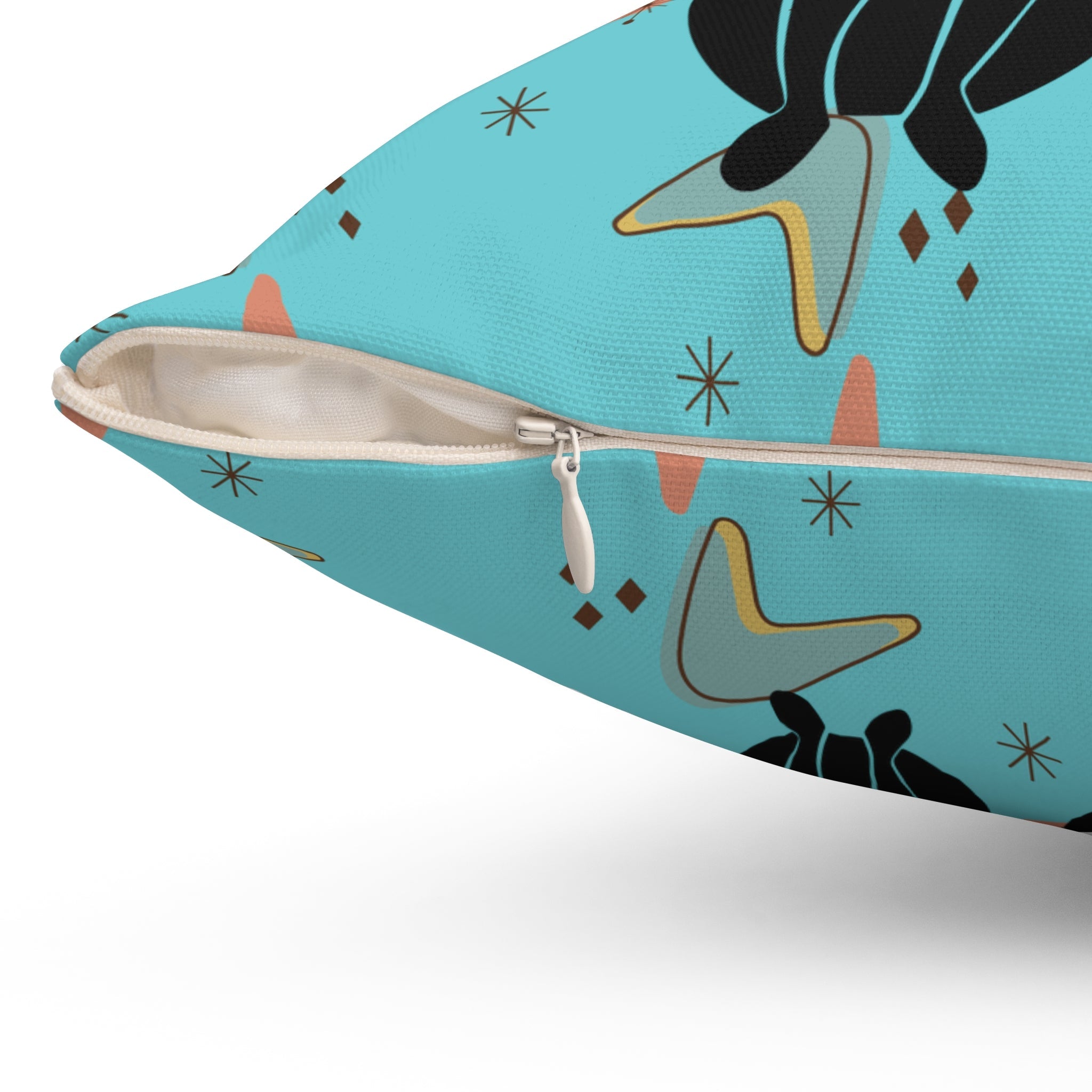 Verleihen Sie Ihrem Zuhause mit unserem Atomic Cat-Kissen einen Hauch von Retro-Charme. Mit seinem auffälligen Bumerang- und Sternendesign in Blaugrün im 50er-Jahre-Stil setzt dieses moderne Akzentkissen im Mid-Century-Stil in jedem Raum ein Statement. Perfekt für Katzenliebhaber und Liebhaber ausgefallener Deko.