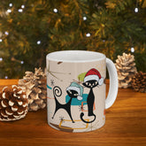 Diese nostalgische Weihnachtstasse zeigt ein verrücktes Trio süßer Katzen inmitten von atomaren Sternenexplosionen. Das verspielte Retro-Design auf beigem Hintergrund weckt festliche Nostalgie für die Mid-Century-Ära. Eine witzige und zugleich kitschige Wahl zum Servieren von Weihnachtskakao, Eierlikör oder Kaffee mit Vintage-Flair. Ein tolles Weihnachtsgeschenk für jeden Katzenliebhaber!