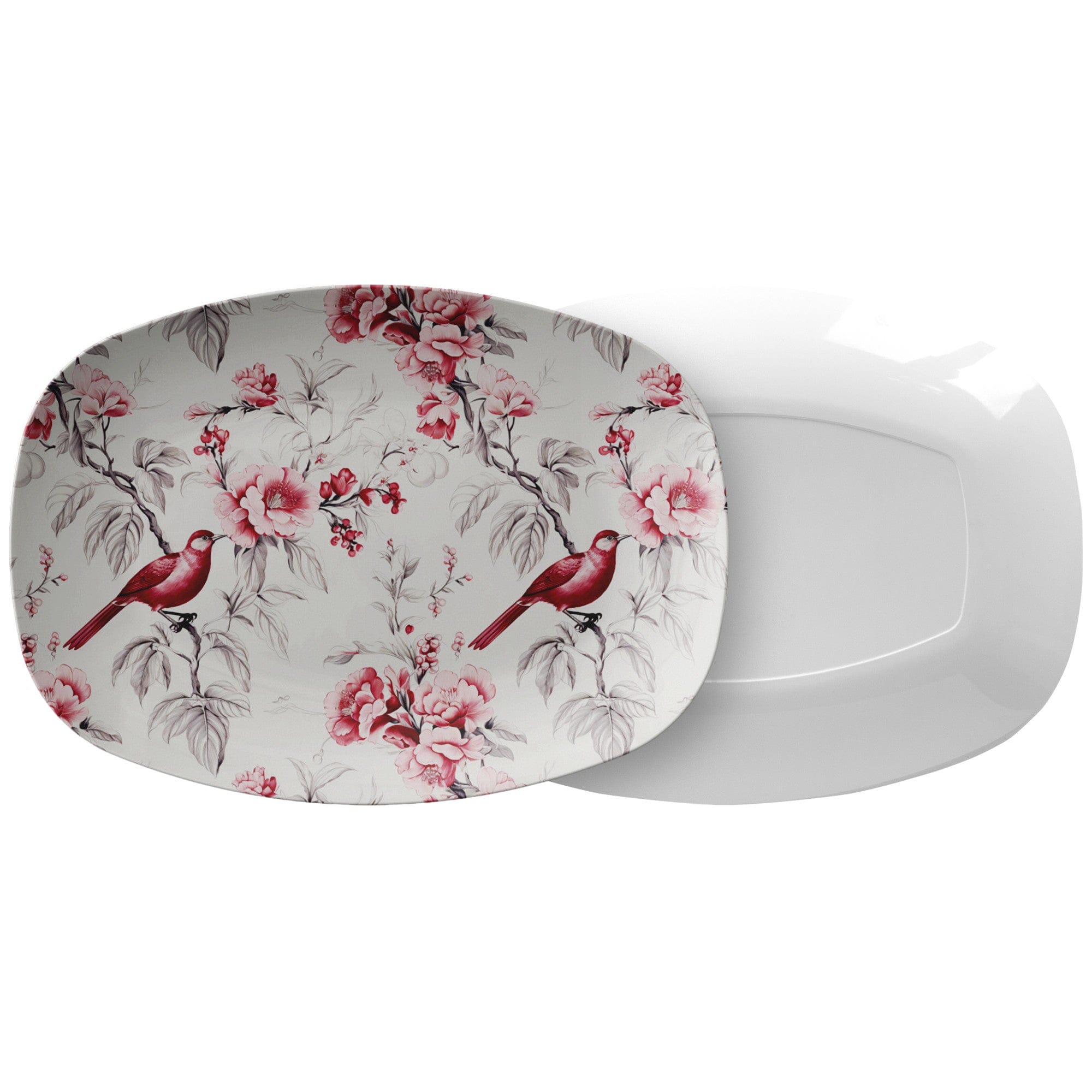 Servierplatte mit Chinoiserie-Motiv, botanisches Toile-Blumenmuster, Cranberry-Rot und Weiß – 133682923