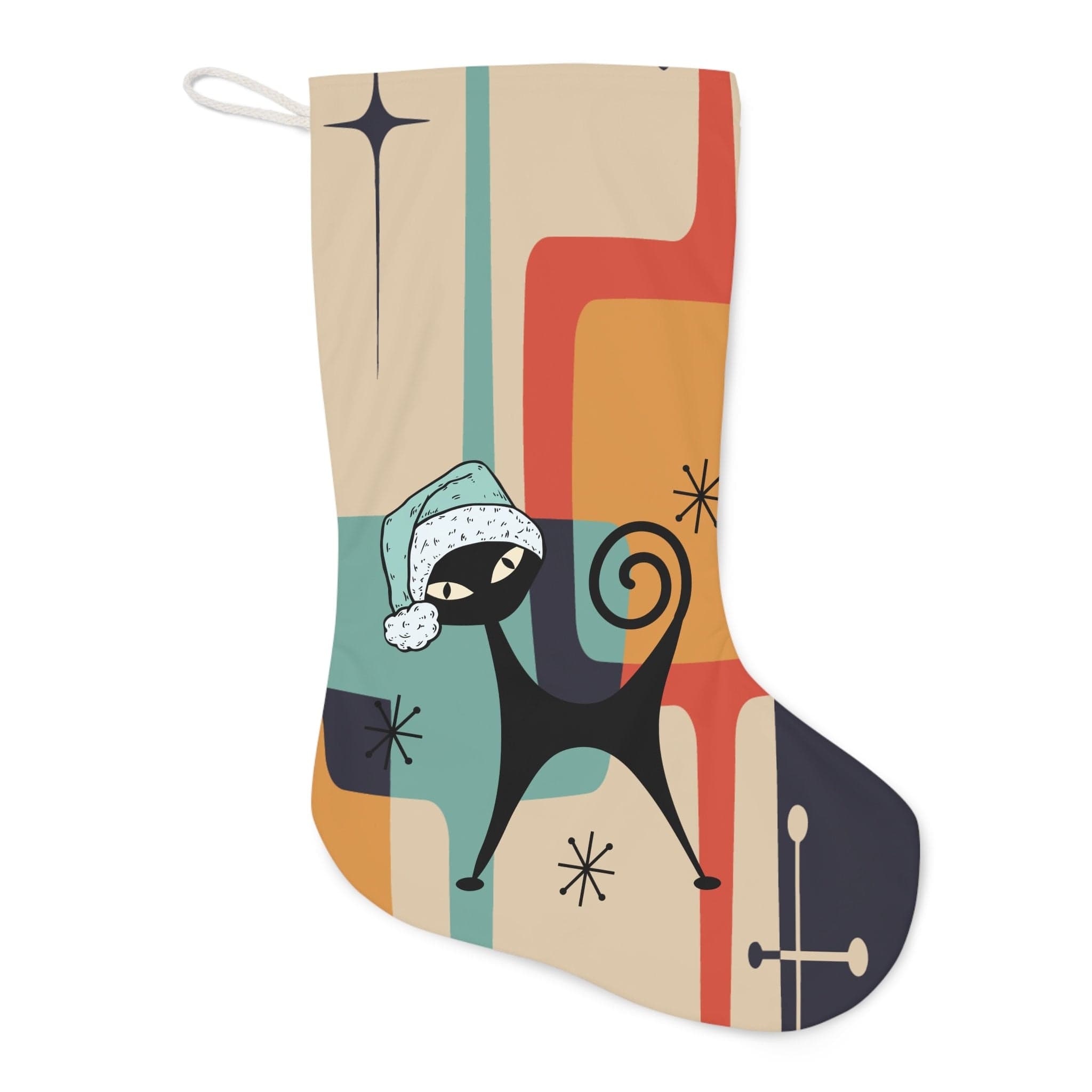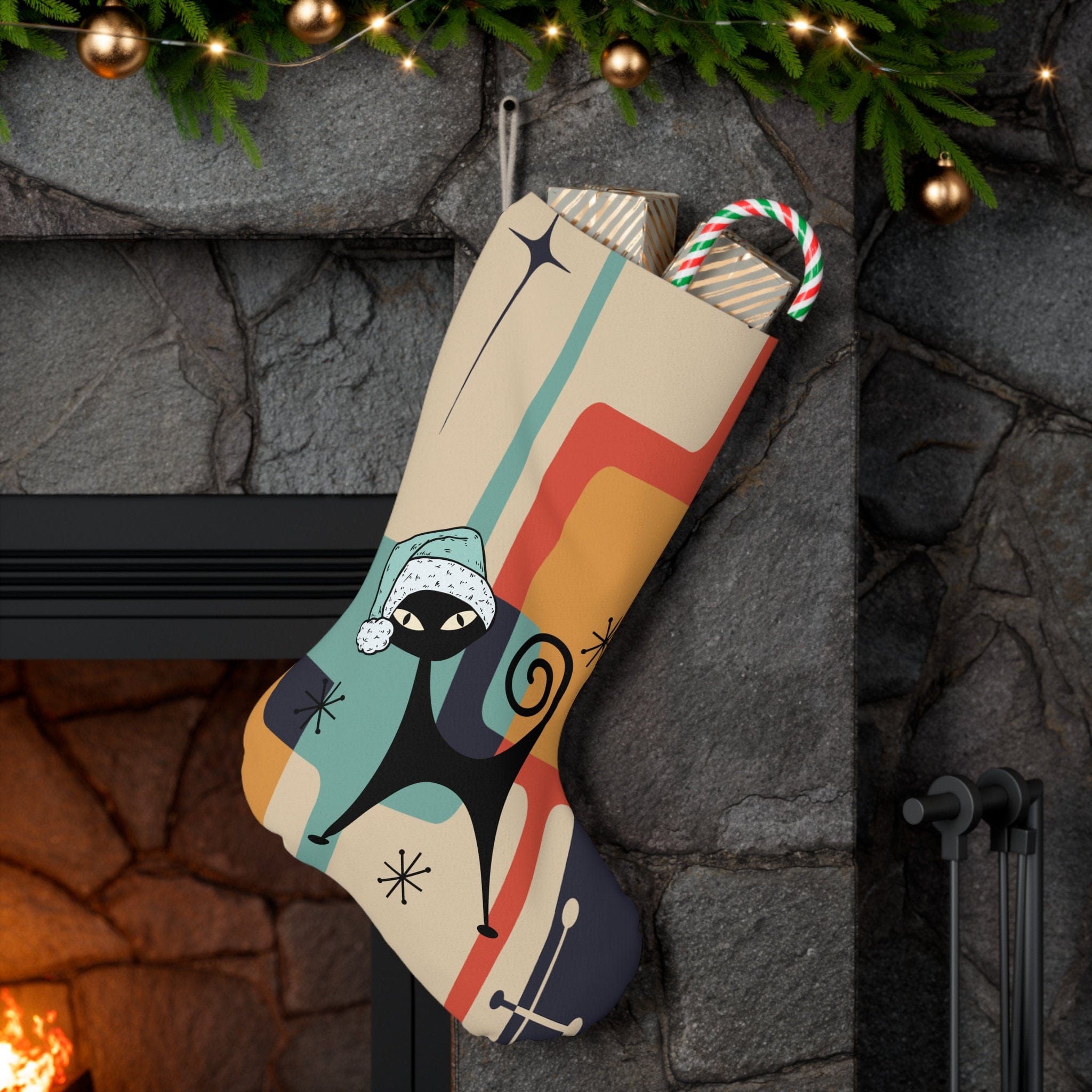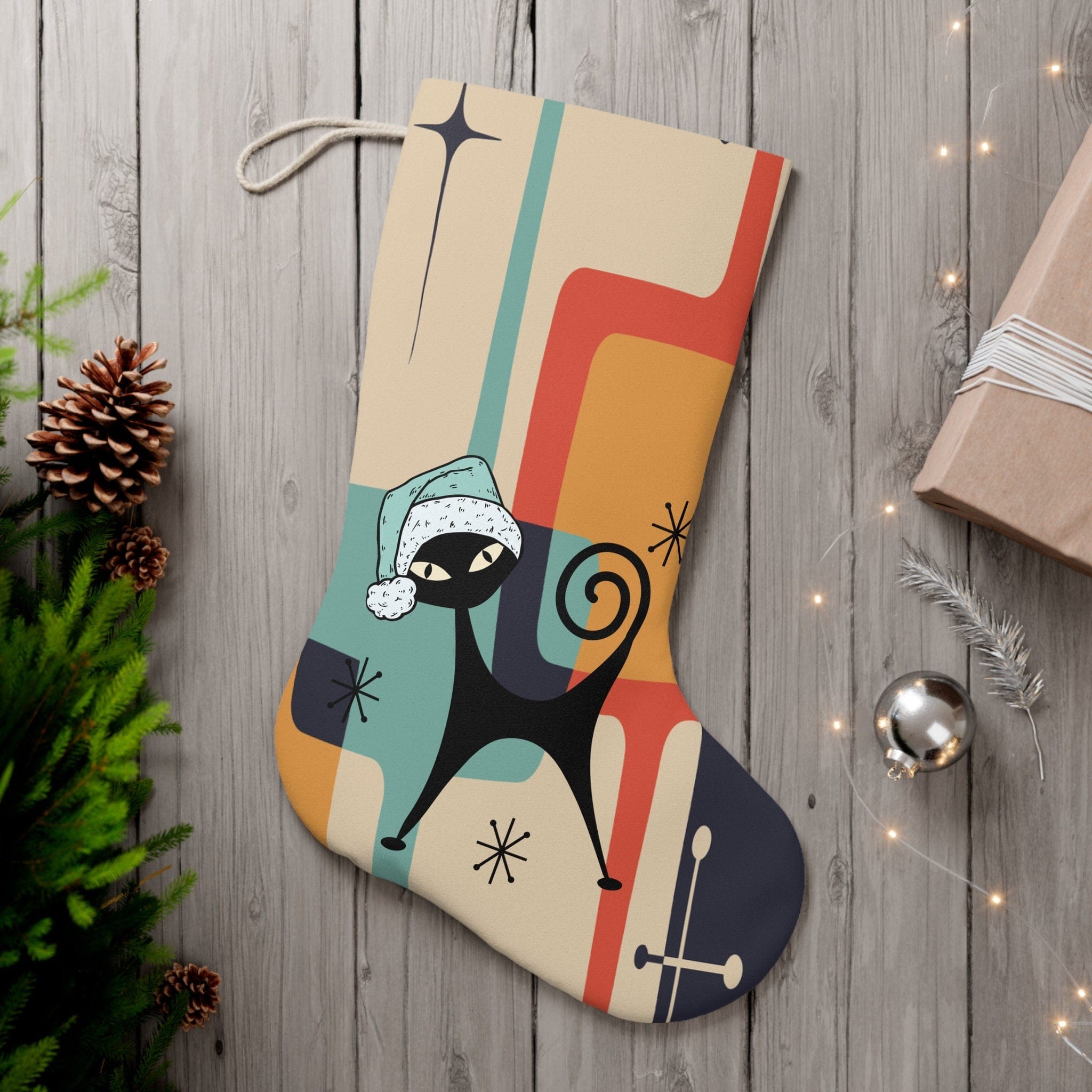 Kitschige Atomic Cat Geometrische Starburst Weihnachtsstrümpfe, Mid Century Modern Retro Weihnachtsmantel Dekoration