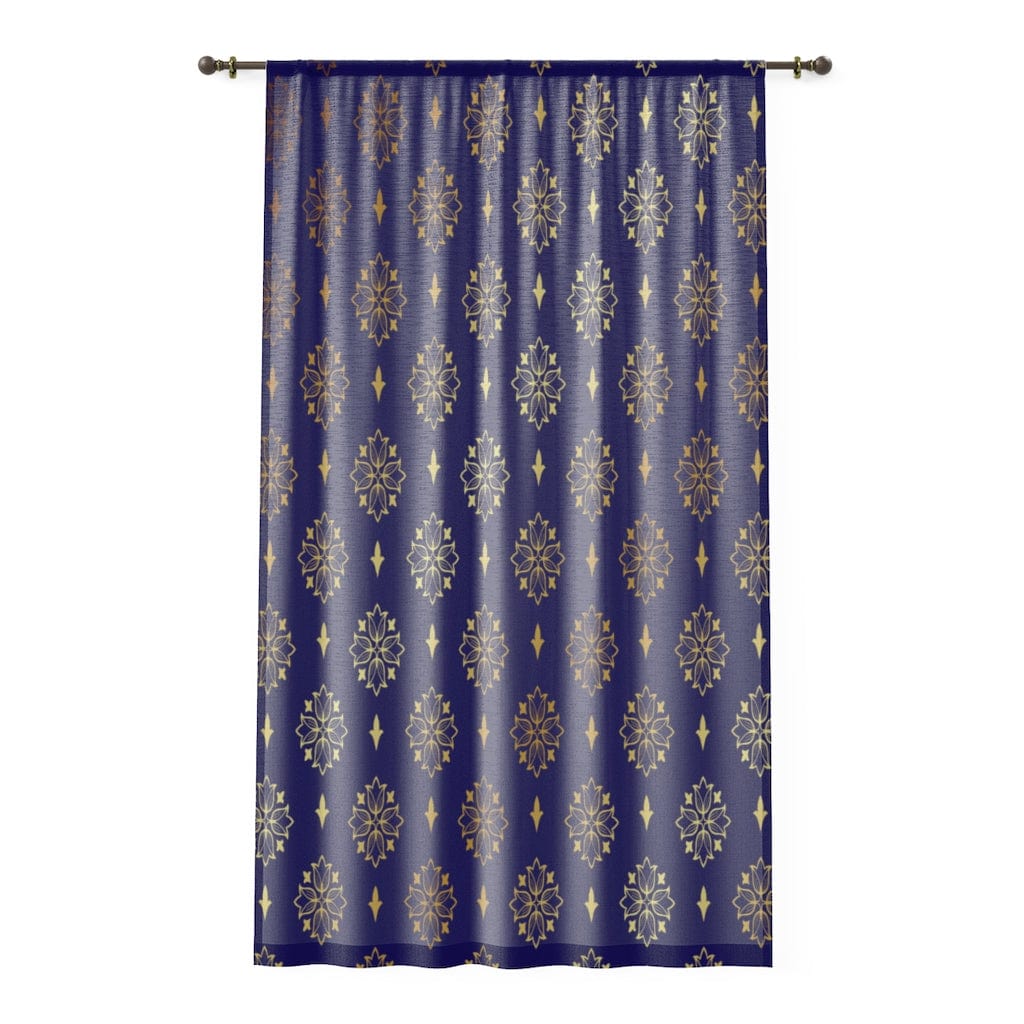 Luxuriöser transparenter Fenstervorhang mit Damast-Print in Blau und Gold, 127 x 213 cm