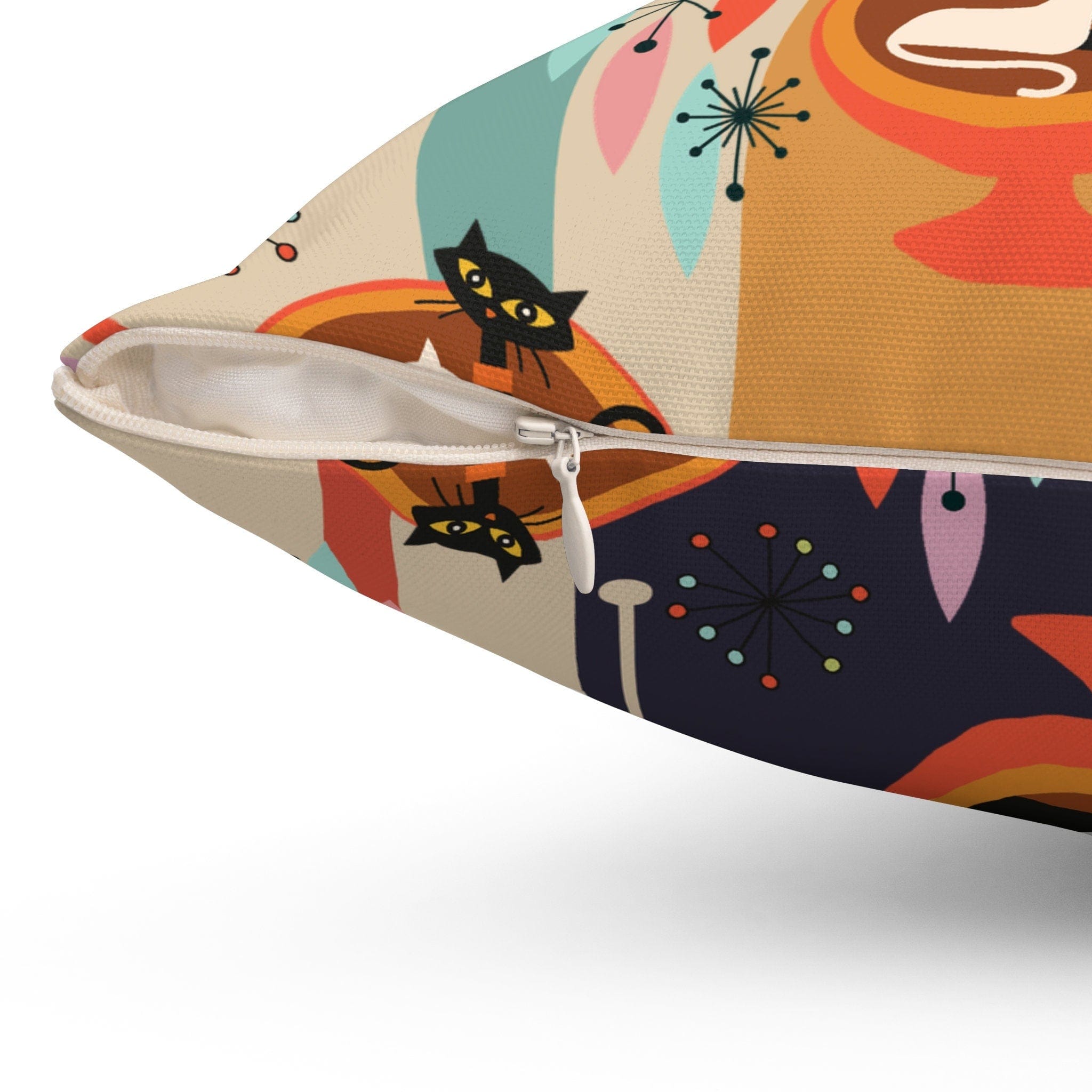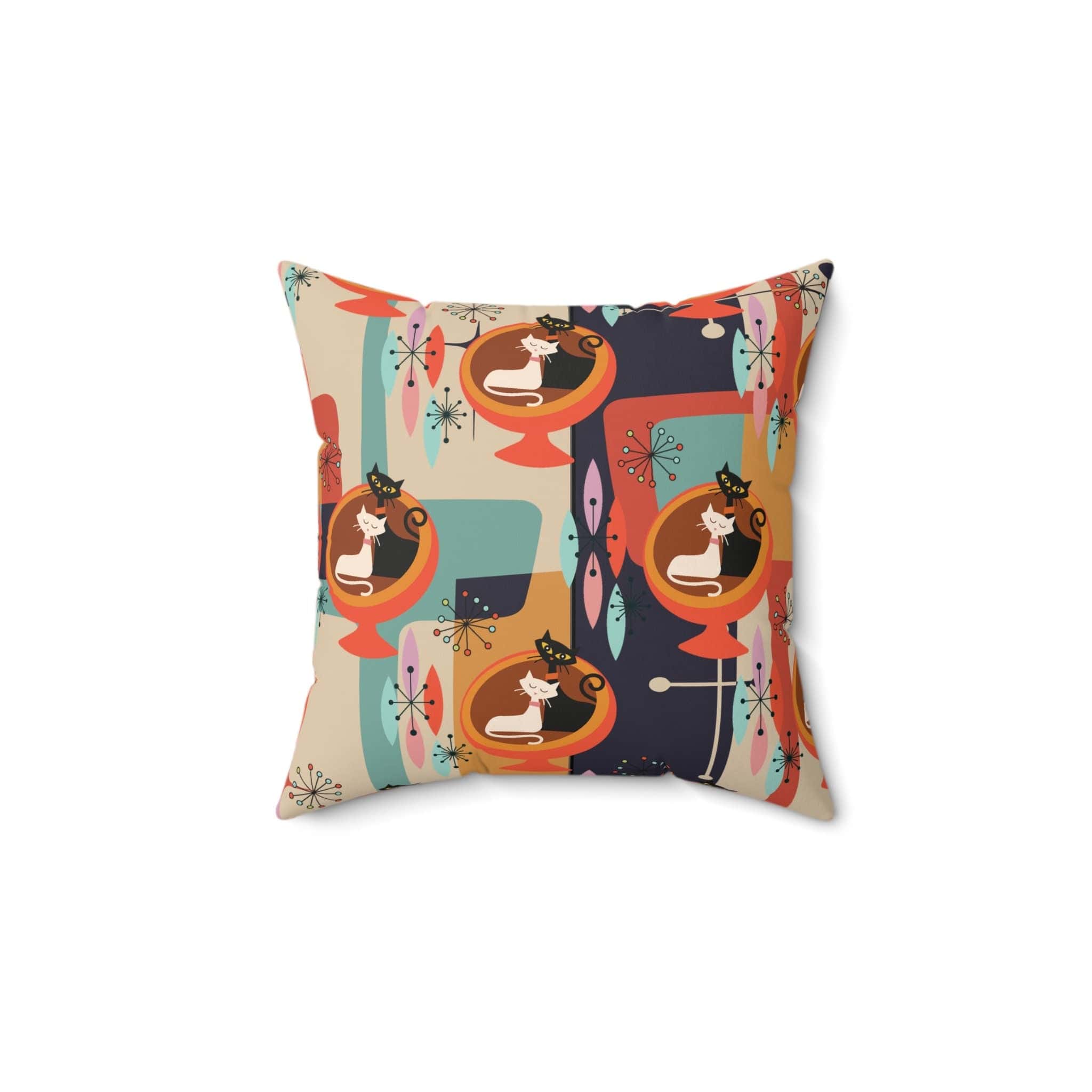 Entspannen Sie sich im Retro-Atom-Stil mit diesem Midcentury Modern-inspirierten Akzentkissen mit cooler Katzengrafik vor einem farbenfrohen Diamant-Starburst-Muster in Blaugrün, Senfgelb und Orange. Mit herausnehmbarem Kisseneinsatz für den Einsatz auf Ihrem Sofa, im Schlafzimmer oder überall dort, wo Sie einen Hauch von MCM-Flair verleihen möchten. Die Atom-Prints und leuchtenden Farben spiegeln die Retro-Ära der 1950er- und 60er-Jahre wider.