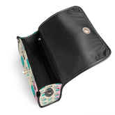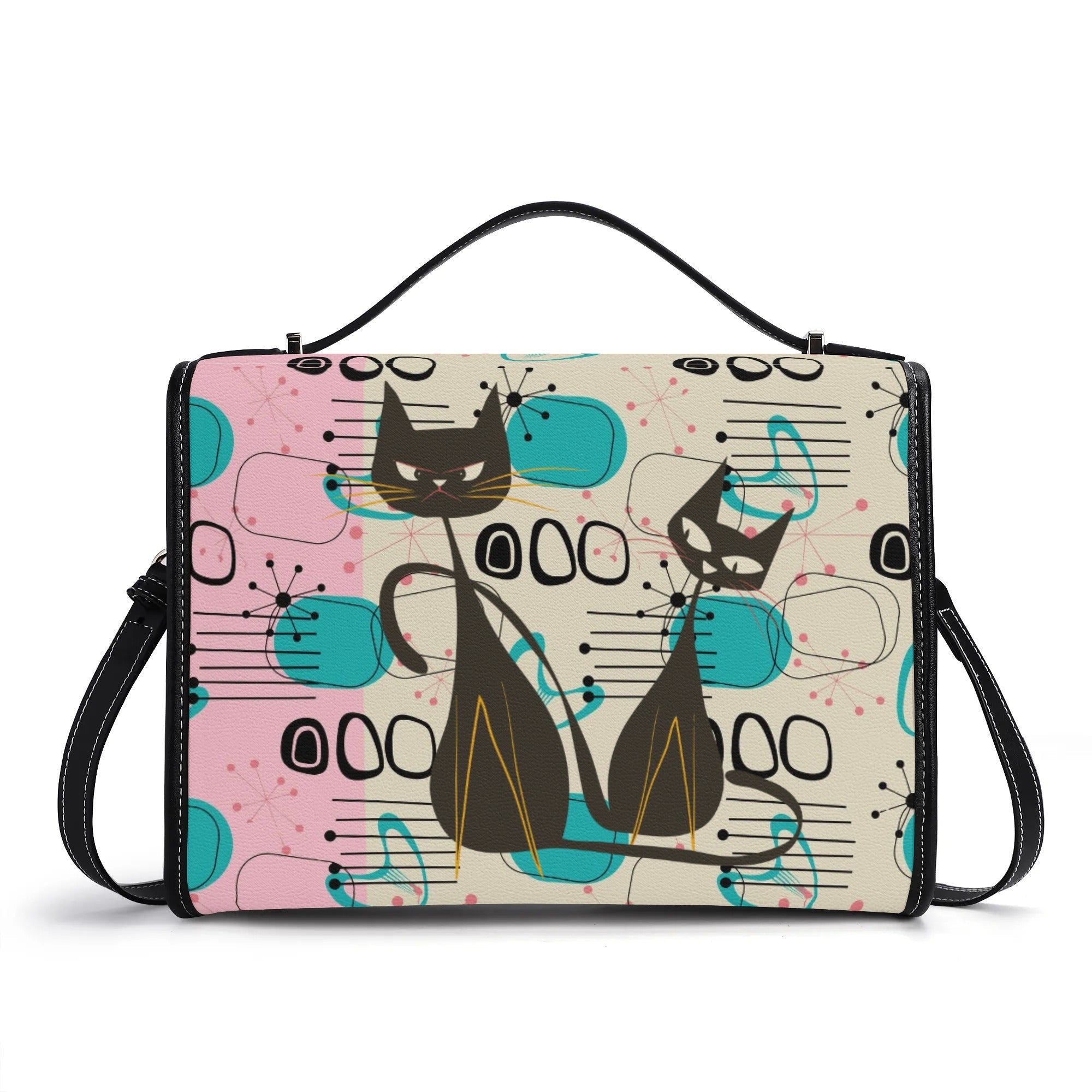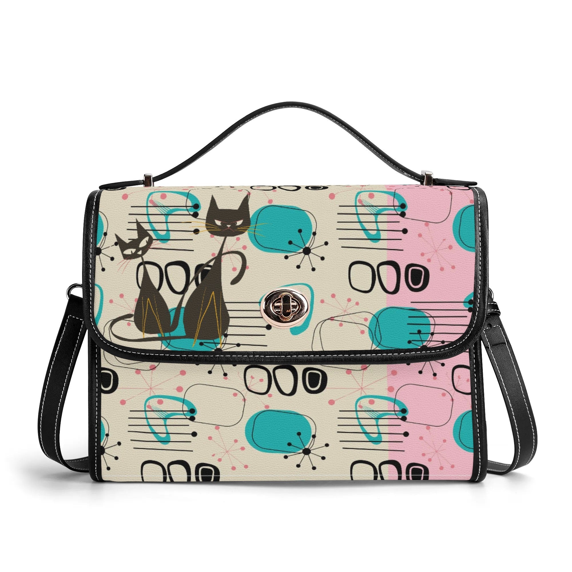 Mid Century Modern Atomic Cat Satchel, Retro Pink, Türkis und Schwarze PU-Lederhandtasche