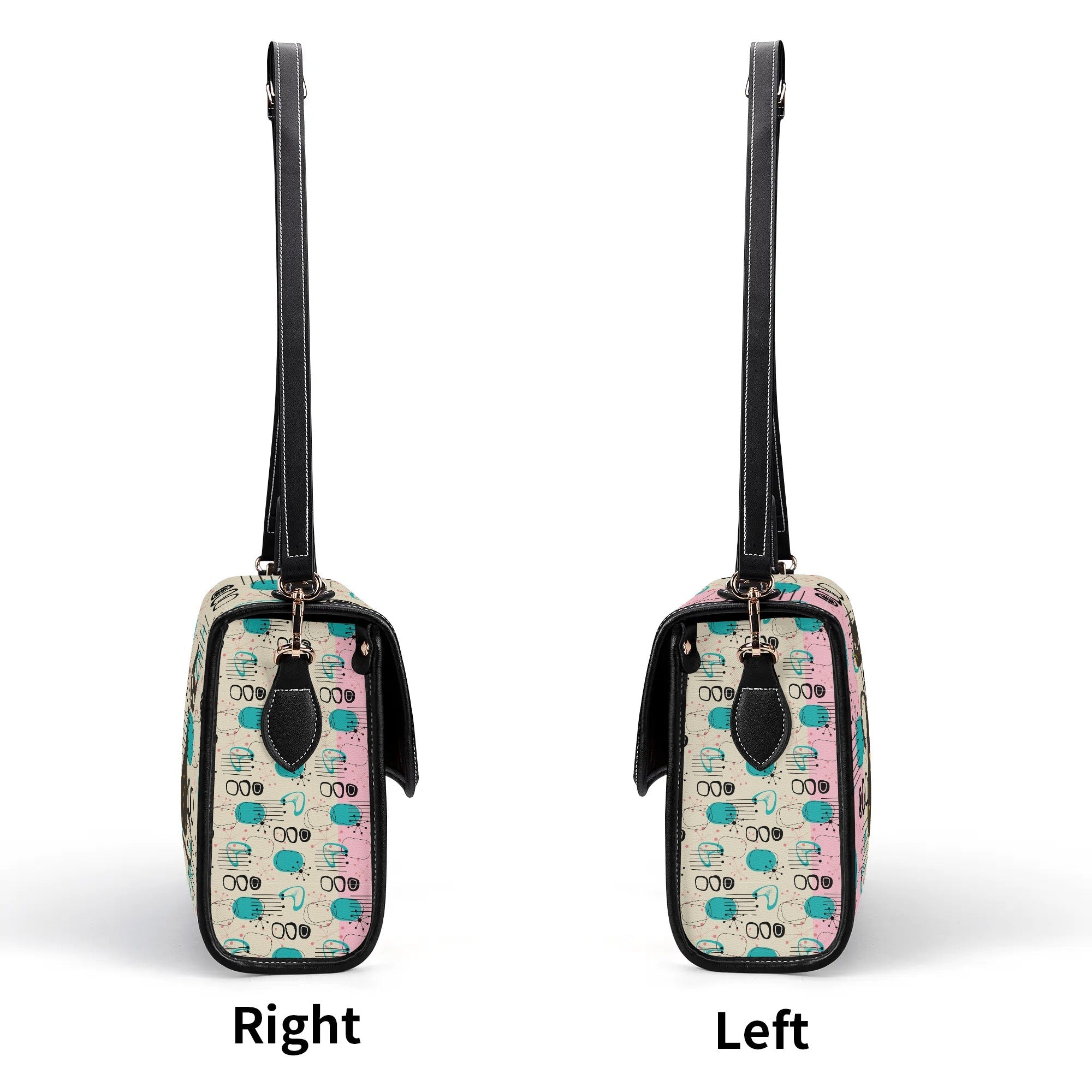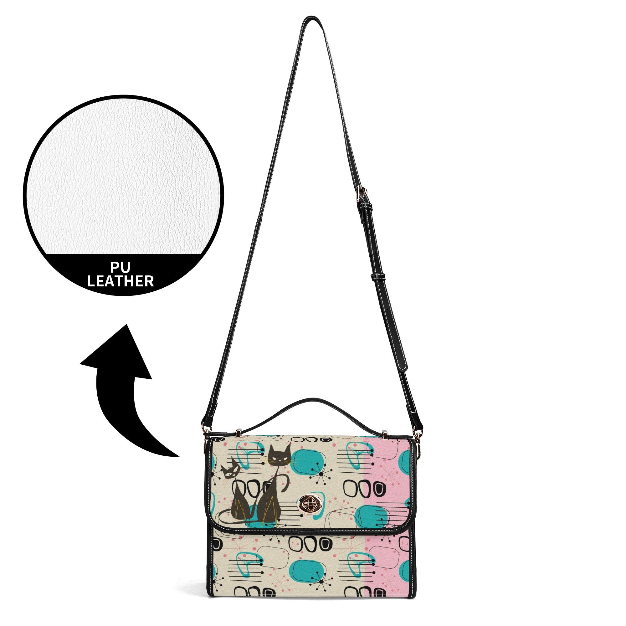 Schwingen Sie sich mit unserer Mid-Century Modern Atomic Cat Satchel Bag in die Swinging Sixties! Mit einer angesagten Mischung aus Atomic Starbursts und Bumerang-Motiven in Retro-Pink, Türkis und Schwarz bietet diese Satchel einen stilvollen, modernen Touch. Perfekt, um Ihren Outfits einen Hauch von Persönlichkeit und Farbe zu verleihen. Diese PU-Ledertasche ist nicht nur witzig, sondern auch funktional – ideal für modebewusste Menschen unterwegs.