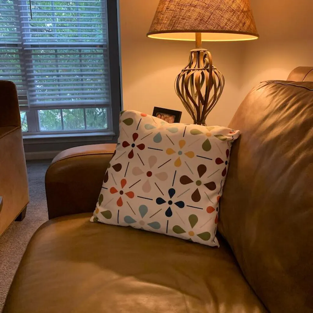 Akzentuieren Sie Ihren Raum mit unserem Mid Century Modern Retro Blumenkissen! Minimalistische Blüten in Aquablau, Olivgrün, Senfgelb und Weinrot verleihen Ihrem Wohn- oder Schlafzimmer eine schicke MCM-Atmosphäre. Kuscheln Sie sich in zeitlosen Stil!
