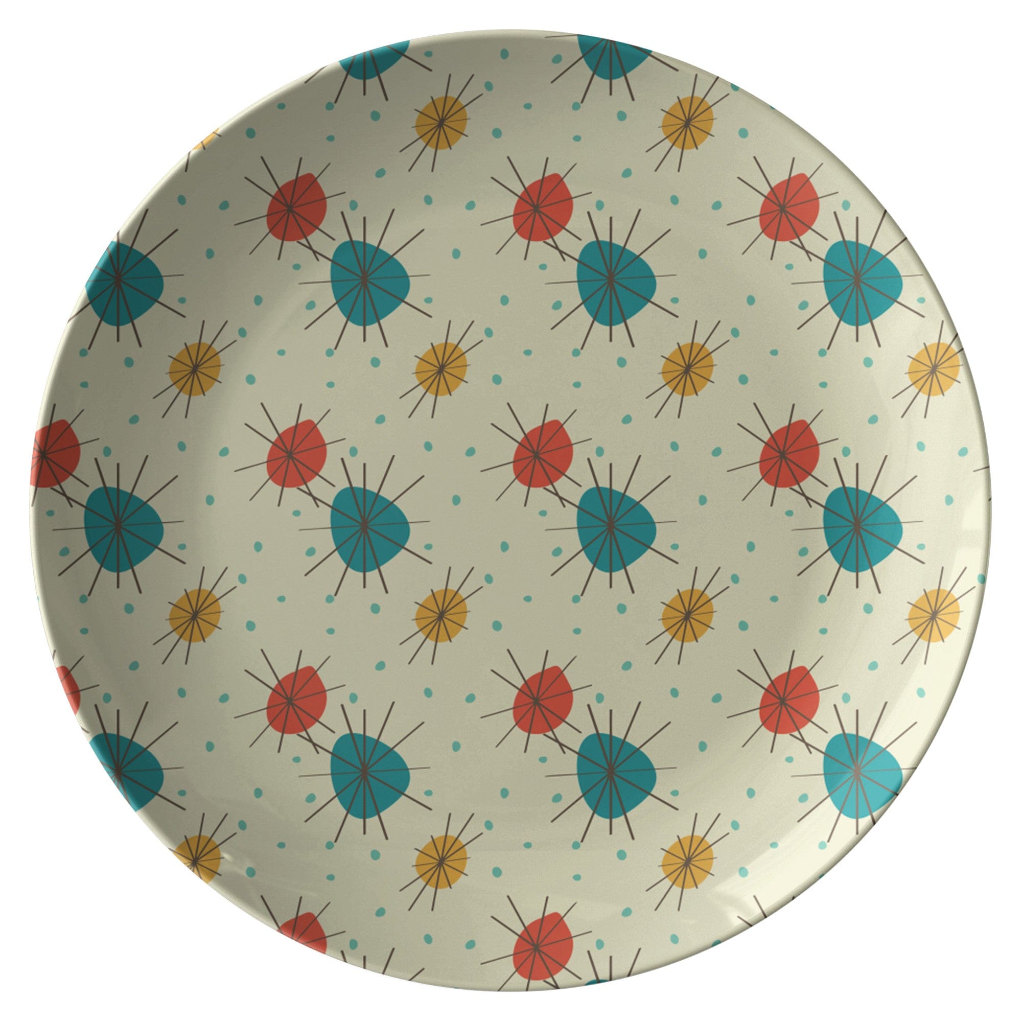 Servieren Sie Vintage-Vibes mit diesen funky Tellern im Retro-Franziskaner-Stil! Das farbenfrohe Atomic-Starburst-Muster in modernem Blaugrün, Senfgelb und Orange bringt Mid-Century-Flair auf den Tisch.