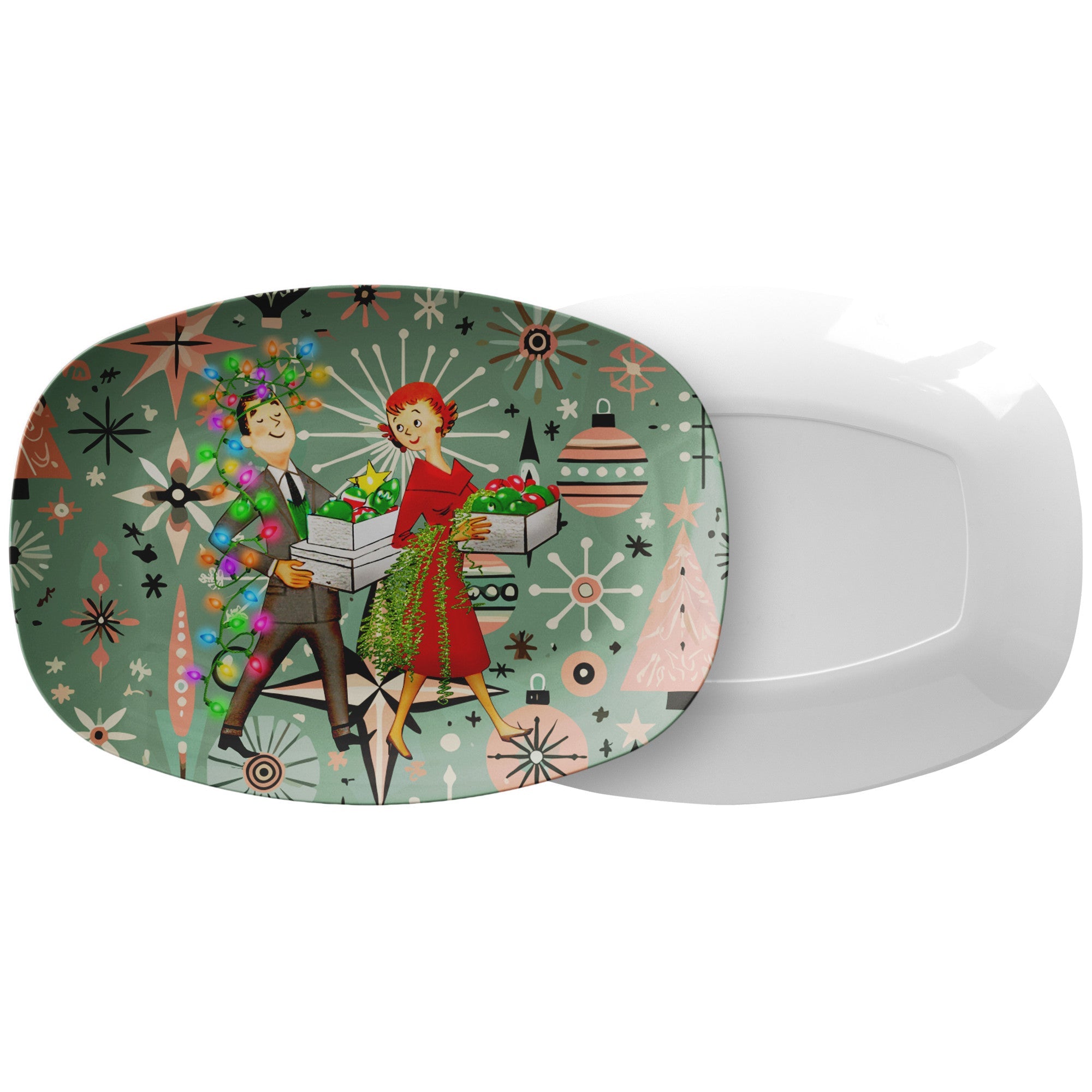 Beeindrucken Sie Ihre Gäste mit dieser Retro-Weihnachtsplatte im 50er-Jahre-Kitsch-Stil. Perfekt, um Ihren Festtagsfeiern den Charme des Mid-Century-Modern-Stils zu verleihen. Das Atomic-Starburst-Design verleiht jedem Serviertisch einen Hauch von Verspieltheit. Servieren Sie Nostalgie mit diesem lustigen und festlichen Serviergeschirr!