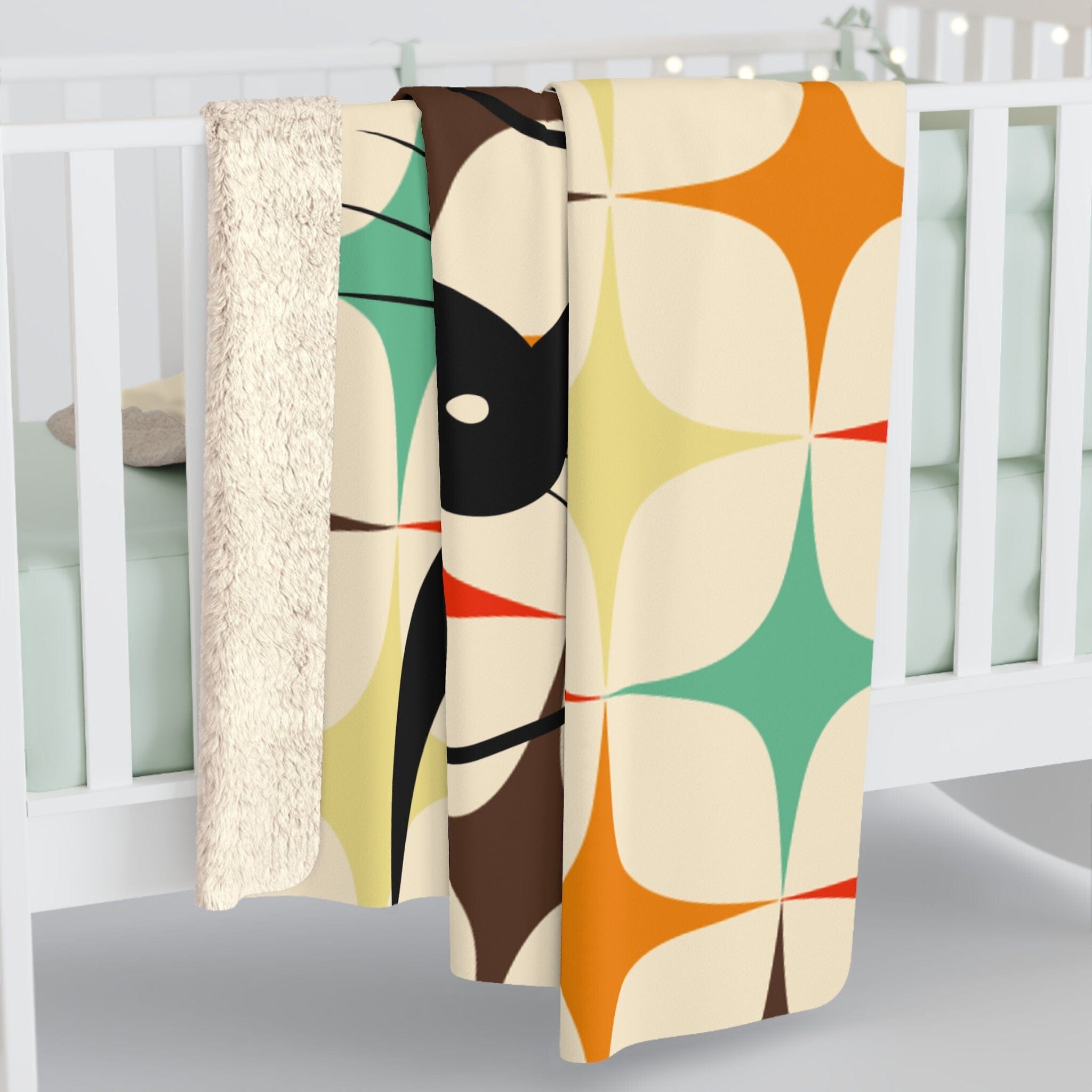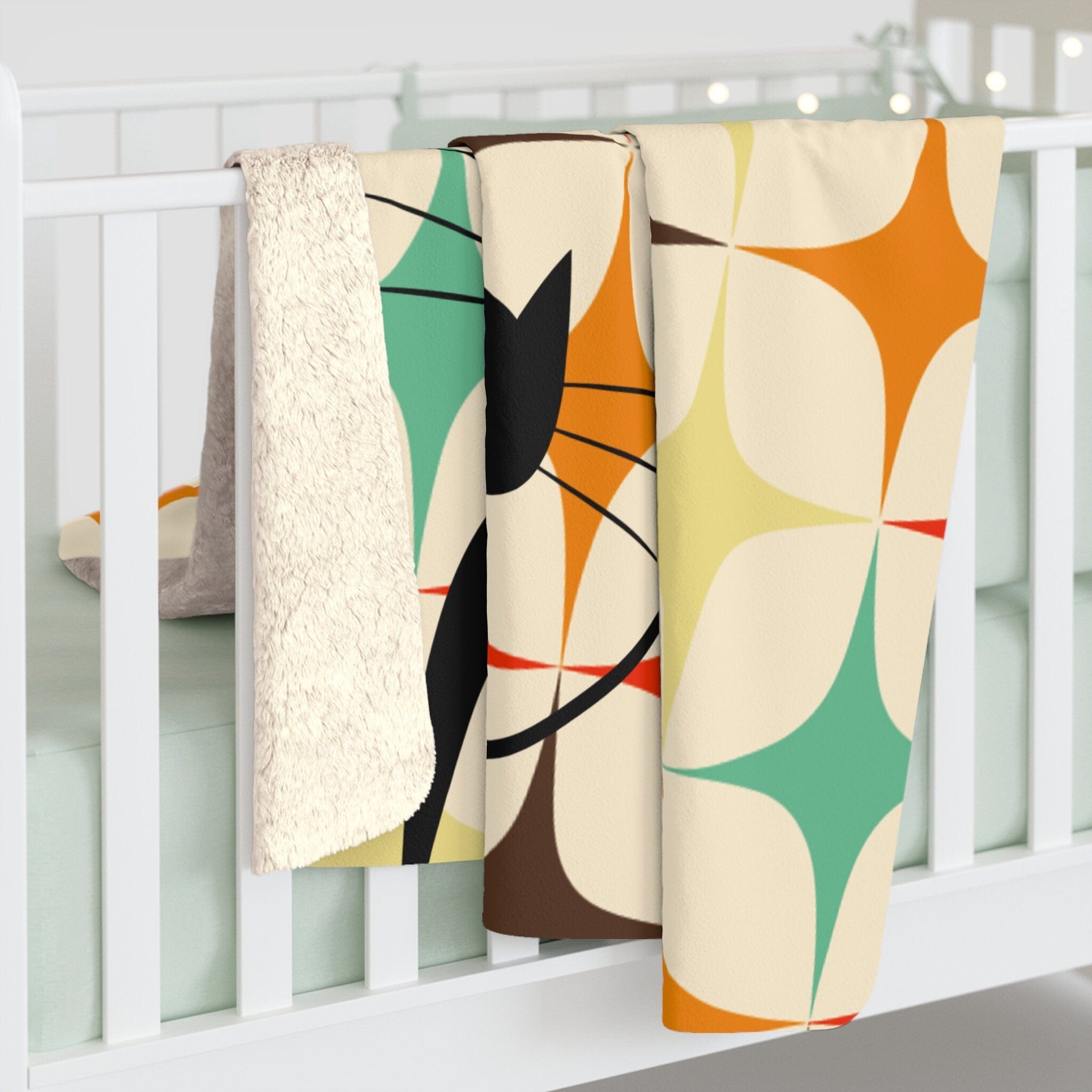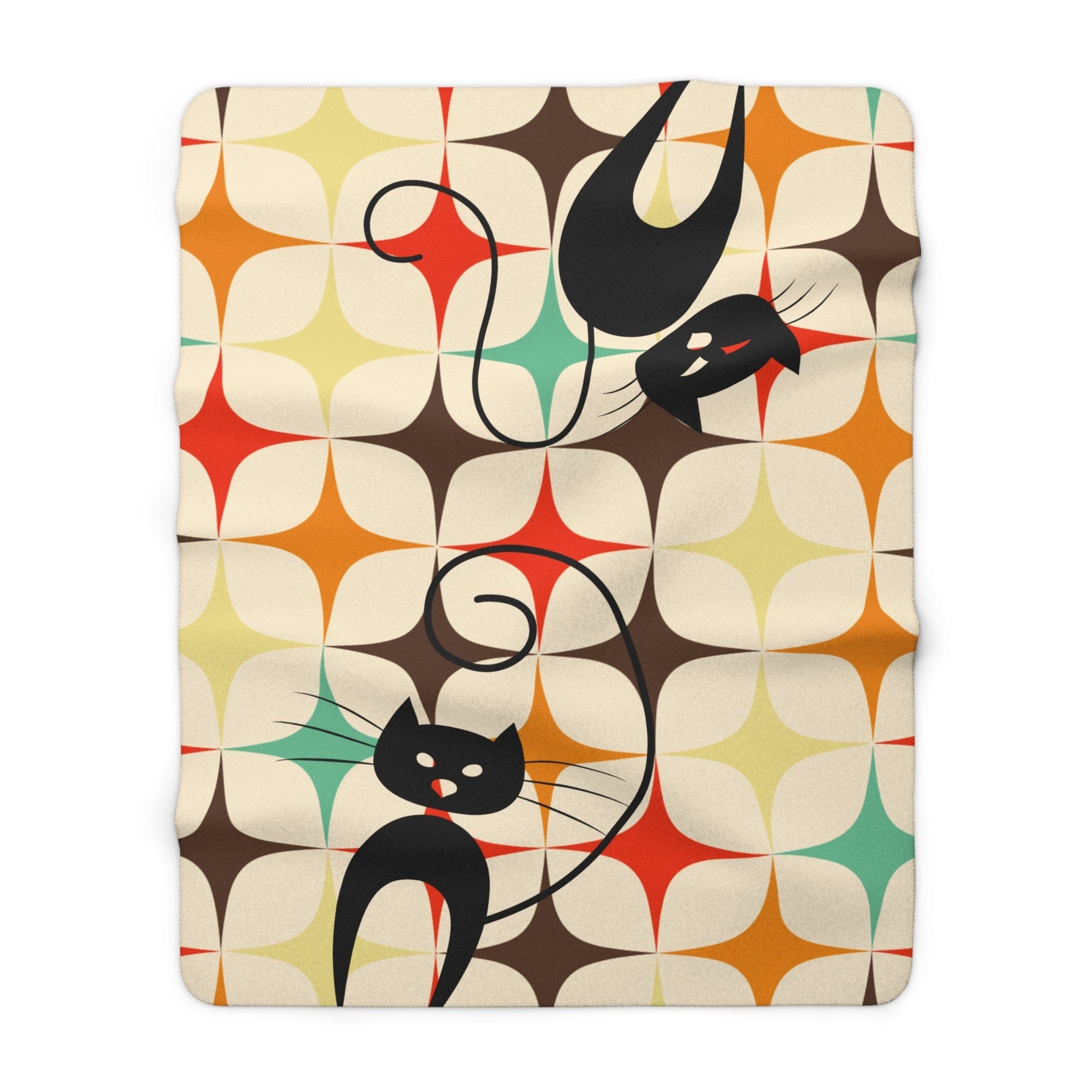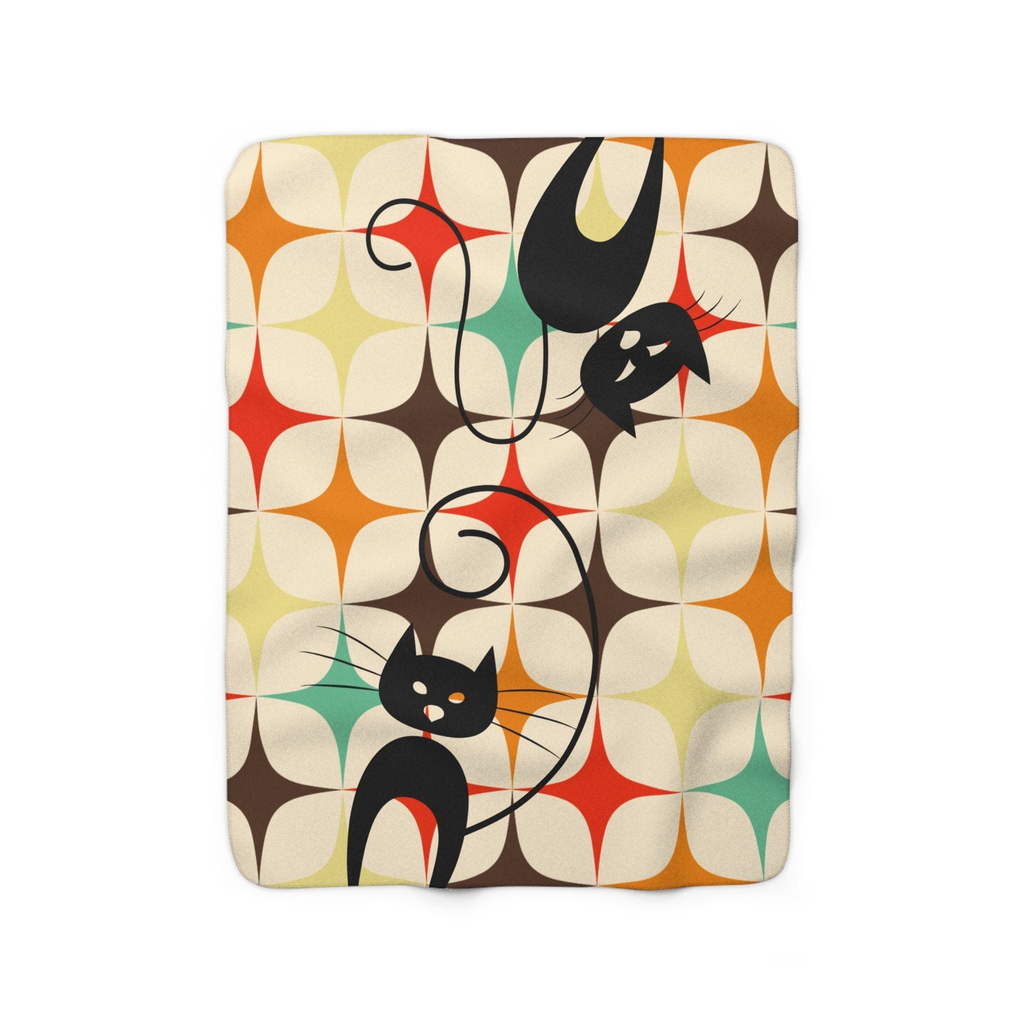 Retro-kitschige Atomic Cat Sherpa-Fleecedecke, Mid Century Modern Starburst-Überwurfdecke – 129082023