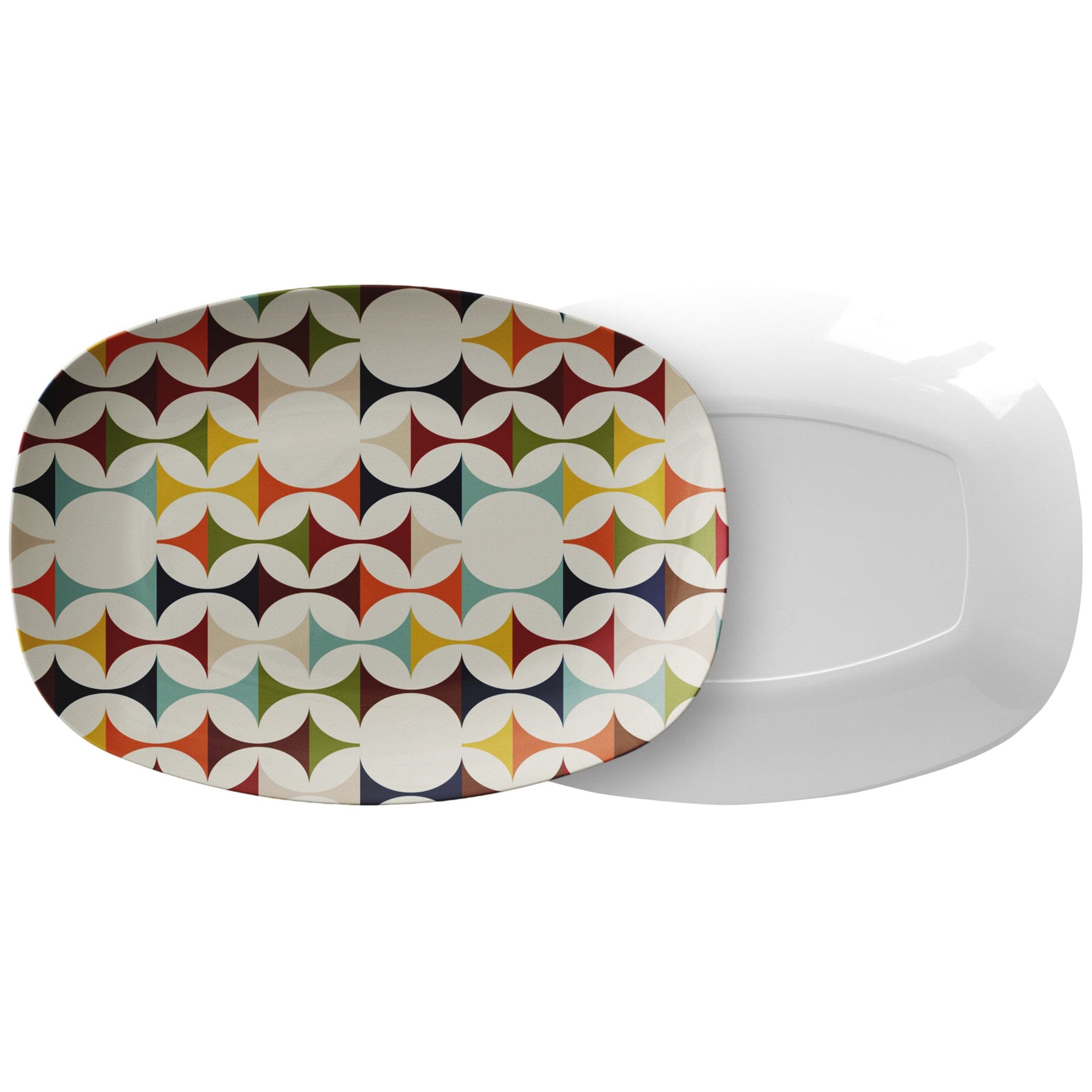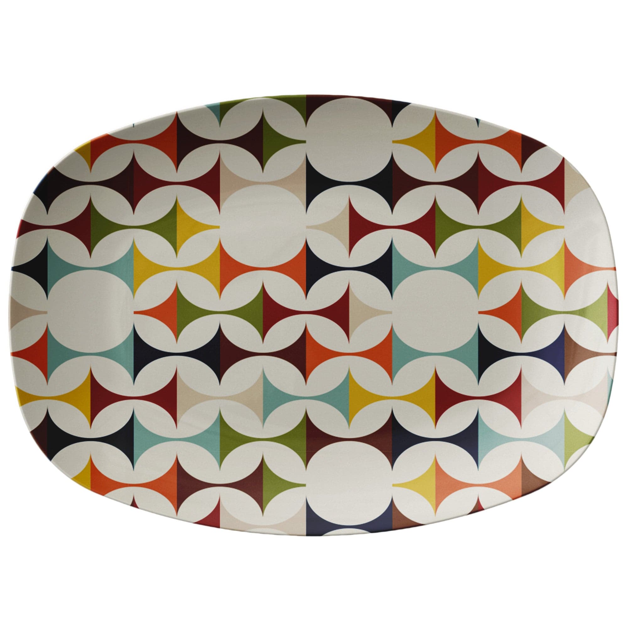 Tauchen Sie ein in die Vergangenheit mit unserer geometrischen Servierplatte im Retro-Mid-Century-Modern-Stil! Mit einer verspielten Mischung aus Creme, Blaugrün, Senfgelb und Rost verleiht diese Platte jedem Anlass eine einzigartige und originelle Note. Verleihen Sie Ihrer Tafel einen Hauch von Vintage-Charme und machen Sie diese Platte zum Mittelpunkt.