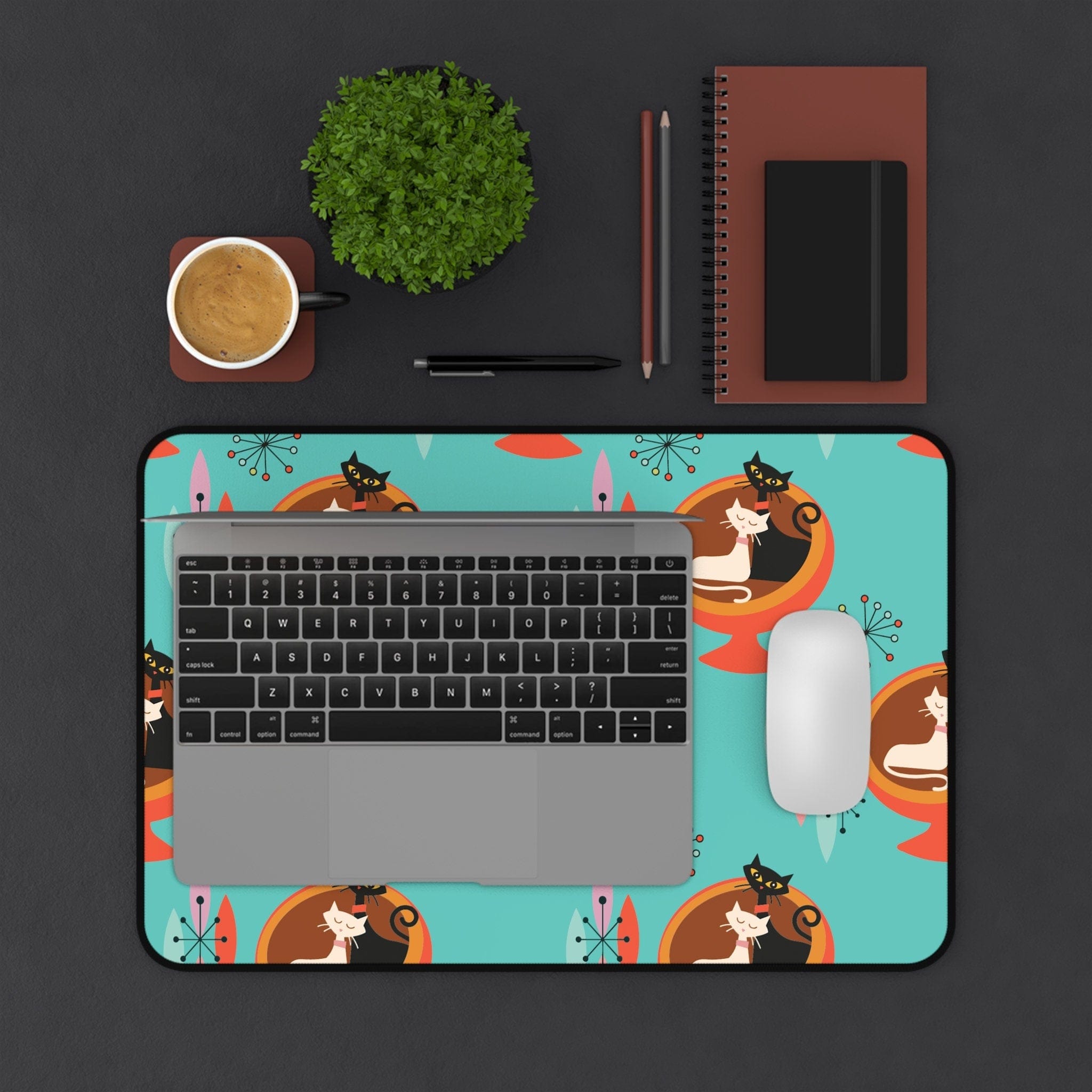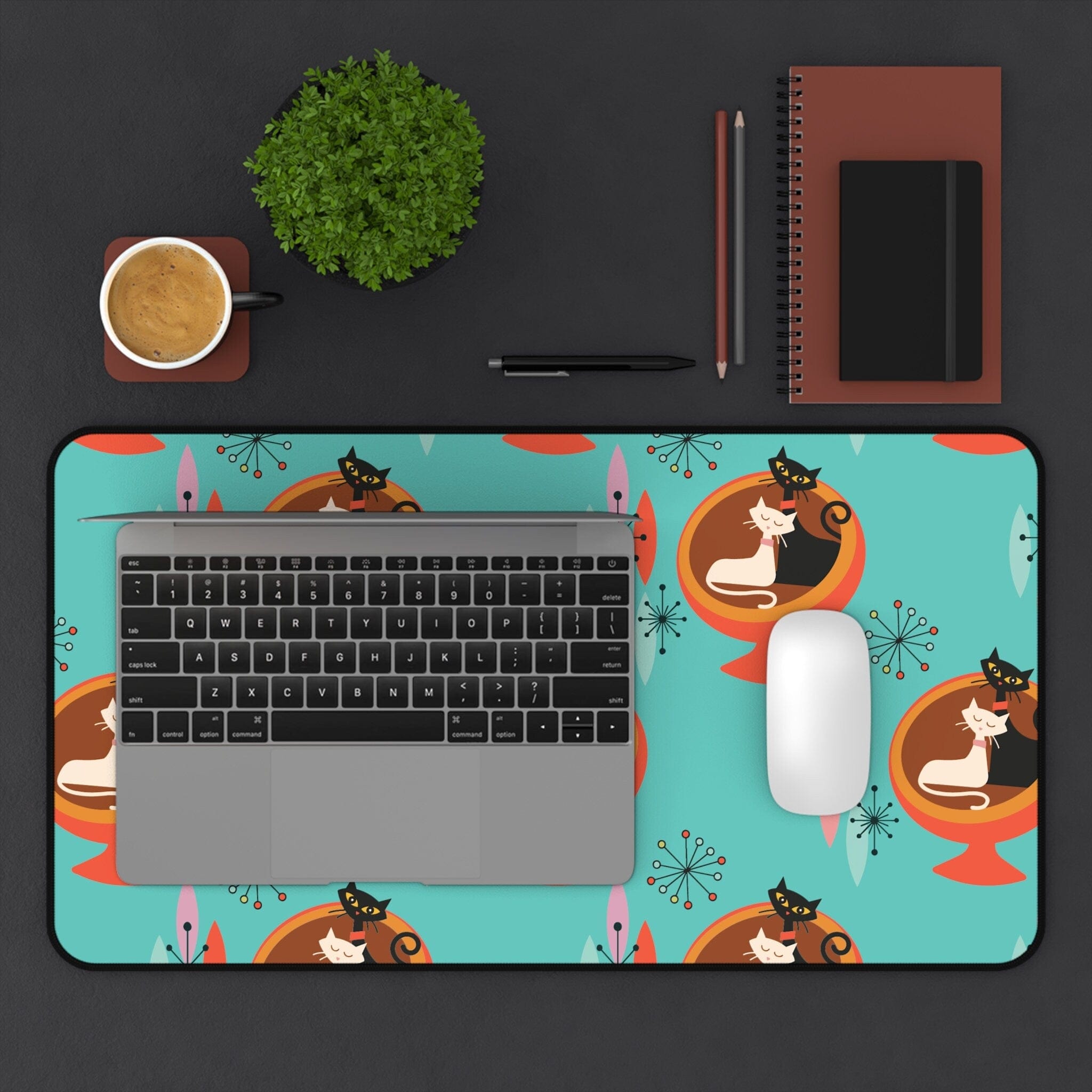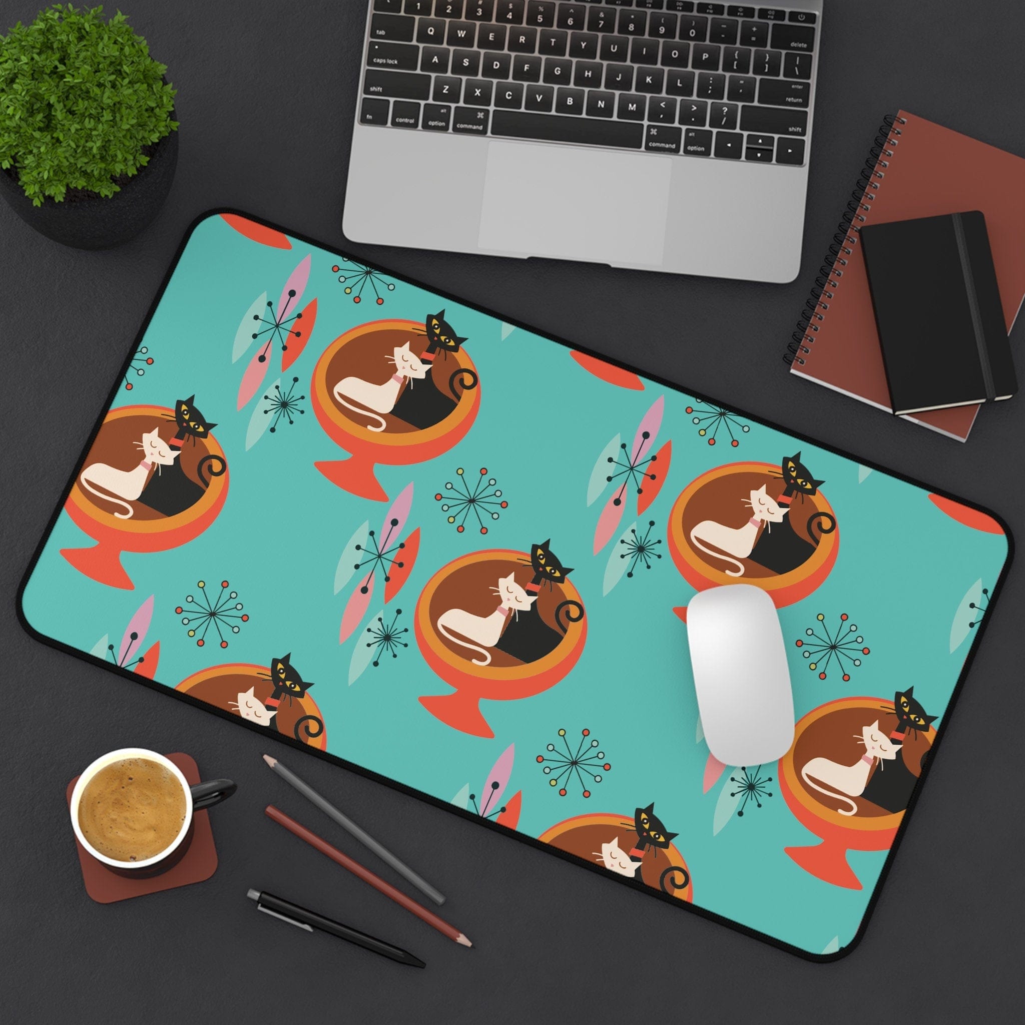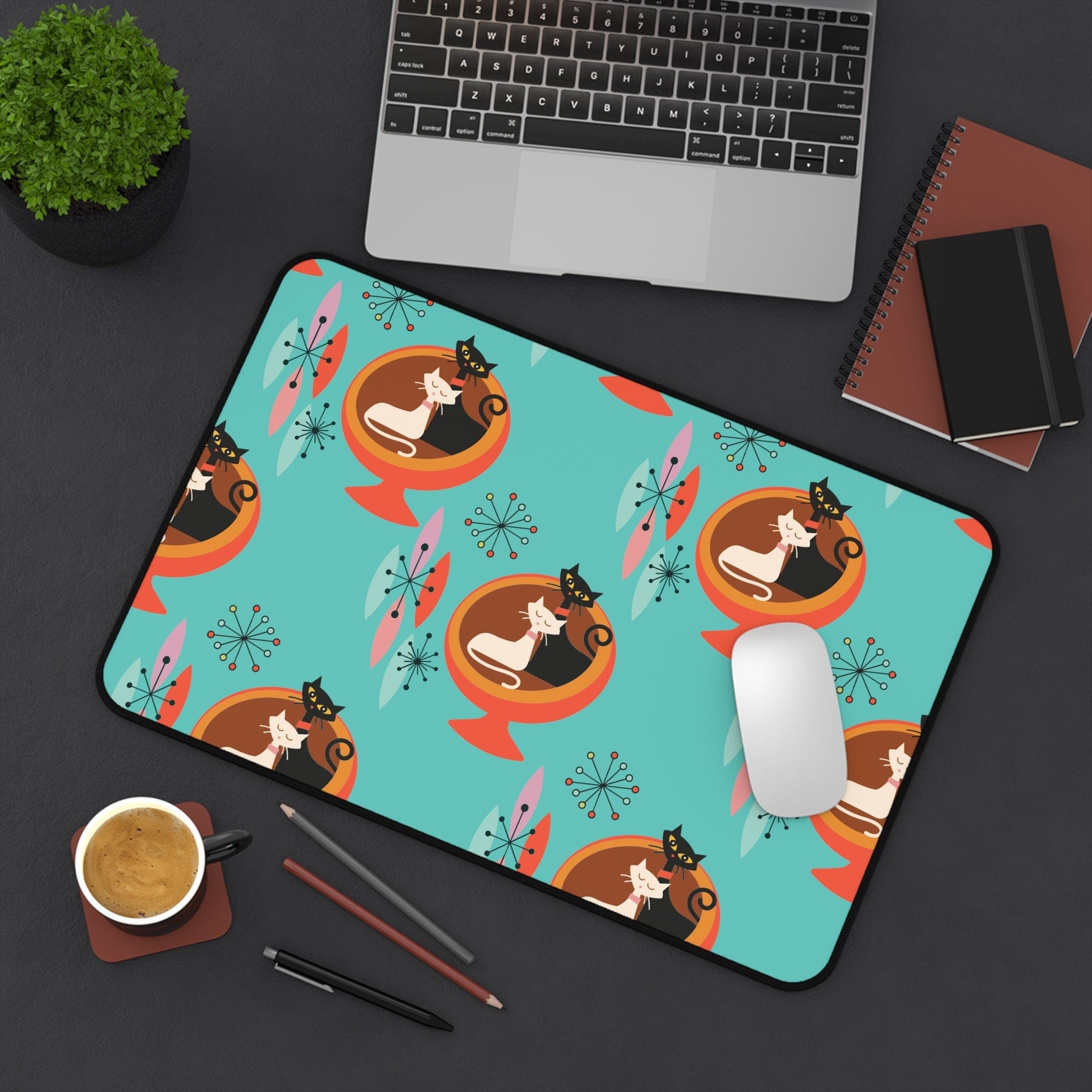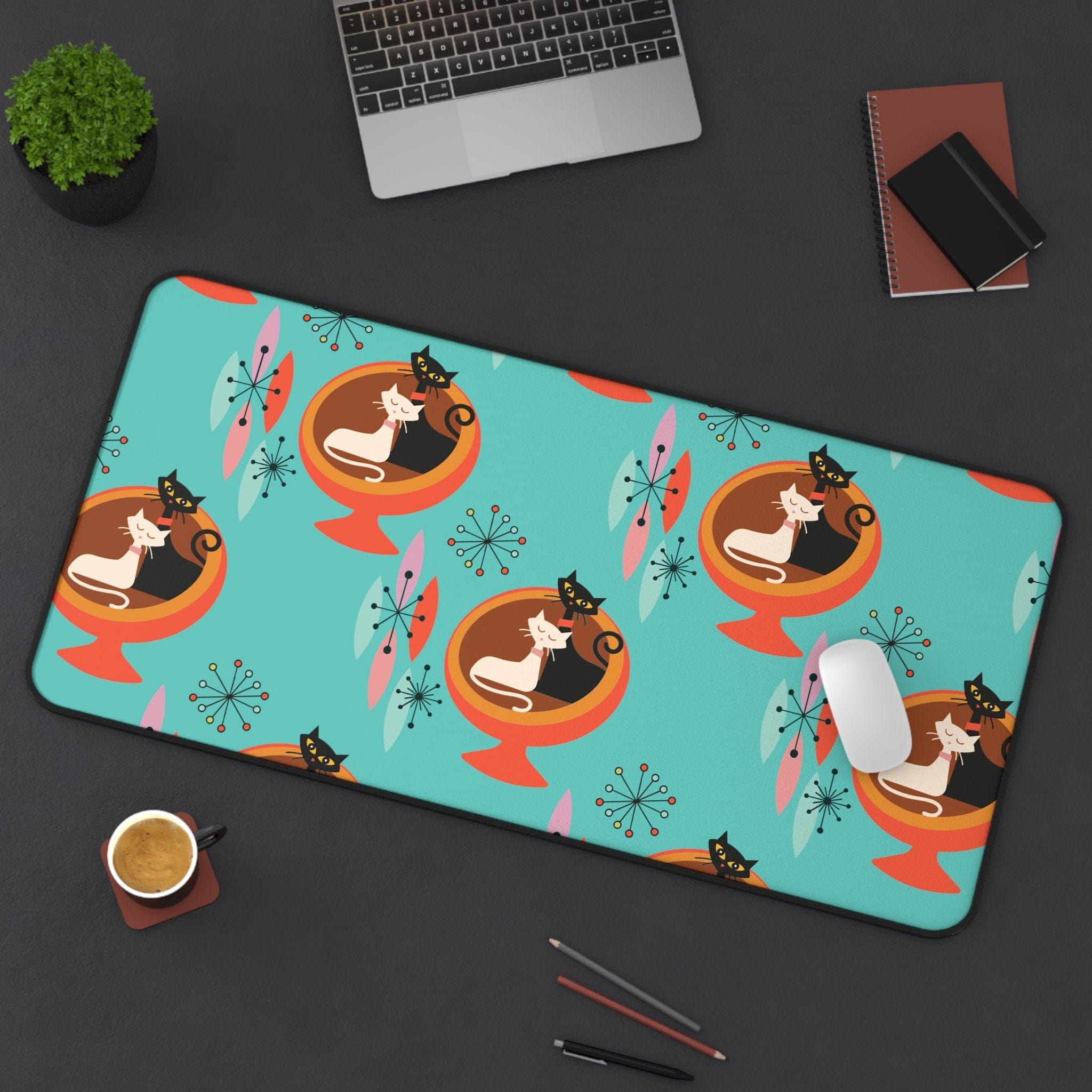 Beleben Sie Ihren Arbeitsplatz mit unserer Sputnik Atomic Cat Schreibtischmatte! Dieses Schreibtischaccessoire im Mid-Century-Modern-Stil in Aquablau und Orange ist nicht nur funktional, sondern auch eine stilvolle Hommage an die Retro-Ära. Verleihen Sie Ihrem Büro eine besondere Note mit einem Hauch von Atomic-Charme und machen Sie Ihren Schreibtisch zum Mittelpunkt der Aufmerksamkeit. Arbeiten Sie mit schnurr-semanalisiertem Stil!
