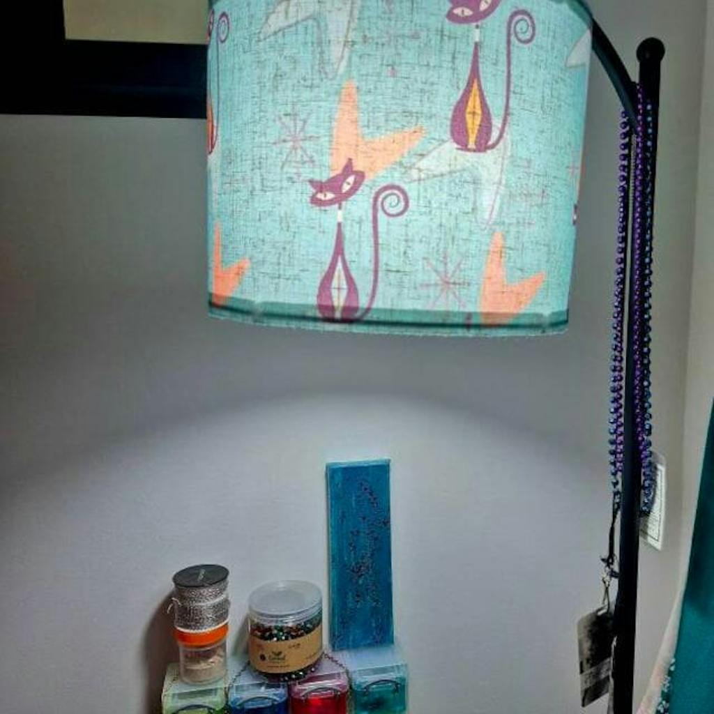 Add some mid century modern flair to your space with our Atomic Kitschy Black Cat Arc Floor Lamp! This quirky lamp features a playful boomerang starburst design and a retro 50s MCM vibe, making it a purrfect accent light for any room. (Meow!)