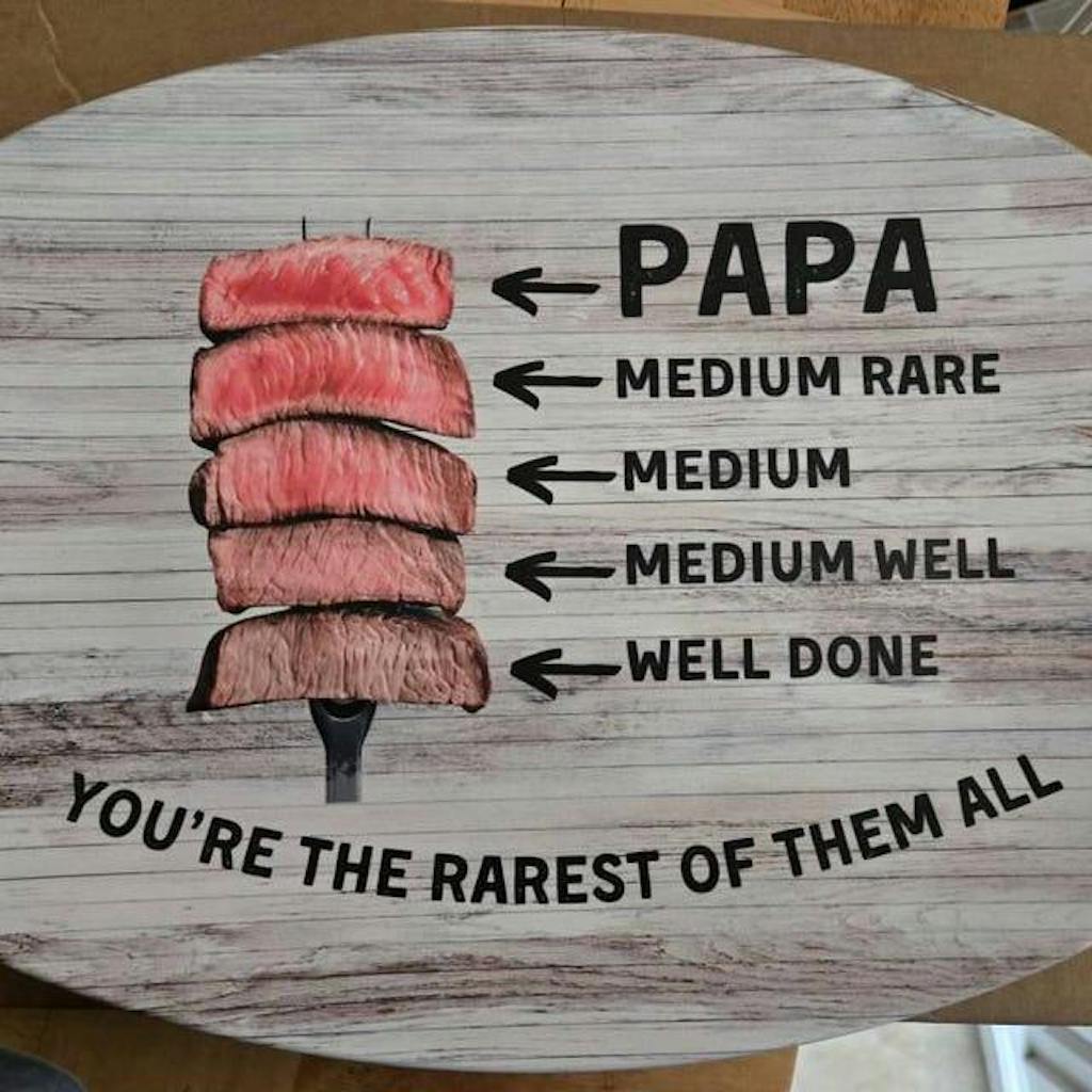 Surprise Dad this Father's Day with a unique grilling plate that celebrates his skills at the grill! Featuring a fun steak doneness chart and the heartfelt message, 'You're the rarest of them all,' it's the perfect gift for the dad who loves to barbecue.
