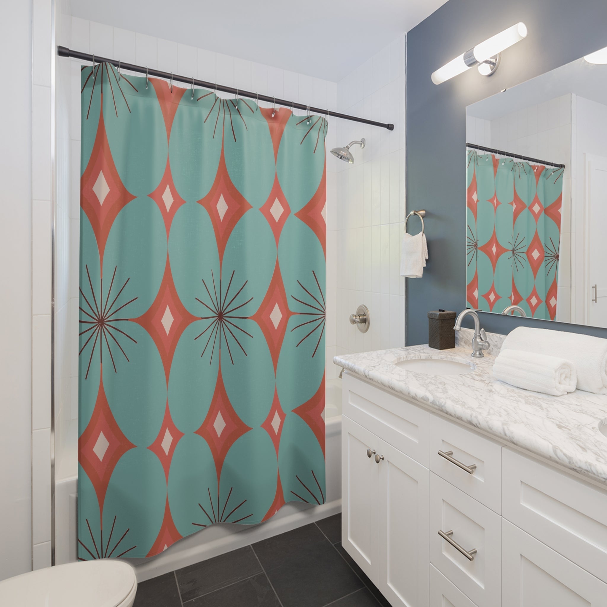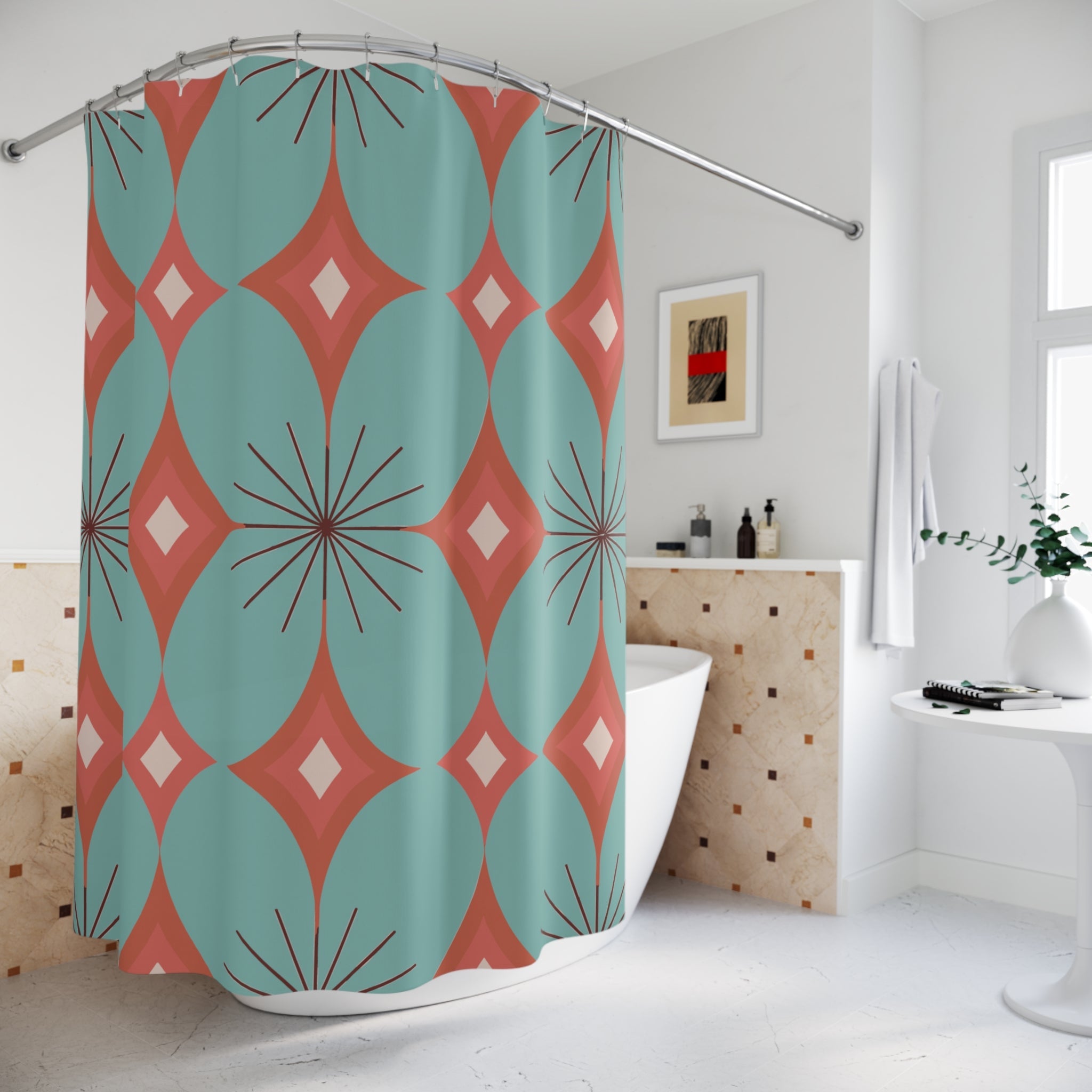 Mid Century Modern Atomic Diamond Starburst Shower Curtain, Retro Teal and Orange Bathroom Accent