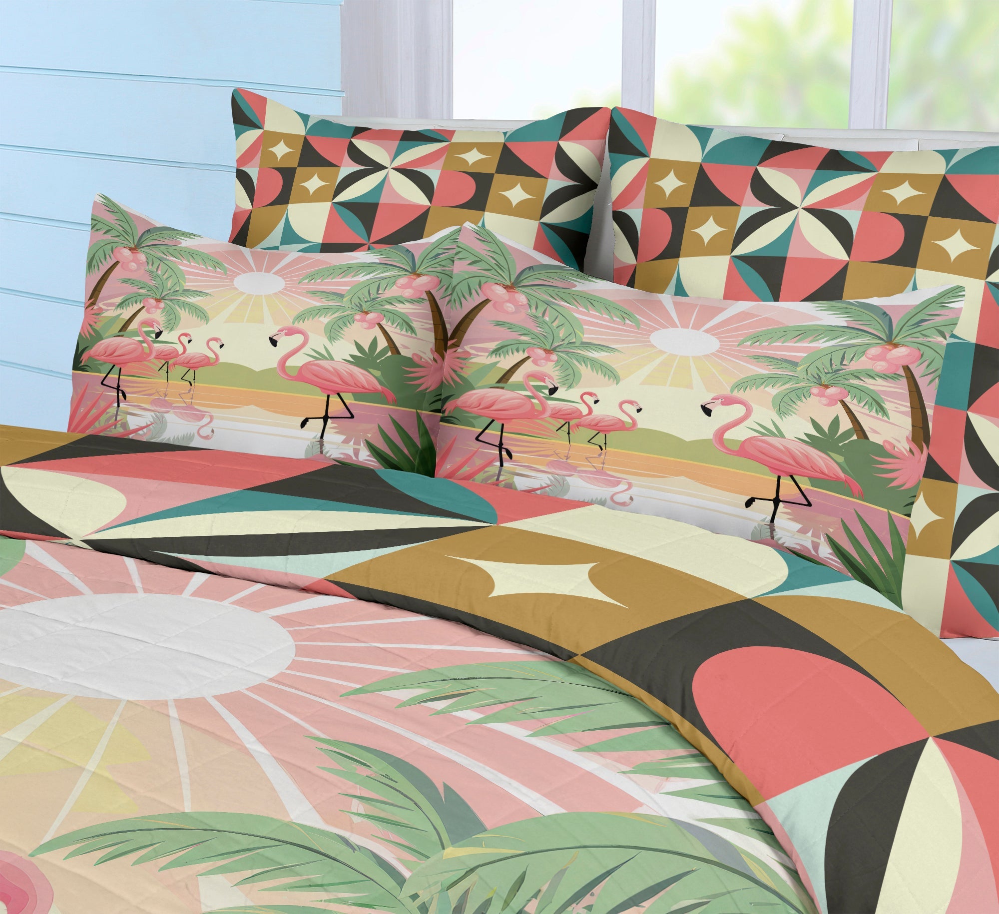 Palm Springs Cali Tropical Flamingo Sunshine Reversible Comforter Set, MCM Geometric Starburst Bedding