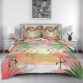 Two looks. One comforter. This reversible bedding set features a sun-soaked flamingo scene on one side and bold mid-century modern geometrics on the other. Made to order and printed edge-to-edge on both sides, it delivers retro Palm Springs energy with a flip of the covers.