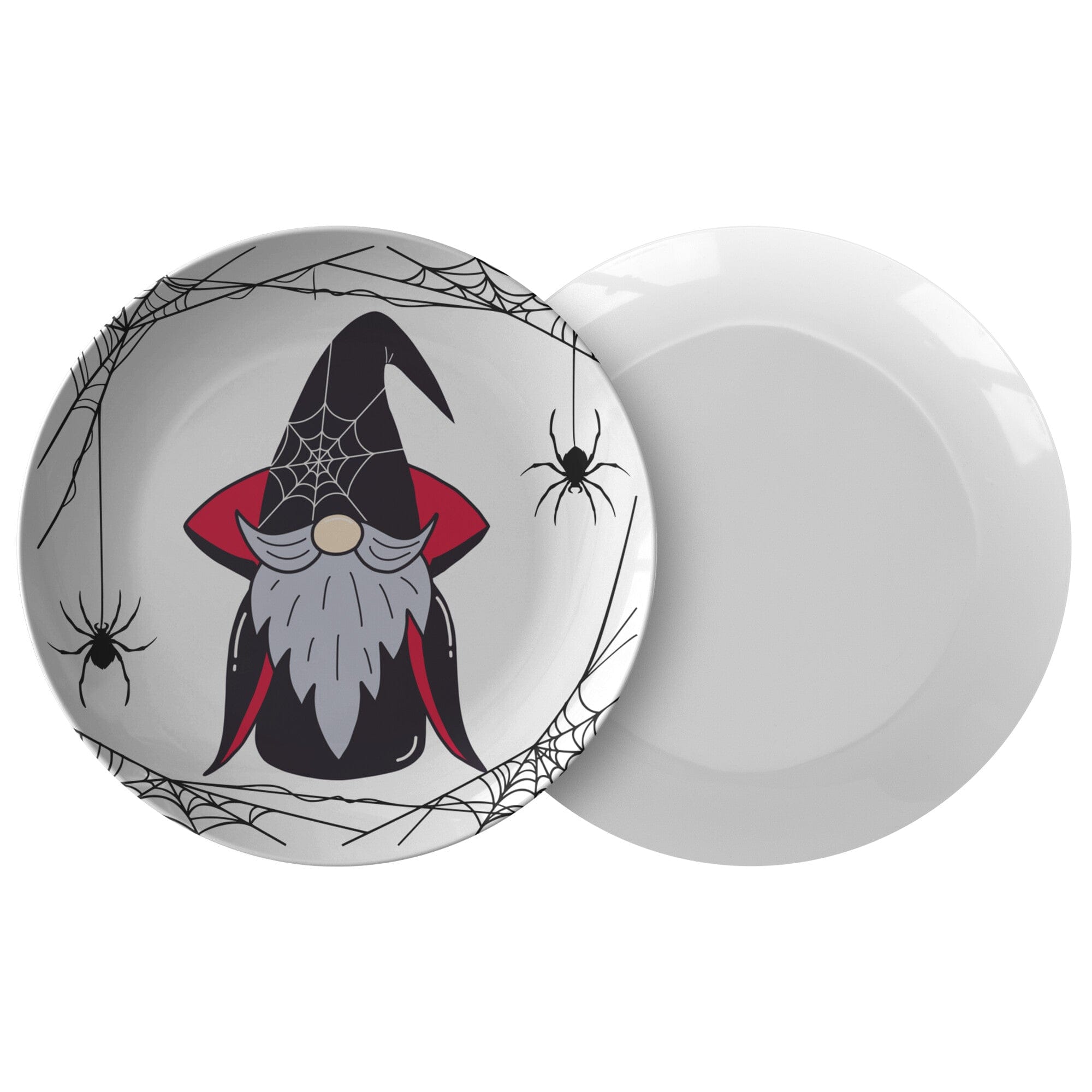 Start the spooky season off the right way with this Vampire Gnome Halloween Plate. Serve up your favorite Halloween treats on this festive plate that features a vampire gnome and a cobweb pattern - what more could you want?! Perfect for any Halloween gathering, this plate will have you screaming, "Happy Halloween!"