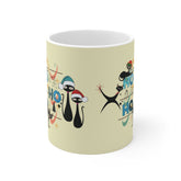 Send good vibes with the grooviest Christmas mug around! This boss kitschy cup features way out feline friends dressed to the nines for the holidays. The totally atomic design screams happy holidays with midcentury style. A solid gift for any hip cat lover. This fab 11oz mug will sleigh them with joy! Ditch humdrum drinkware and gift big fun vibes with this gnarly cup. Give the gift of solid gold holiday cheer!