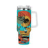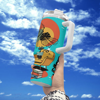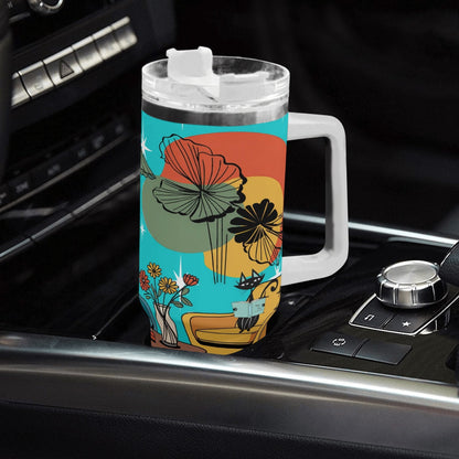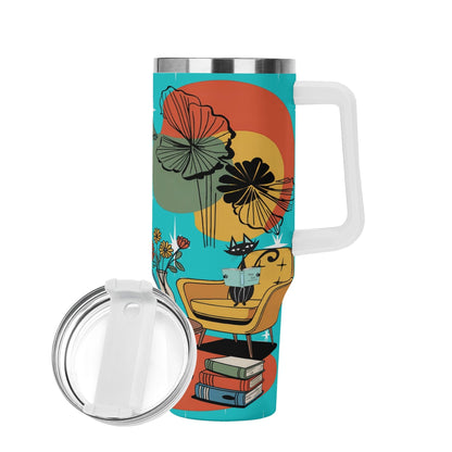 This stainless steel travel mug features Atomic Cat deep in a good read, lounging on a mustard chair beside stacks of books and florals. Surrounded by layered abstract shapes, retro furniture, and mod starbursts in teal, coral, and olive, this 50s lounge scene delivers serious mid-century charm. Includes handle and lid for easy sipping in style.