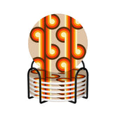 Bring the bold vibes of the 70s to your table with these groovy swirl ceramic coasters! Featuring a striking retro mod pattern in warm orange, yellow, and brown tones, these round coasters are a perfect addition to any mid-century modern or funky bar setup. Made from absorbent ceramic with a cork backing, they protect surfaces from spills while keeping drinks stylishly in place. The set includes six coasters with a sleek black metal holder for easy storage. Perfect for vintage enthusiasts, housewarming gifts, or anyone who loves a pop of retro flair!