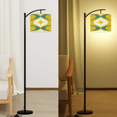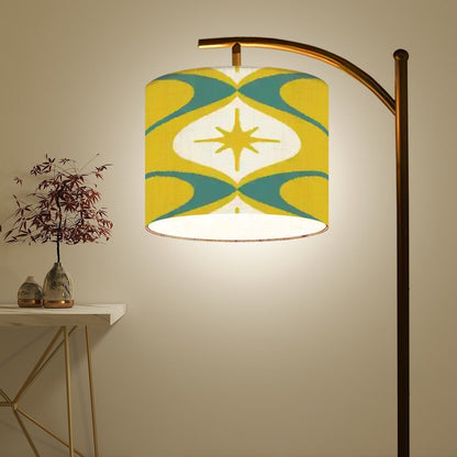 Step into mid-century modern perfection with this retro arc floor lamp featuring a bold starburst and boomerang pattern in mustard yellow, teal, and cream. The sleek curved arm paired with a linen drum shade creates the perfect mix of 50s atomic flair and modern function. A swanky statement piece for any lounge, reading nook, or vintage-inspired space.
