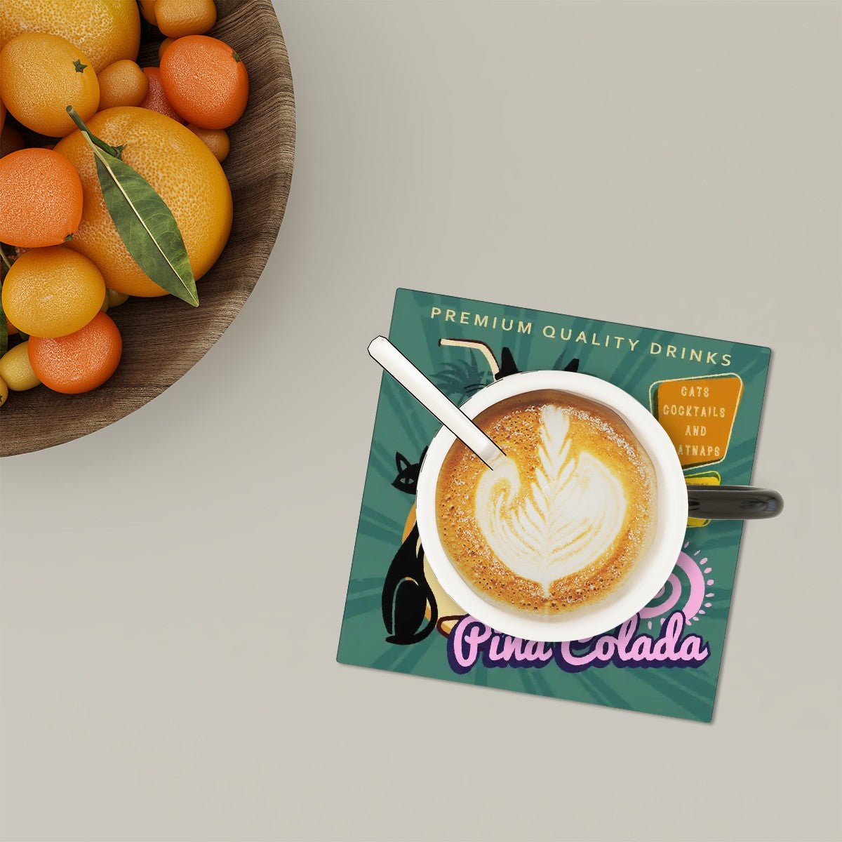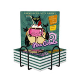 Sip, relax, and embrace the Atomic Cat lifestyle! These mid-century modern ceramic coasters celebrate the ultimate motto: Cats, Cocktails, and Catnaps. Featuring Atomic Cat with a playful retro cocktail lounge theme, this set of six absorbent ceramic coasters adds the perfect vintage touch to your bar or coffee table. Cork backing protects surfaces, while the black metal stand keeps them stylishly stored. A must-have for MCM lovers, tiki bar fans, and Atomic Cat collectors!