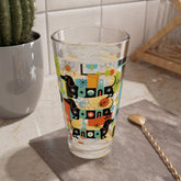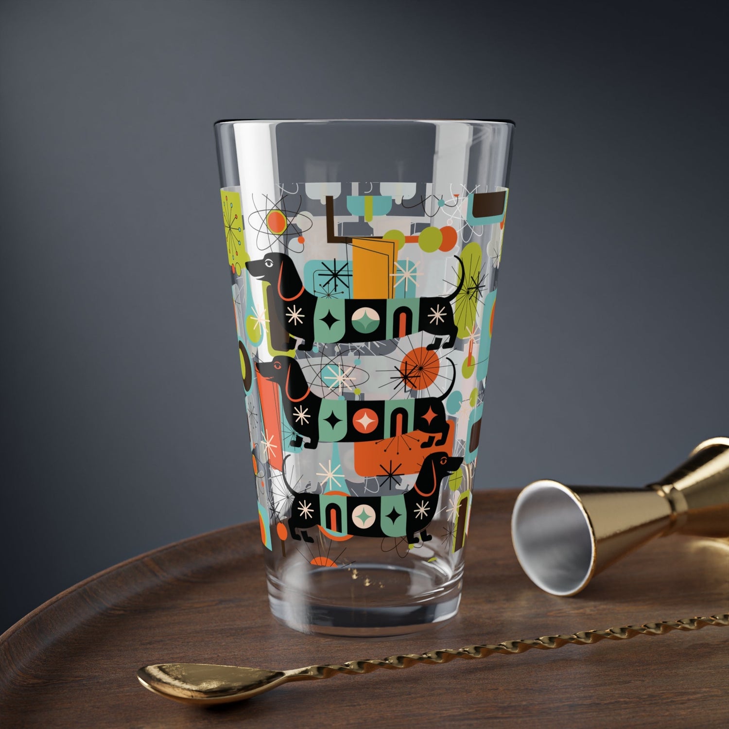This pint glass brings tail-wagging charm to your cocktail hour. Featuring a playful dachshund wrapped in retro orbs and atomic bursts. Cheers to mid-century magic.