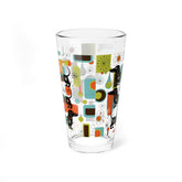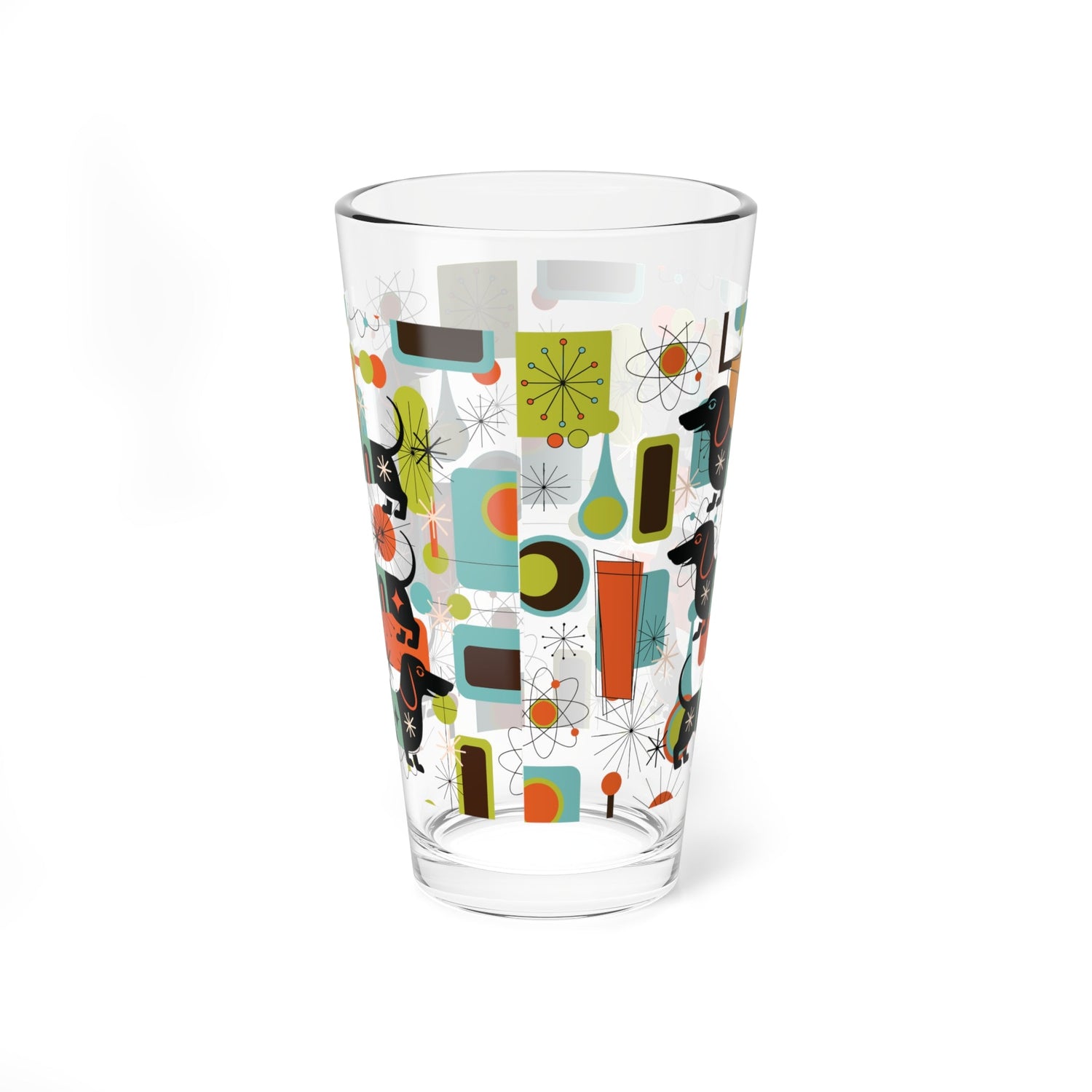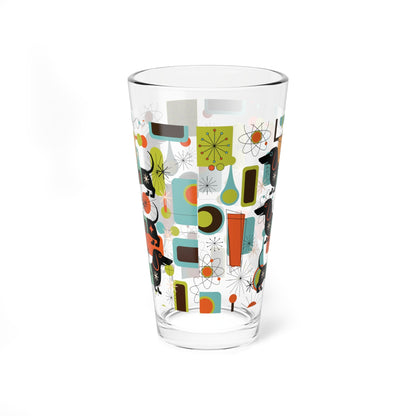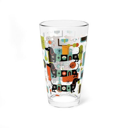 Dachshund Mid Century Modern Pint Glass, Retro MCM Starburst Barware, Atomic Age Sausage Dog Drinkware