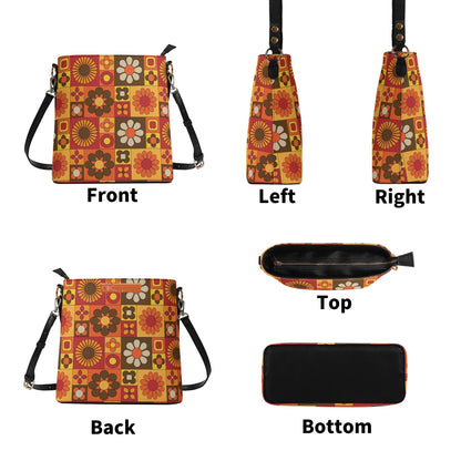 This retro mod crossbody bag bursts with 60s charm in warm orange, brown, and mustard tones. Groovy flower power meets mid-century cool.