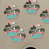 Retro Flamingo Palm Springs Hexagon Coasters, Mid Century Modern Poolside Ceramic Drinkware Set