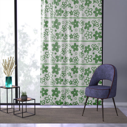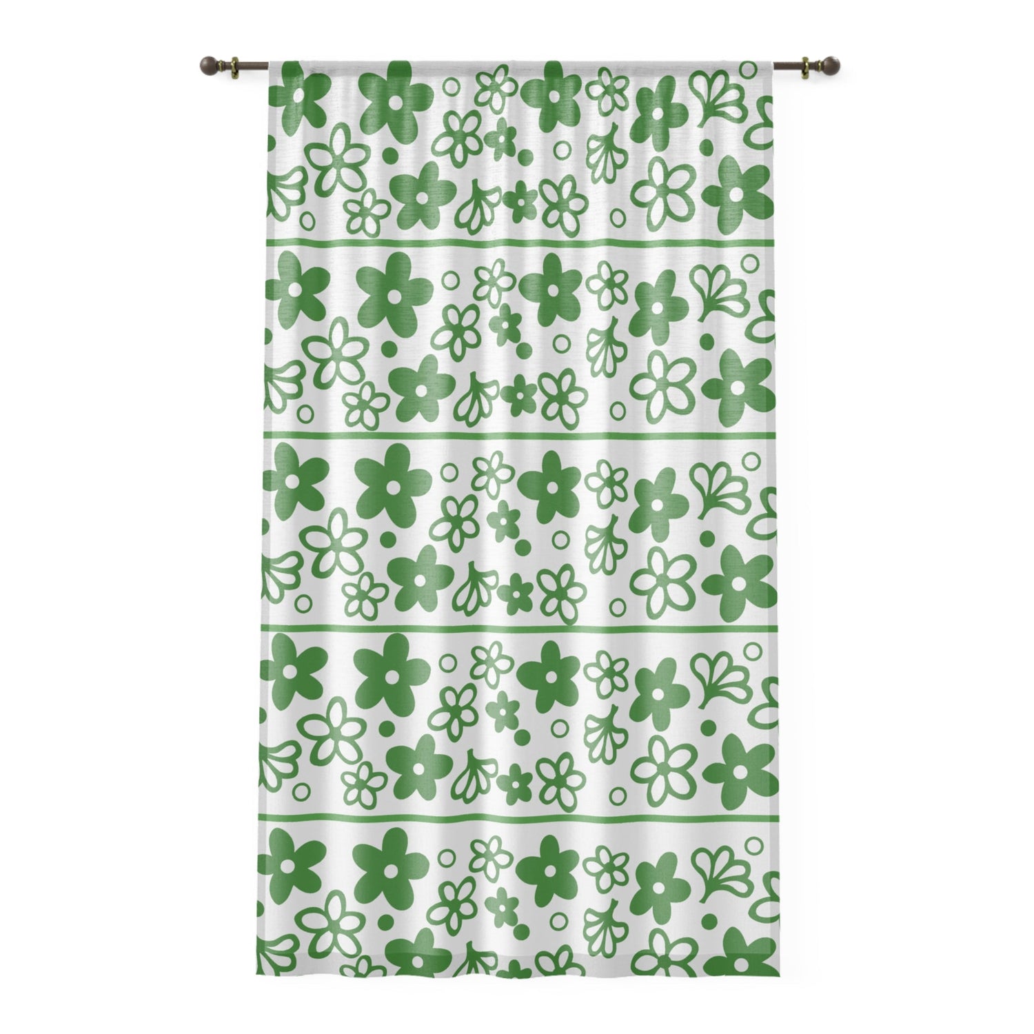 Bring vintage Pyrex charm to your space with this Spring Blossom Green sheer curtain! Featuring the iconic Crazy Daisy floral in a fresh green and white design, this mid-century modern window panel adds a groovy 70s vibe to any room. Perfect for kitchens, dining areas, or retro-inspired spaces!