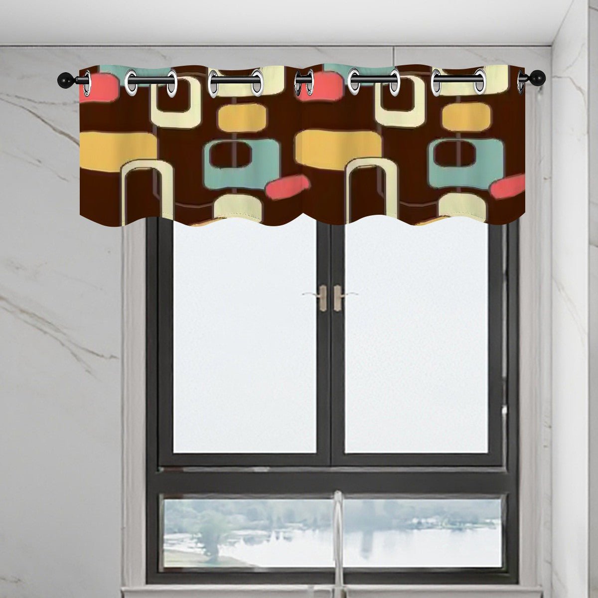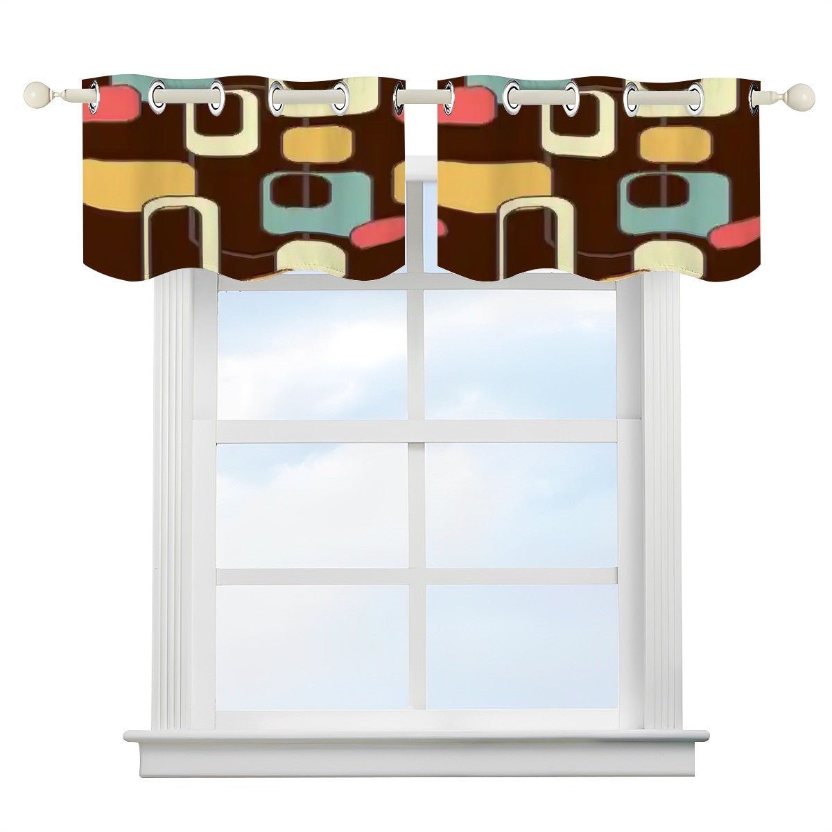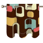 Bring bold mid-century modern style to your space with this retro geometric window valance featuring abstract atomic shapes in brown, teal, mustard, and coral. A perfect accent for kitchens, dining rooms, or any space that needs a 1950s mod touch. Designed with grommet-style rings for easy hanging, this valance is a statement piece for any retro-inspired home.