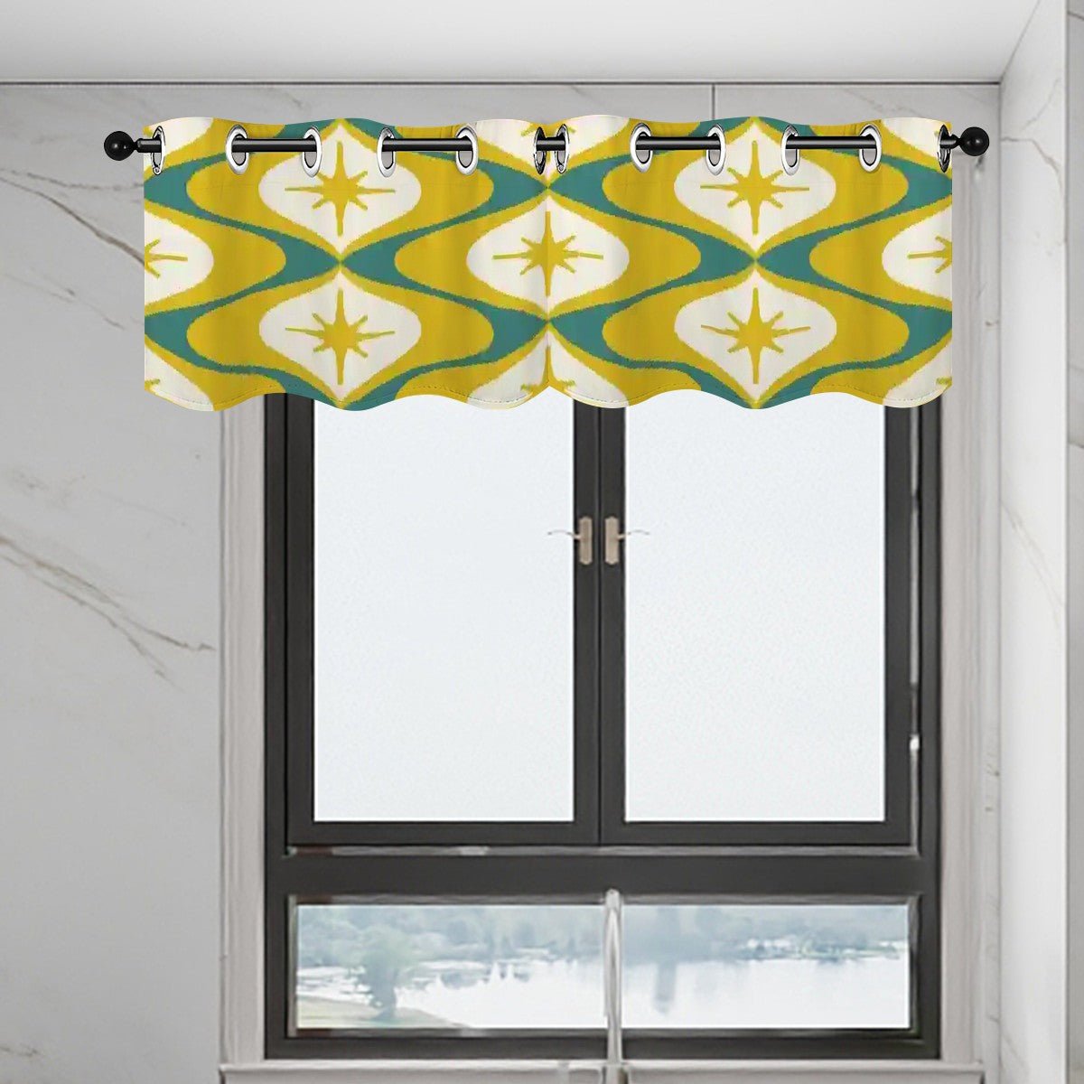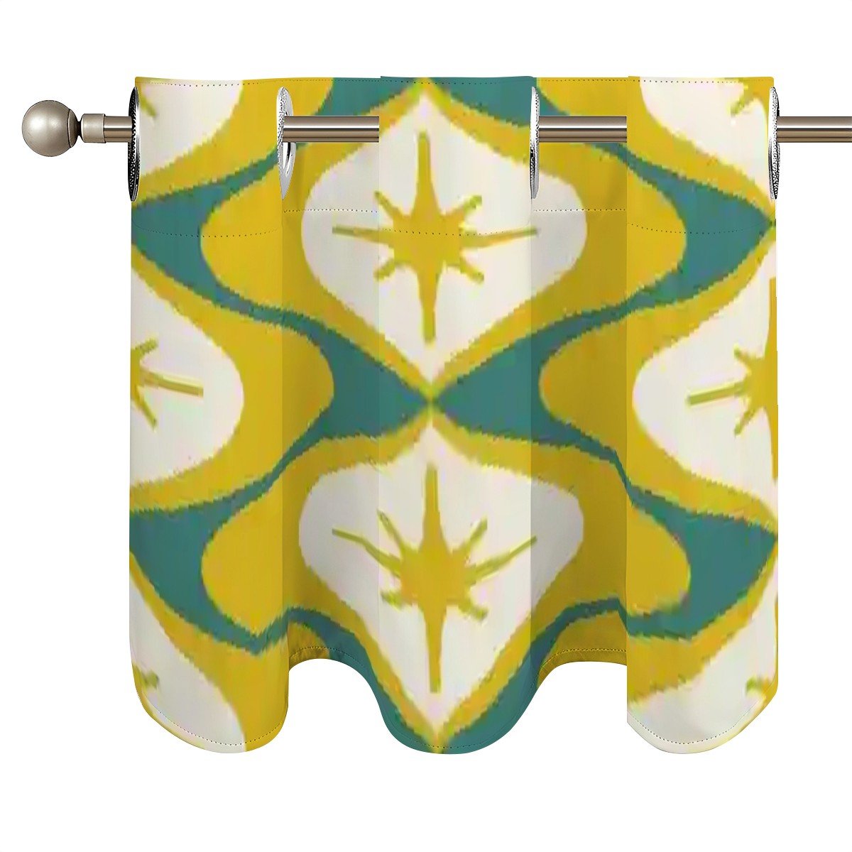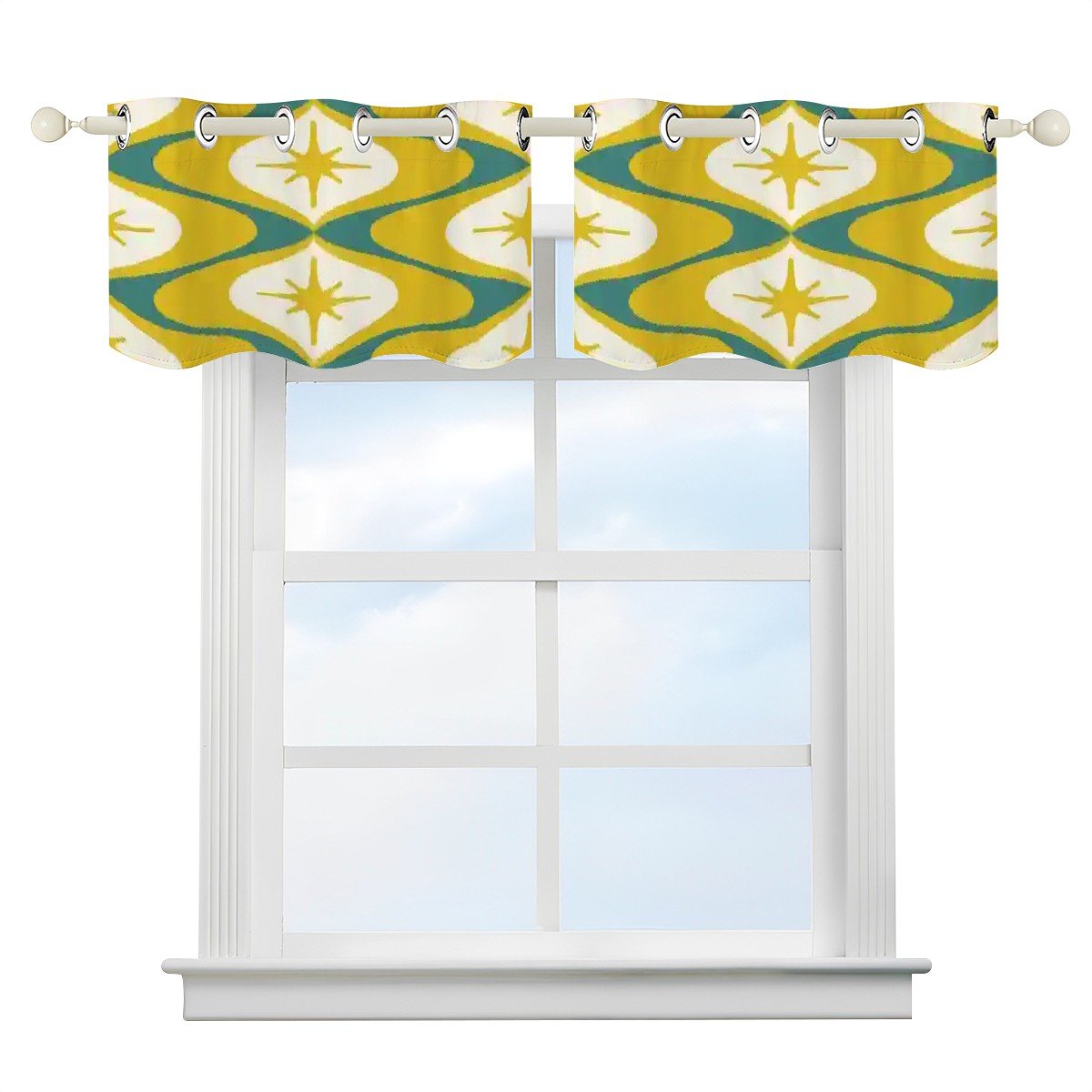 Bring atomic-age charm to your space with this mid-century modern kitchen valance. Featuring a bold retro starburst design in vibrant yellow, teal, and white, this geometric curtain topper adds a nostalgic flair to windows. Made from durable, lightweight fabric, it offers easy installation and a polished look for kitchens, dining areas, or breakfast nooks.