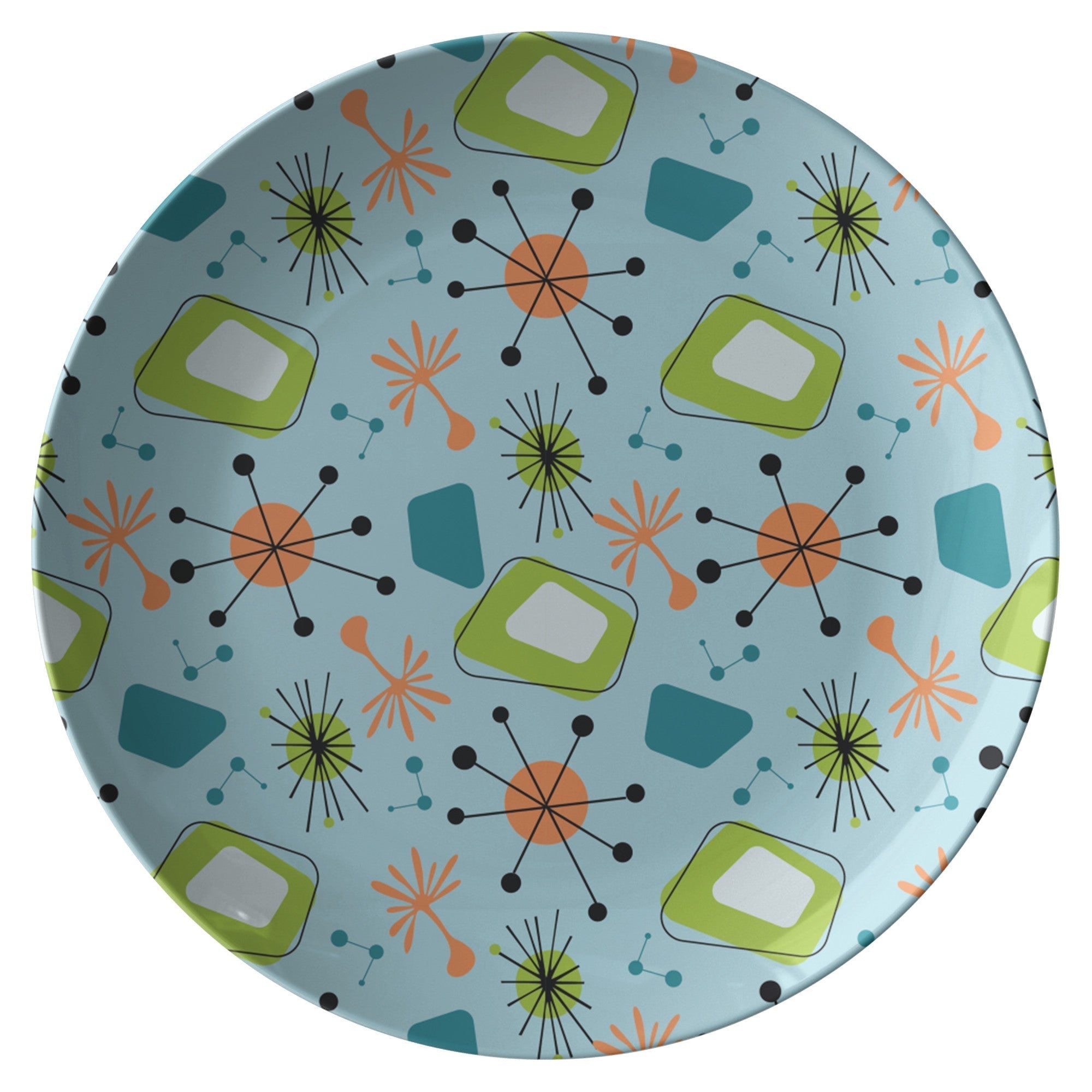 Inspira la era atómica en tu mesa con este vibrante plato verde azulado, con formas clásicas de bumerán y estrellas de mediados de siglo. Es la combinación perfecta de funcionalidad y kitsch para realzar tus comidas.