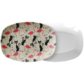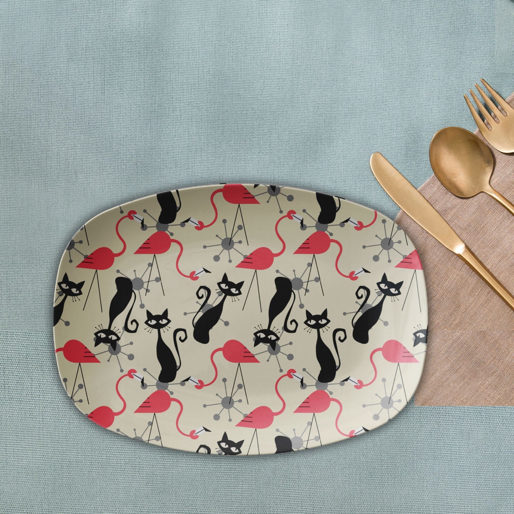 Dale un toque retro a tu mesa con esta bandeja de servir de mediados de siglo con diseño de gato atómico y flamenco. Su original diseño Starburst en crema, rosa y gris sin duda le dará un toque divertido a cualquier reunión. Perfecta para recibir invitados o como un toque único para la decoración de tu cocina.