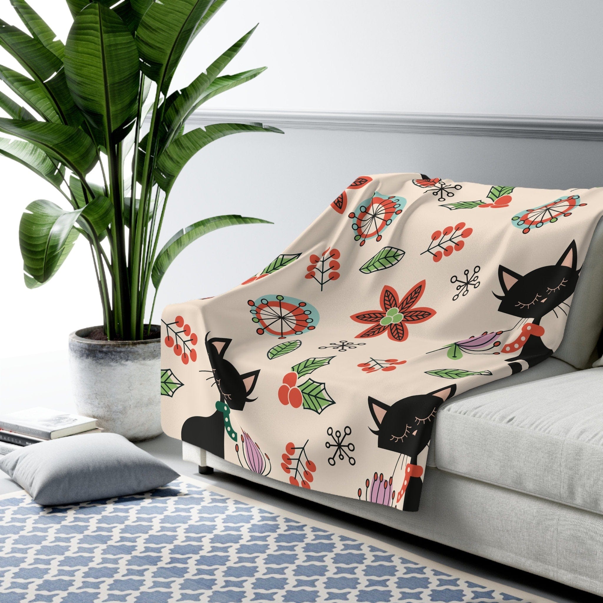 Manta de sherpa navideña bohemia moderna de mediados de siglo con diseño de gato atómico