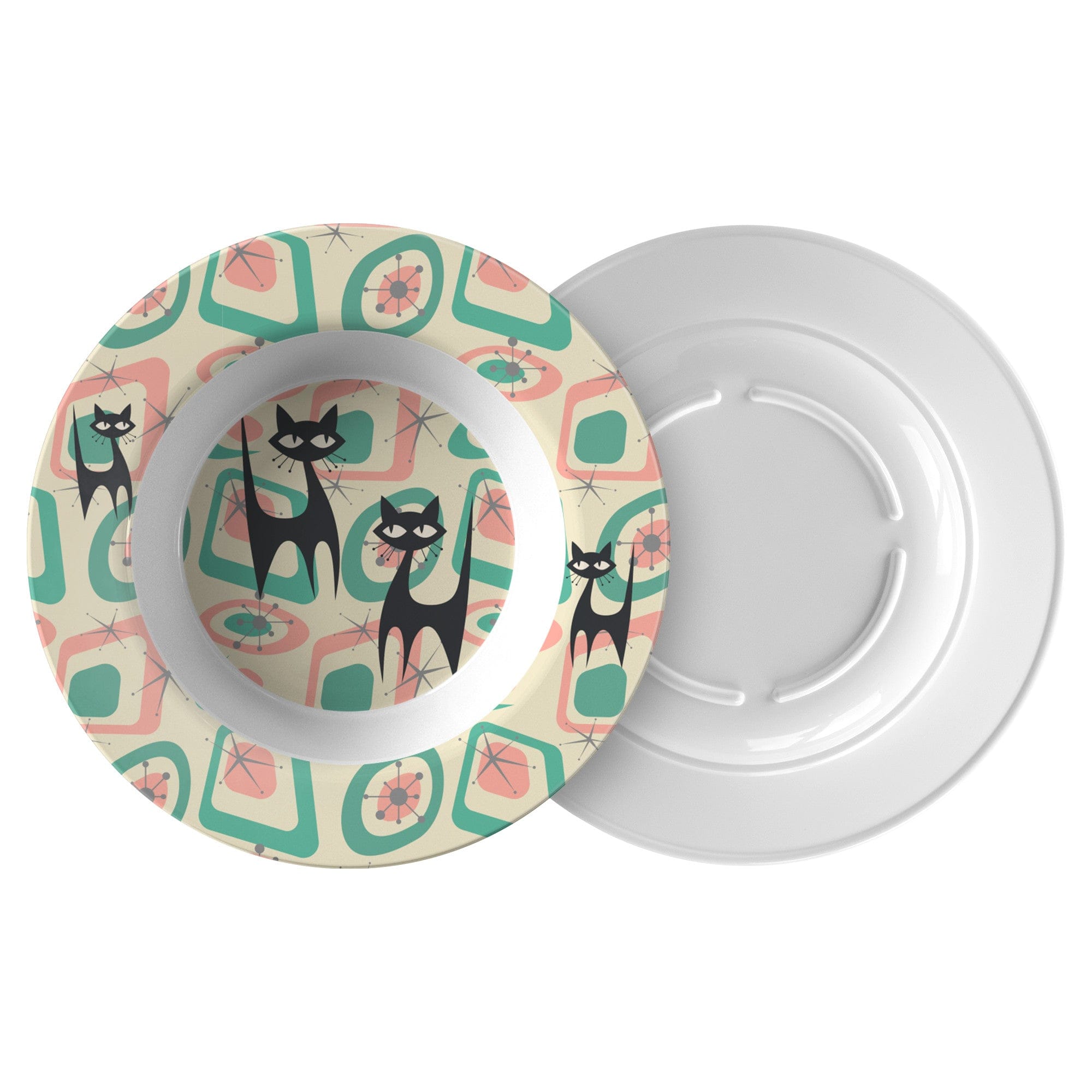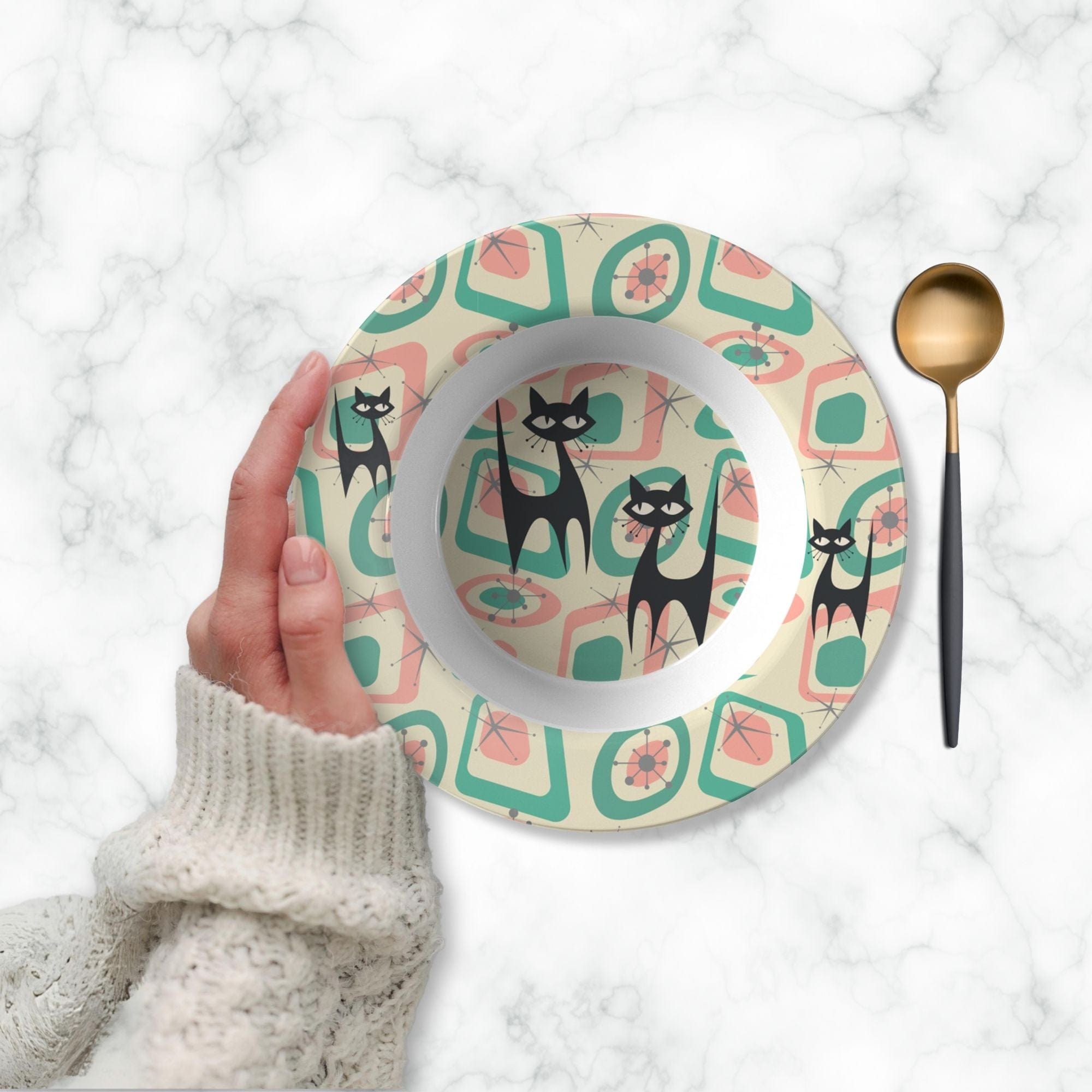 ¡Llena tu cocina de estilo kitsch con este tazón atómico para gatos! Sus figuras felinas de mediados de siglo y sus detalles atómicos crean un ambiente retro perfecto tanto para los amantes de los gatos como para los amantes de lo vintage.