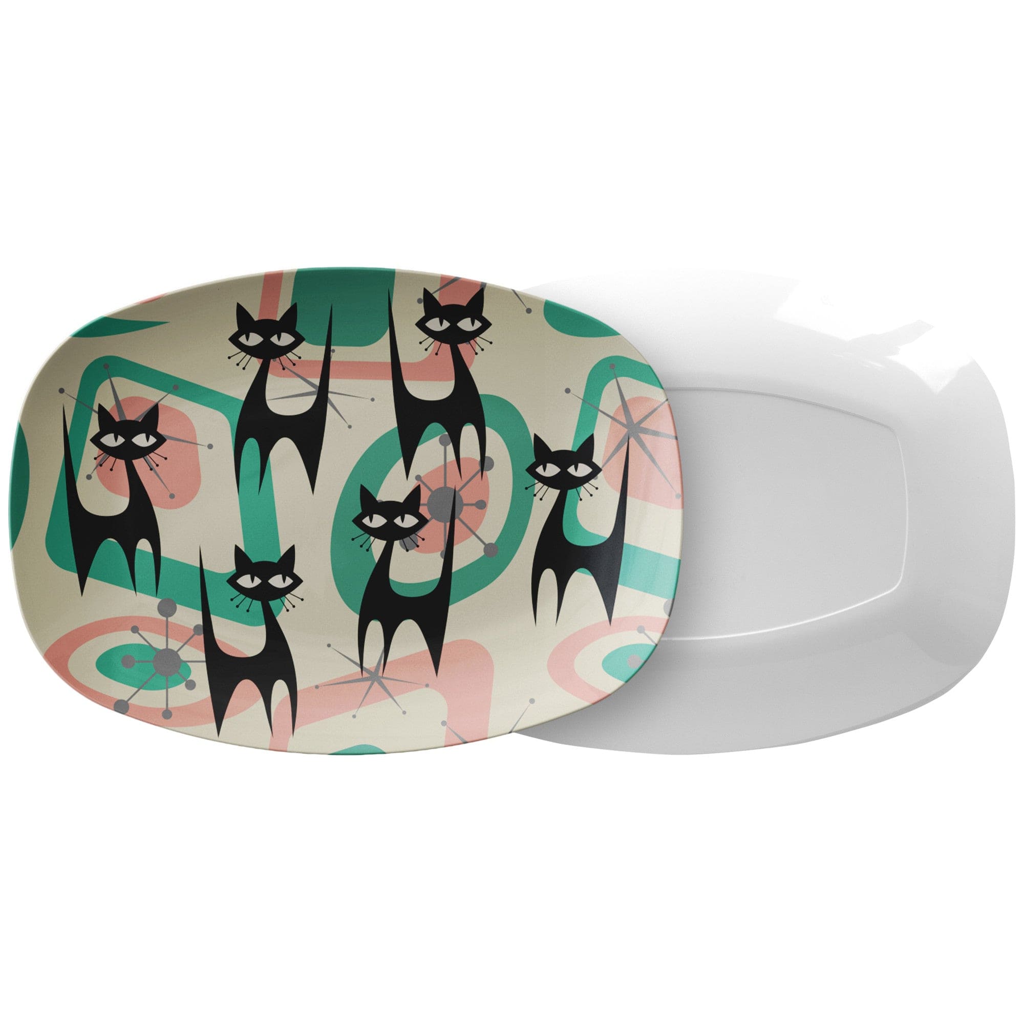 Dale un toque retro a tu cocina con la bandeja Atomic Cat Mid Century Modern Starburst. Esta bandeja, inspirada en los años 60, presenta un diseño geométrico en rosa, menta y gris. No solo es un complemento elegante para tu cocina, sino que también es perfecta para servir tus aperitivos y dulces favoritos a tus invitados (¡o a ti mismo!).