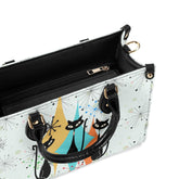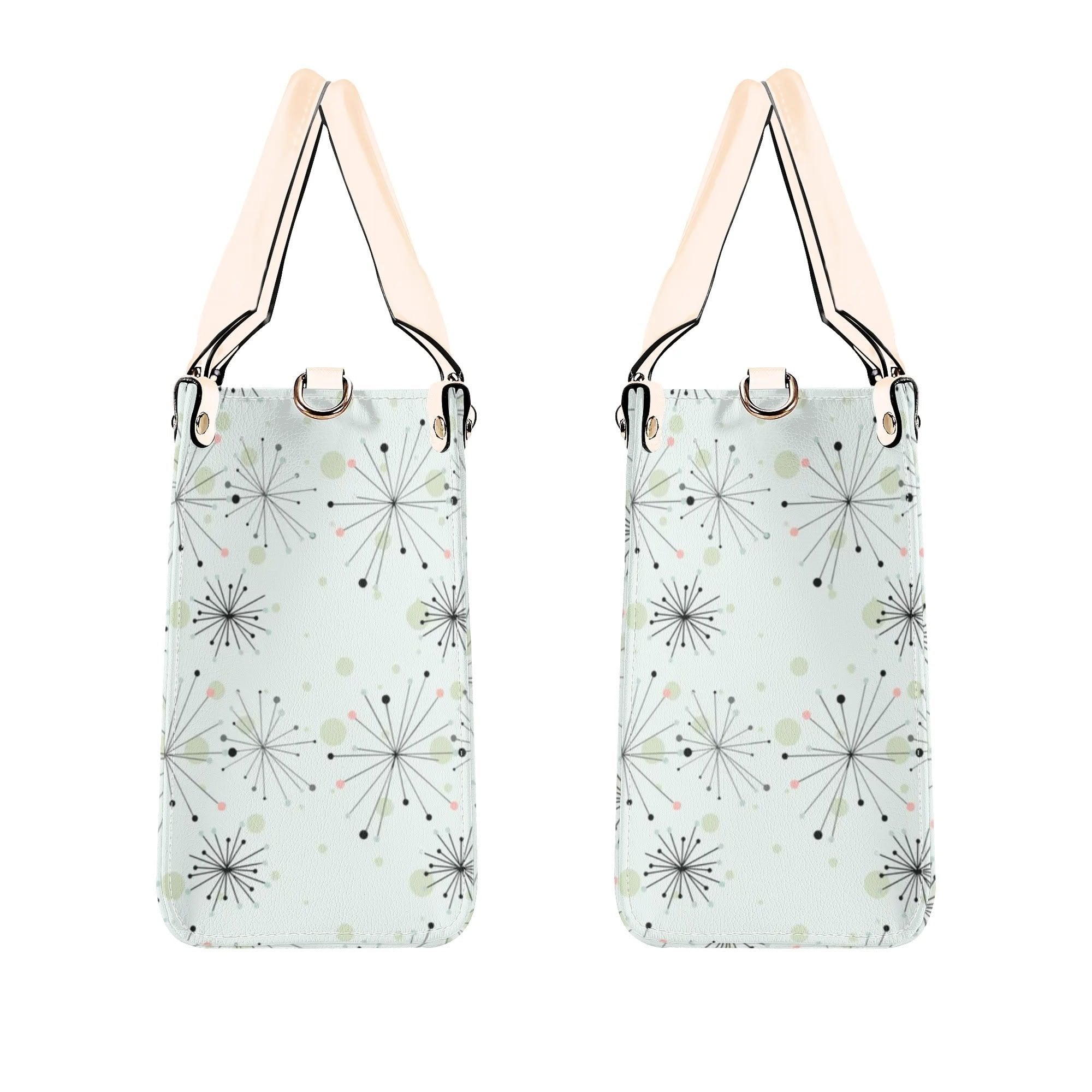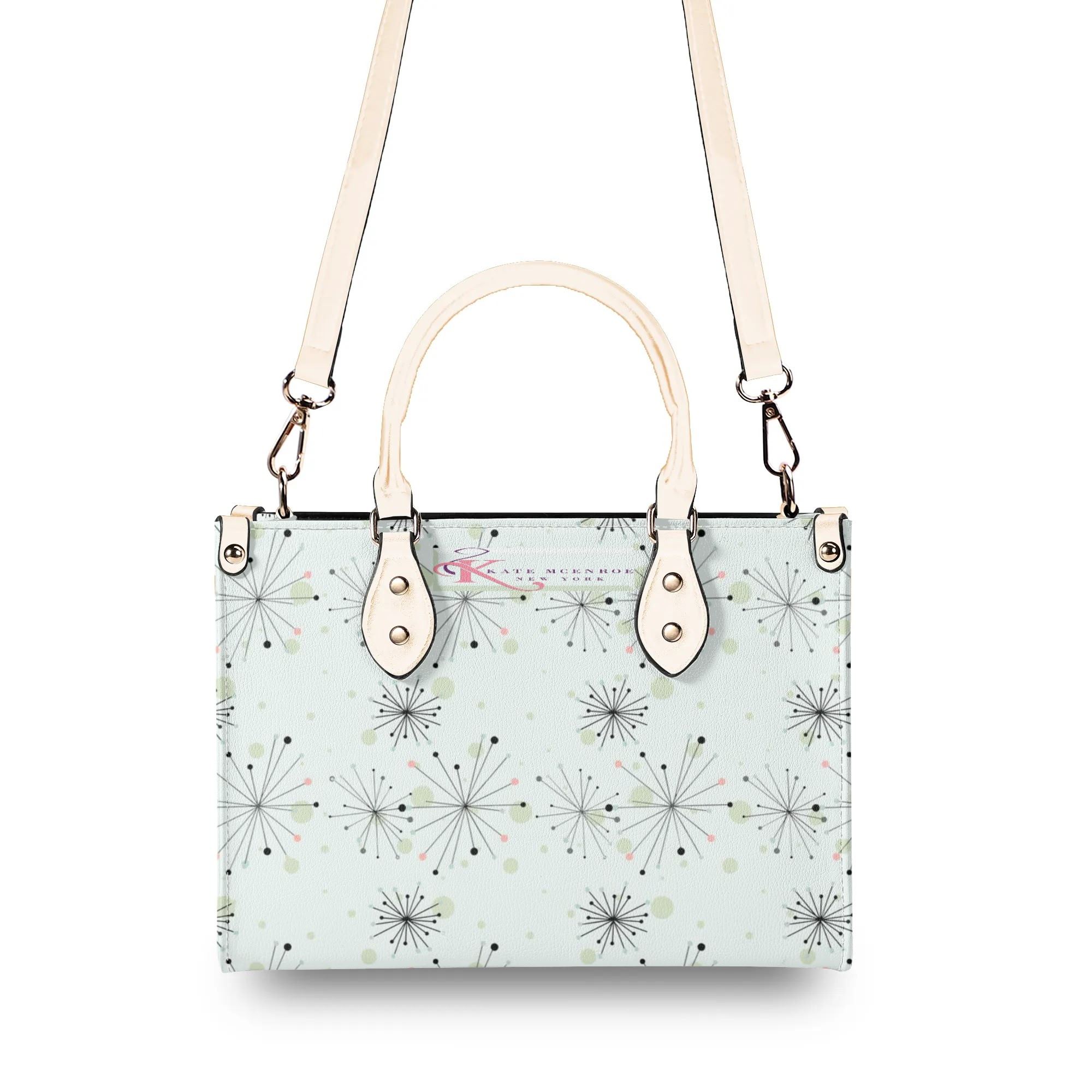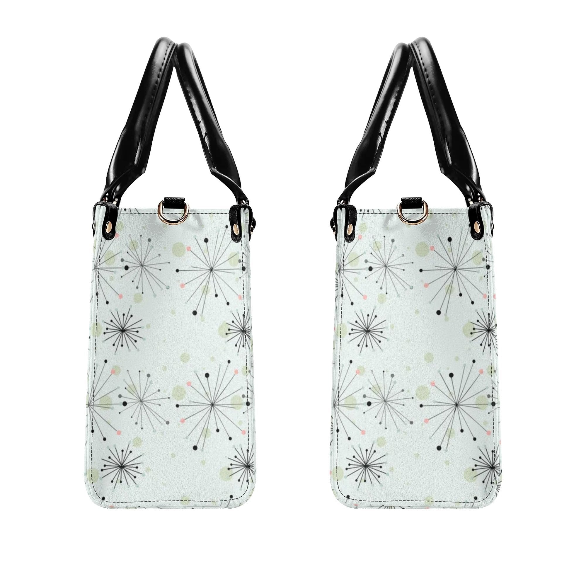 ¡Prepárate para causar sensación con nuestro bolso satchel Atomic Cat Mid Century Starburst! Este bolso retro MCM presenta un divertido diseño geométrico moderno de los años 50 que llamará la atención. Perfecto para cualquier fashionista con un toque peculiar, este bolso satchel sin duda le dará un toque divertido a tu armario.