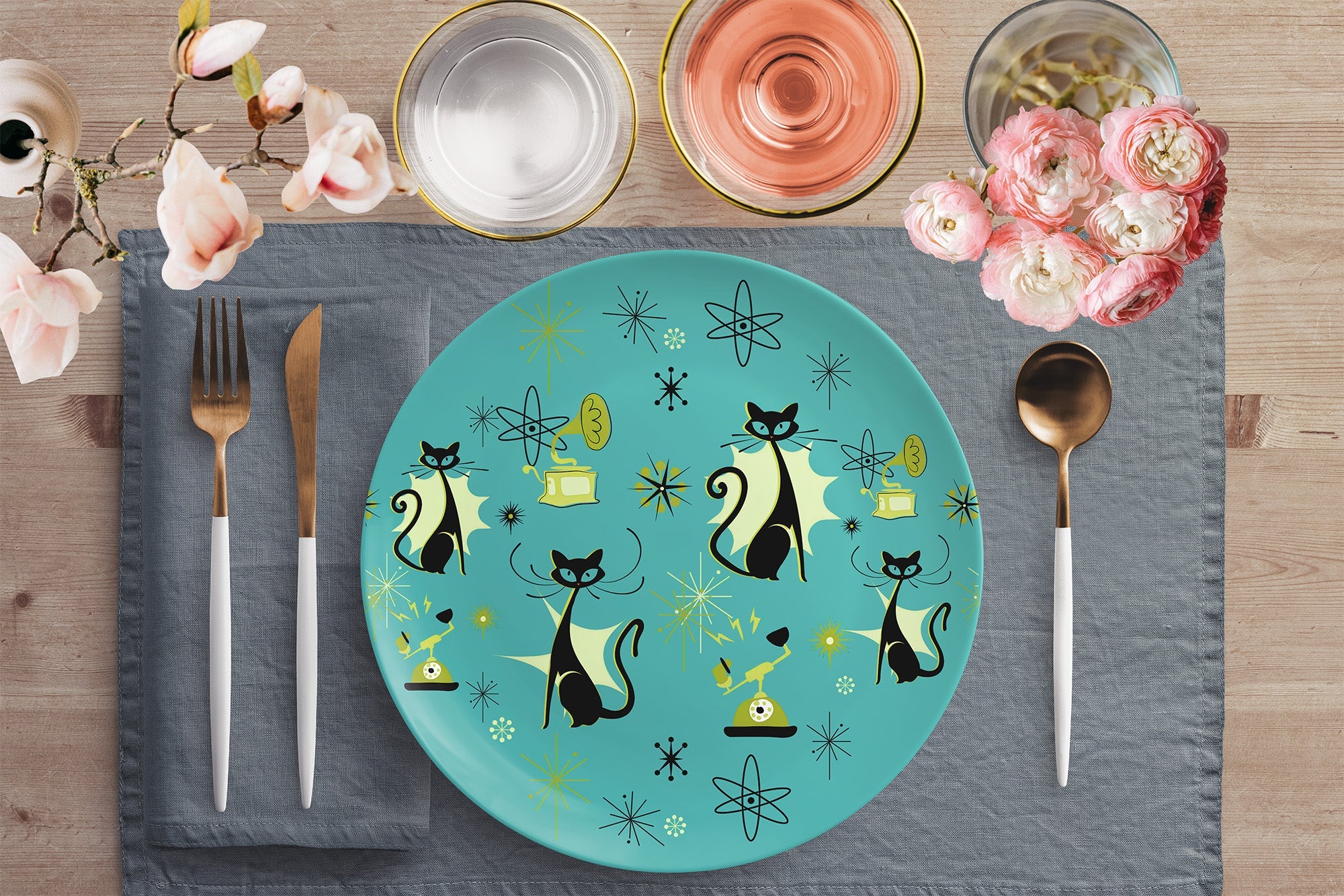 Prepárate para darle un toque retro a tu mesa con nuestro Plato Sputnik Atomic Cat de estilo moderno de mediados de siglo. Este plato original y divertido presenta un diseño divertido que sin duda aportará nostalgia y humor a tus comidas. Deja que tu amante de los gatos retro brille con este plato único.