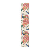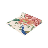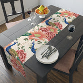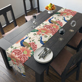 Camino de mesa estilo chinoiserie con diseño de pavo real, color melocotón y flores color crema, elegante decoración para comedores.