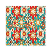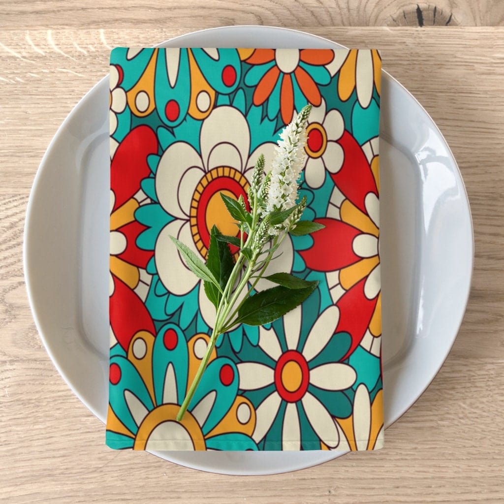 Servilletas de tela con flores retro modernas de mediados de siglo, mantelería floral con margaritas de mediados de los años 70 y servilletas de cena en tonos verde azulado y naranja de los años 60.