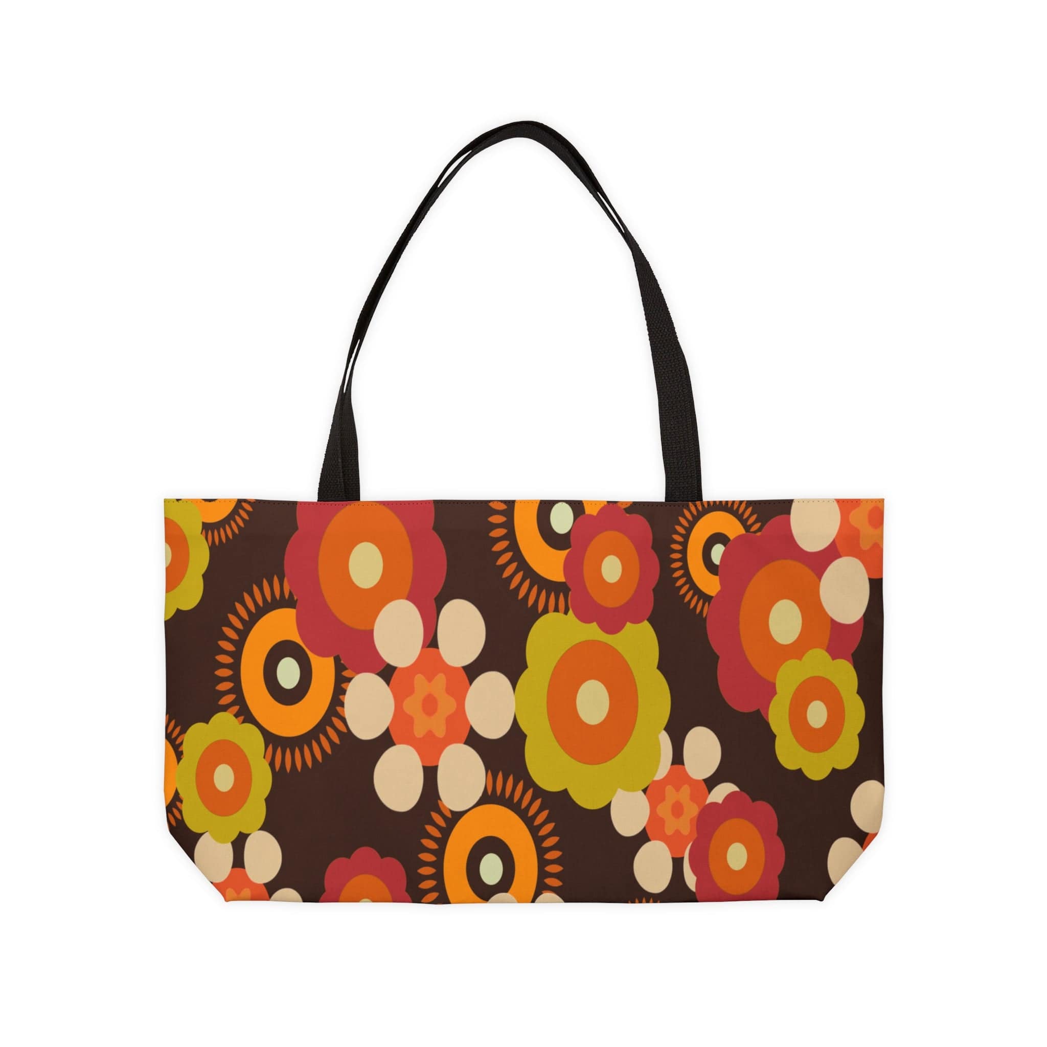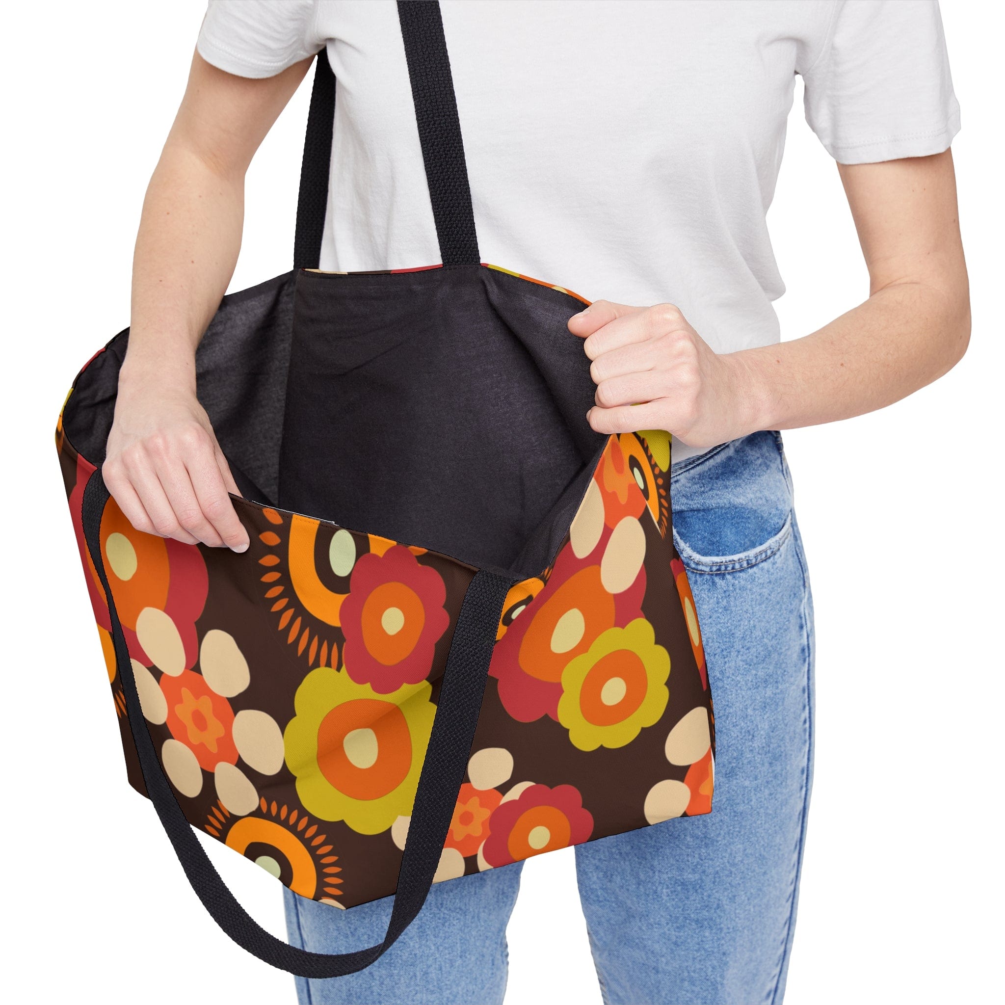 Diseñado para la chica de espíritu libre, este bolso tote de fin de semana, con un aire hippie bohemio y moderno de los años 60, ¡está listo para lucir tu estilo retro de los 70! Con base en T y asas negras, es perfecto para un picnic o una aventura.