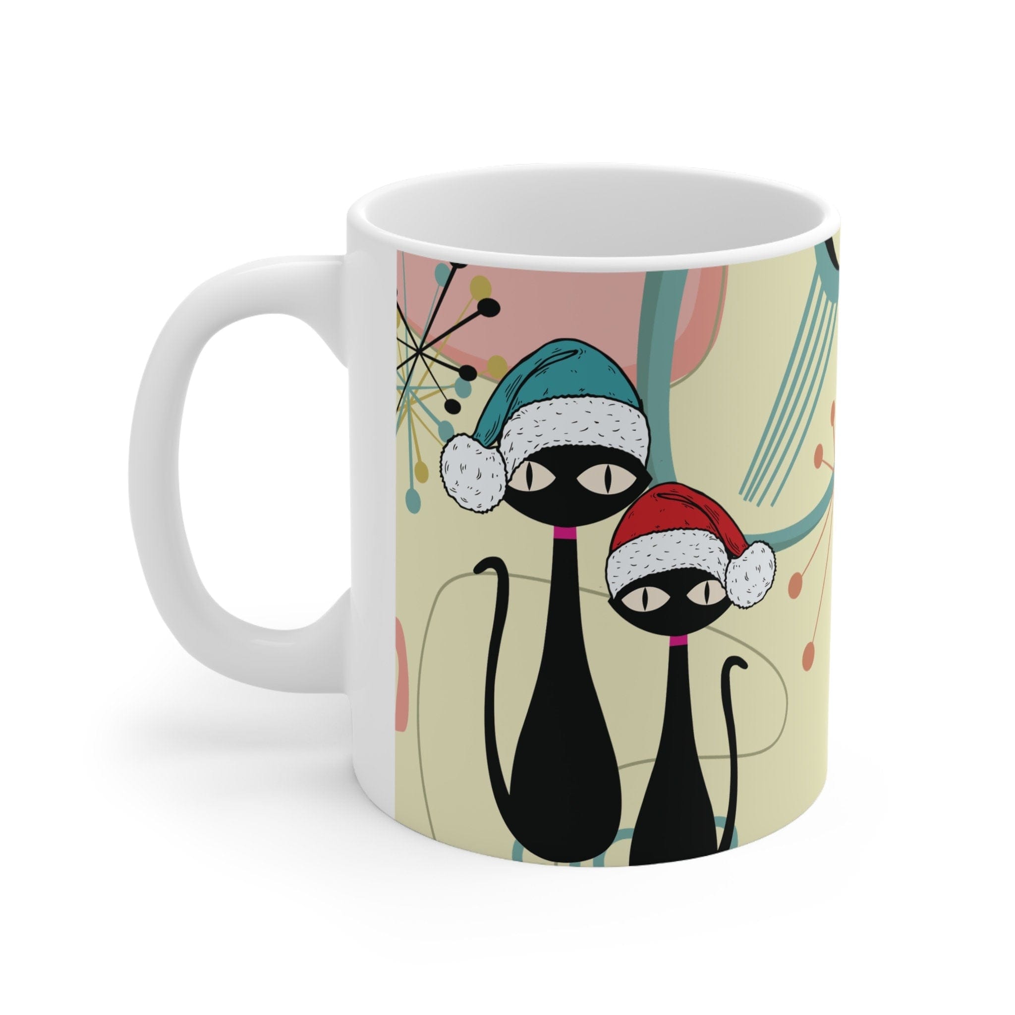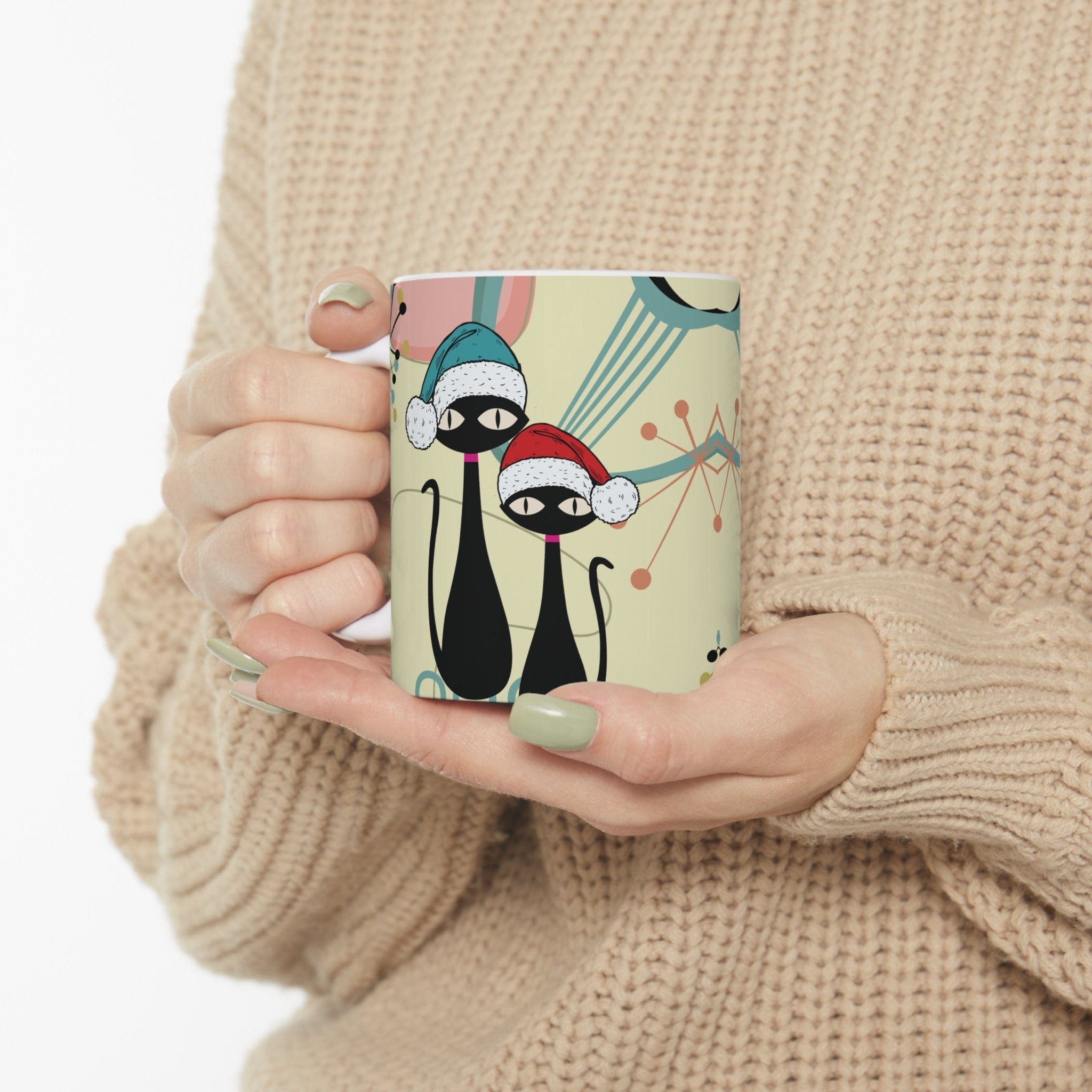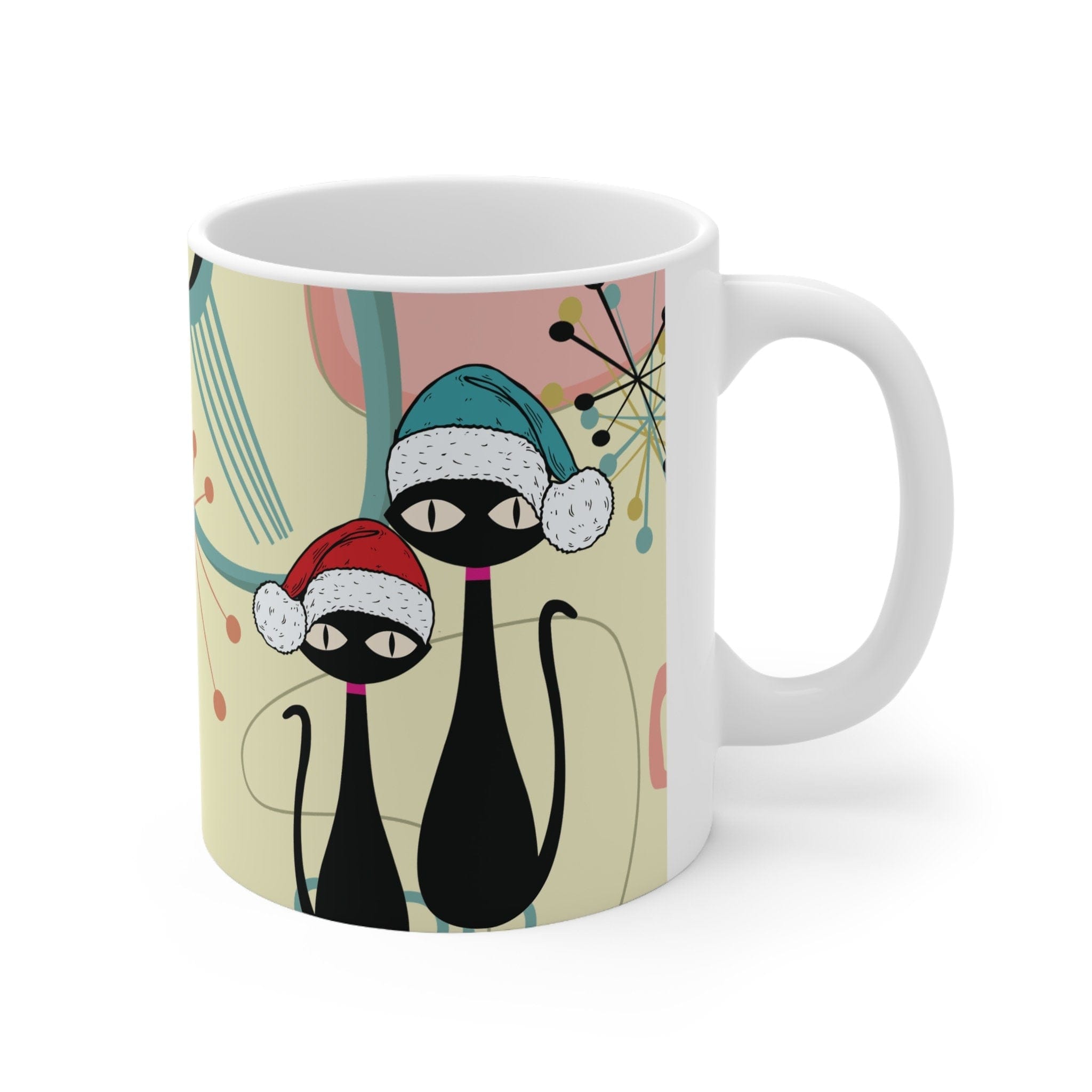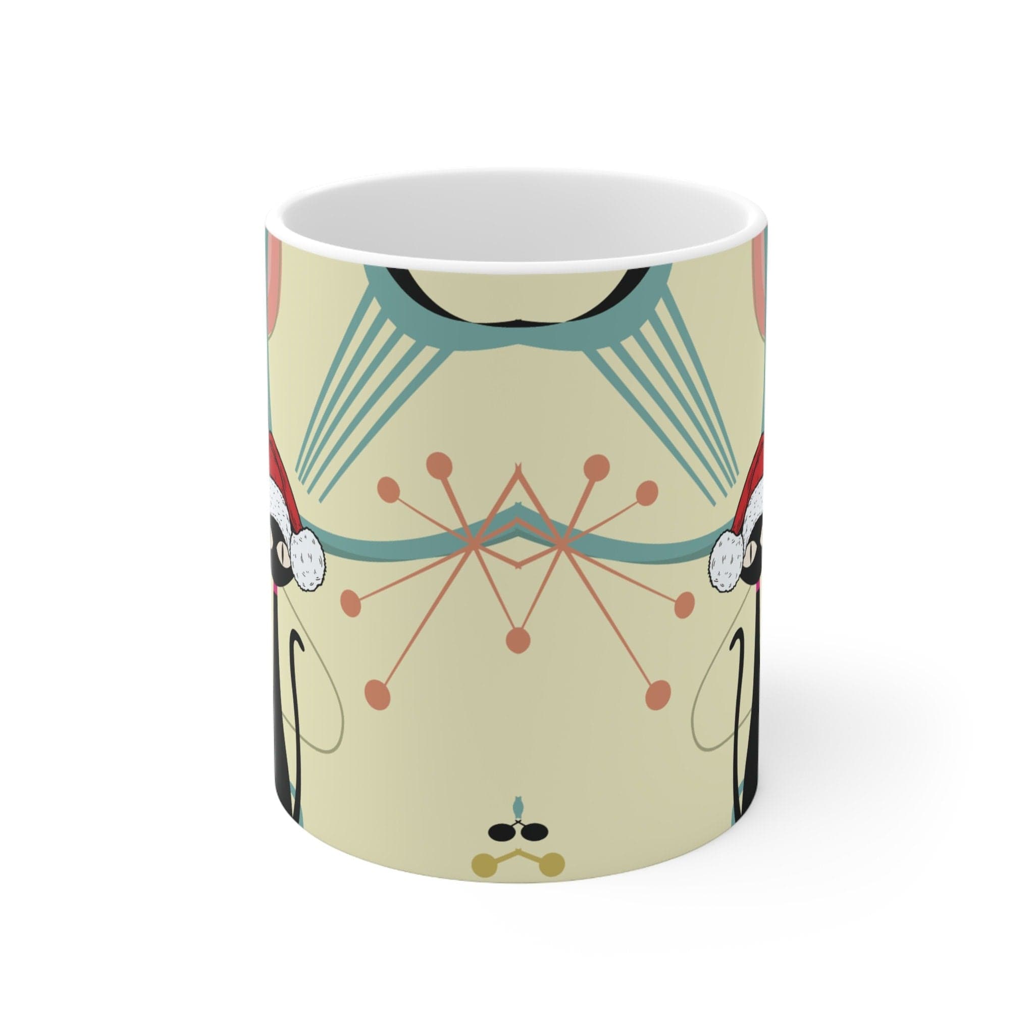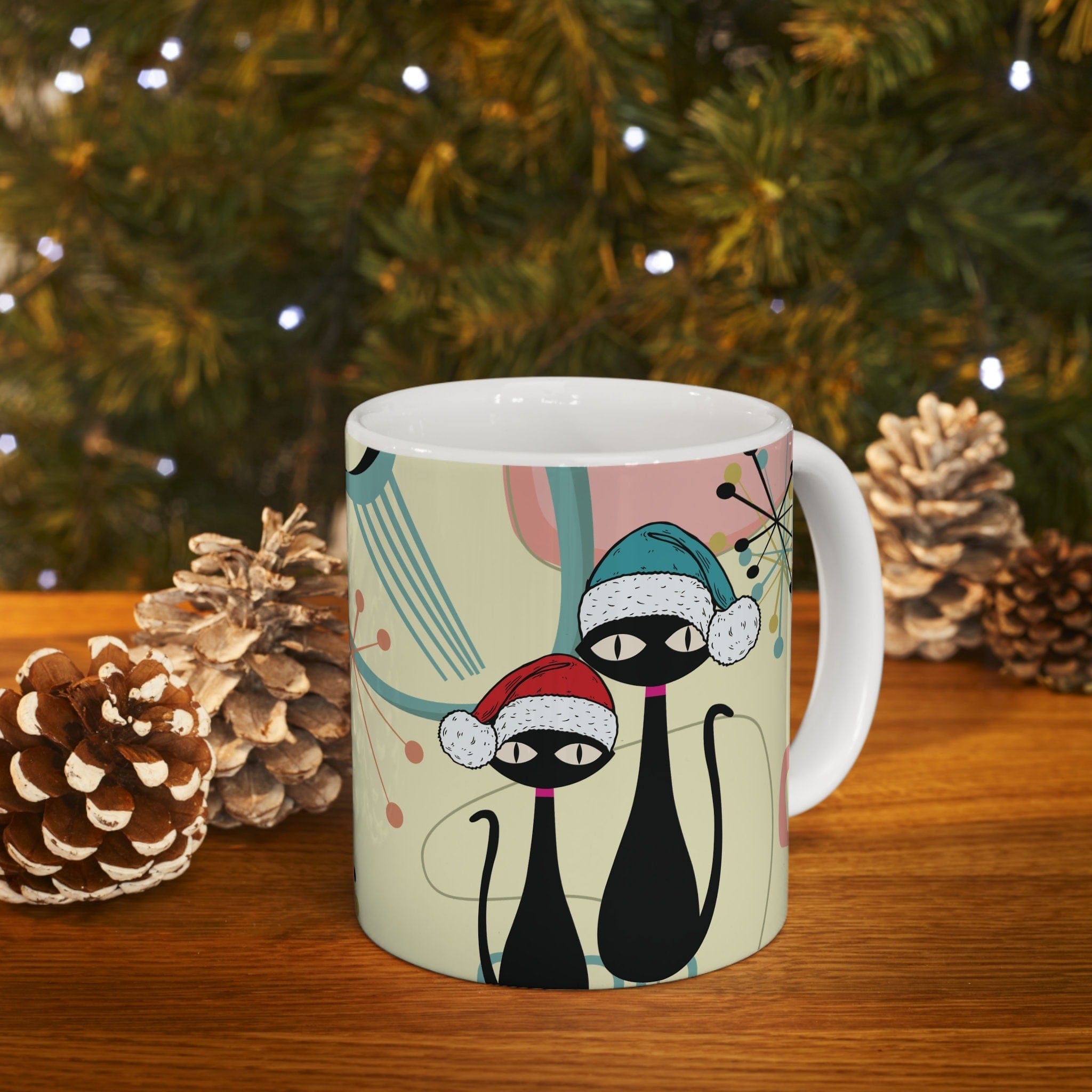 Taza navideña de gato de mediados de siglo - Vaso navideño retro con diseño de bumerán y explosión atómica - Kitschy Hippie de 325 ml