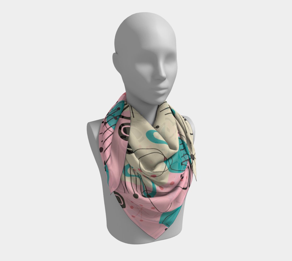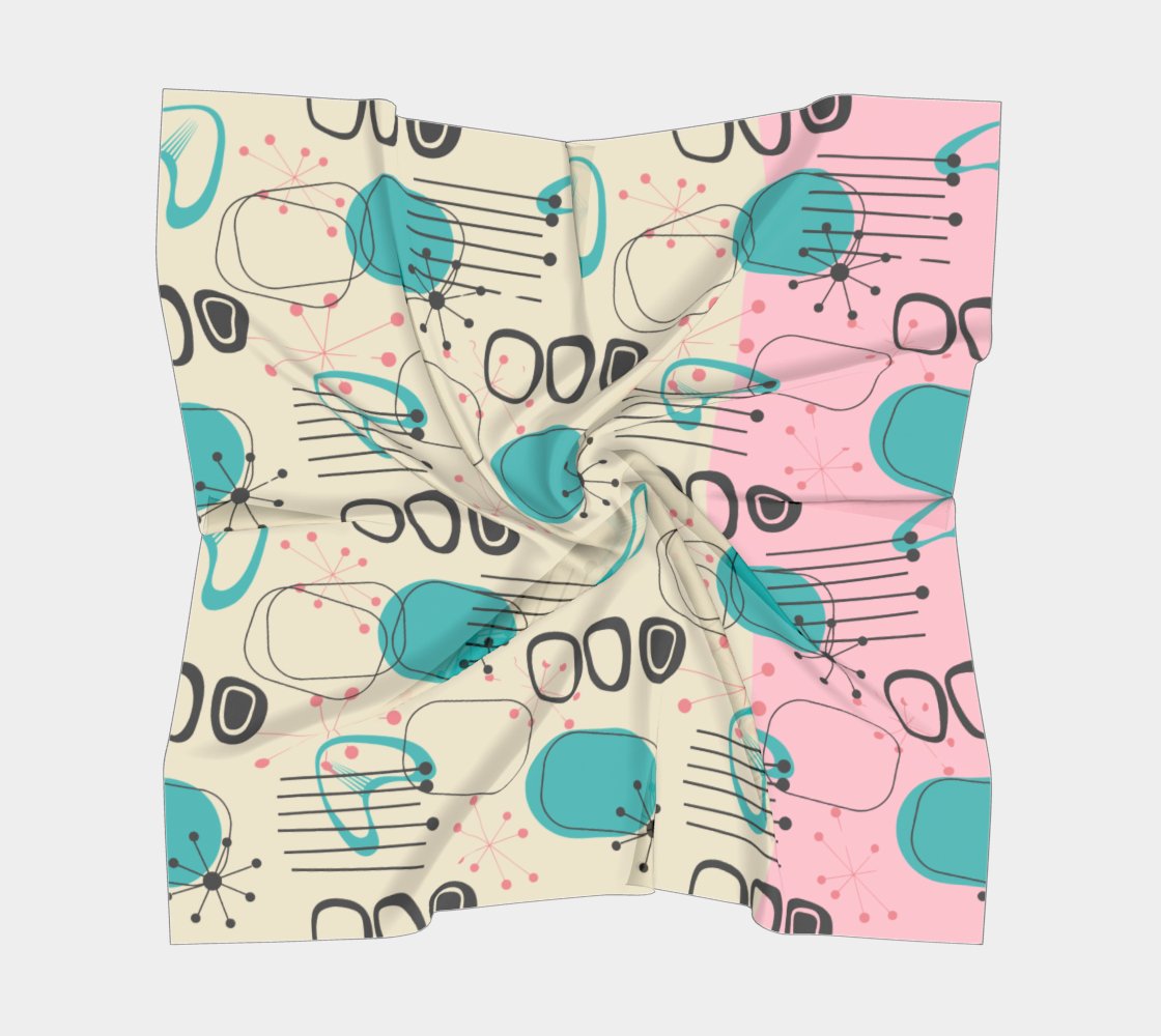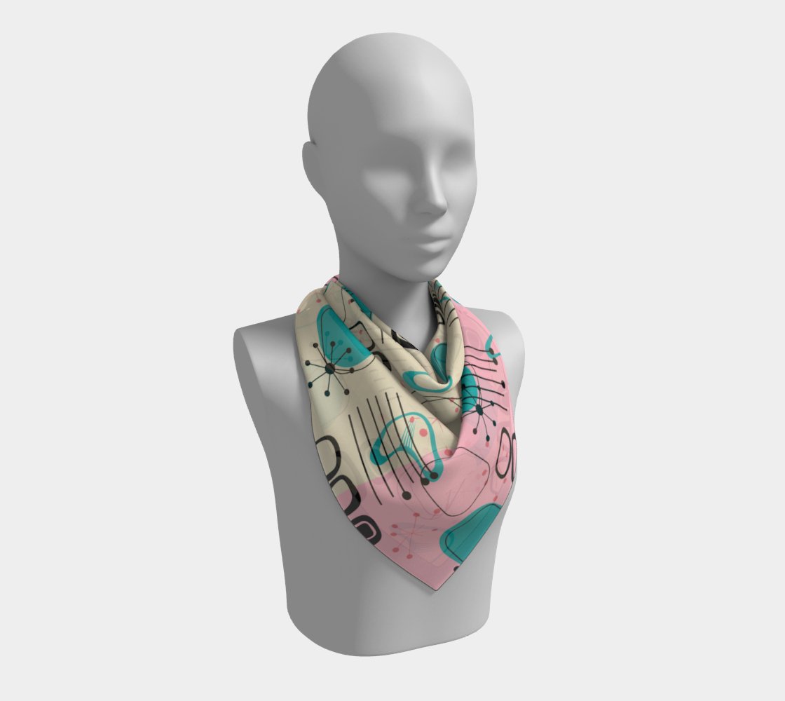 Inspira la era atómica con esta bufanda cuadrada de seda Habotai de estilo moderno de mediados de siglo. Con un audaz estampado atómico en colores vibrantes, esta bufanda es perfecta para añadir un toque vintage a cualquier look. Ligera, suave y elegante, es una prenda imprescindible para los amantes de la moda retro.
