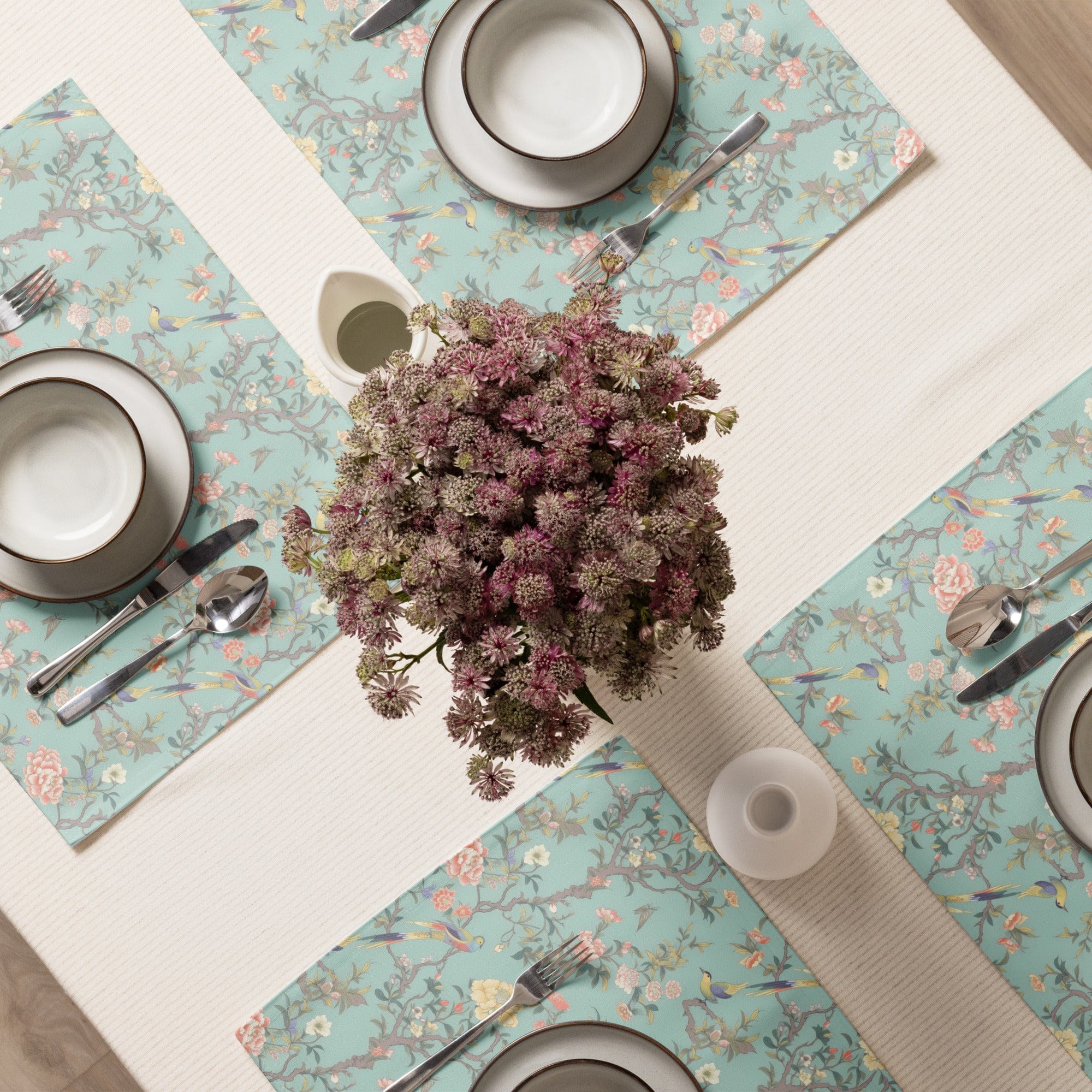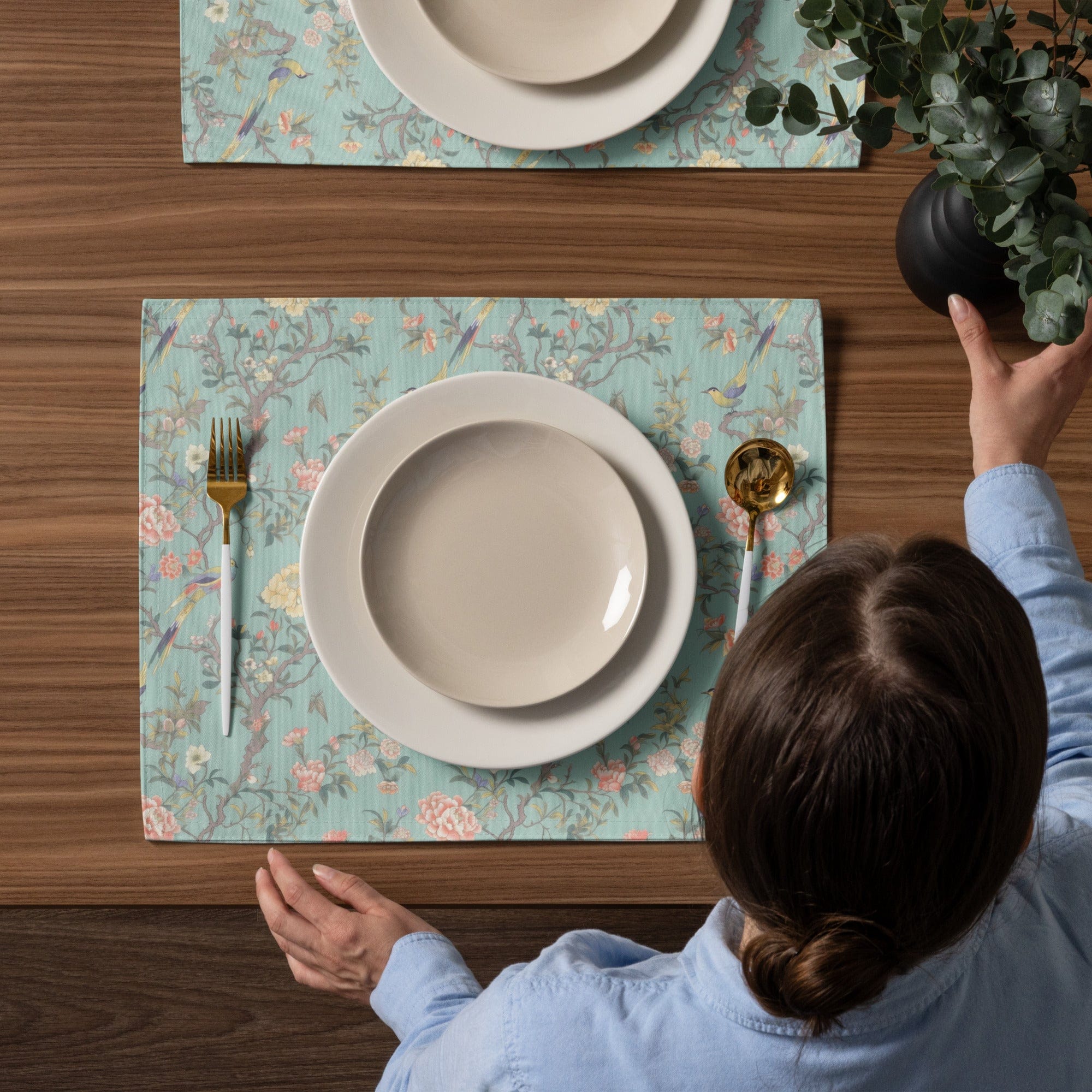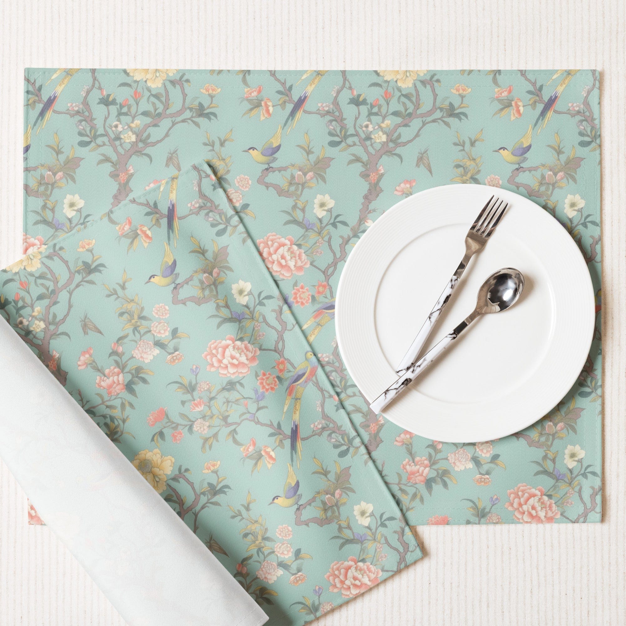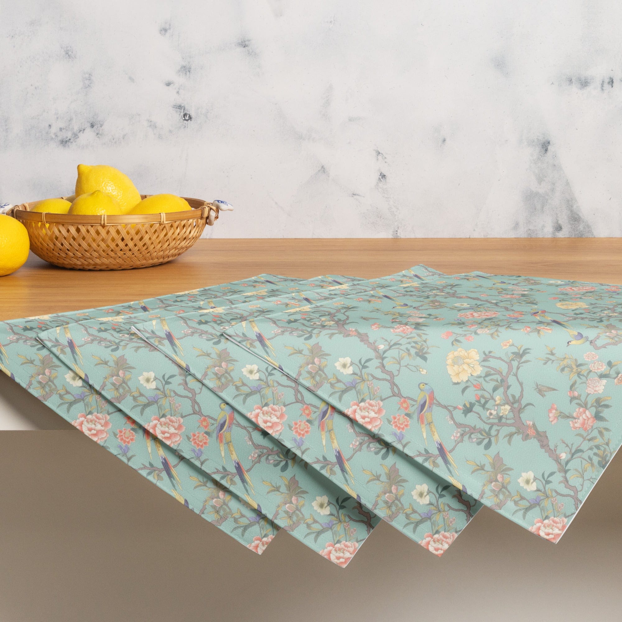 Juego de 4 manteles individuales estilo chinoiserie pastel con elegantes motivos florales y pájaros.