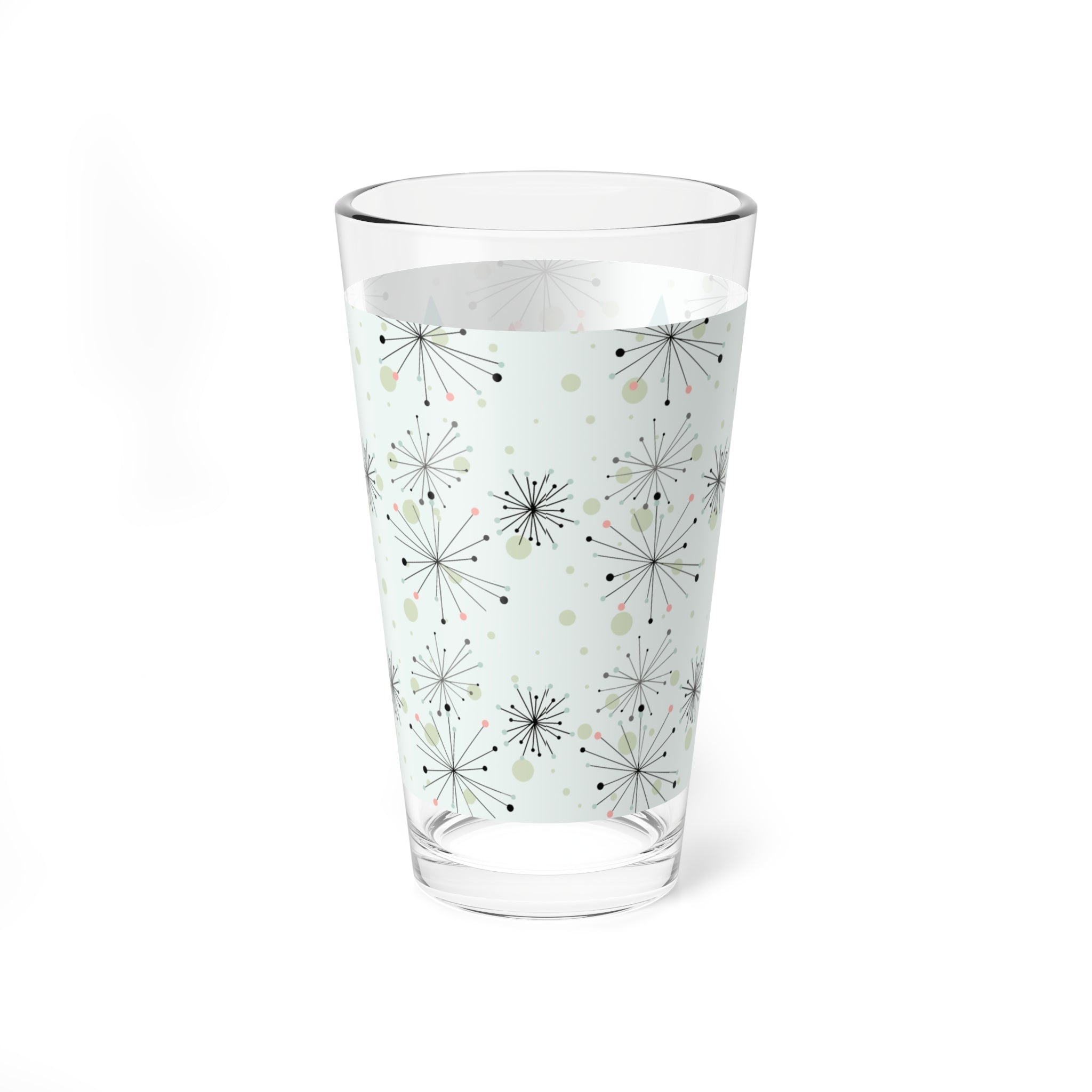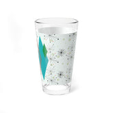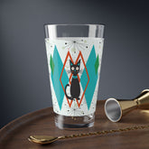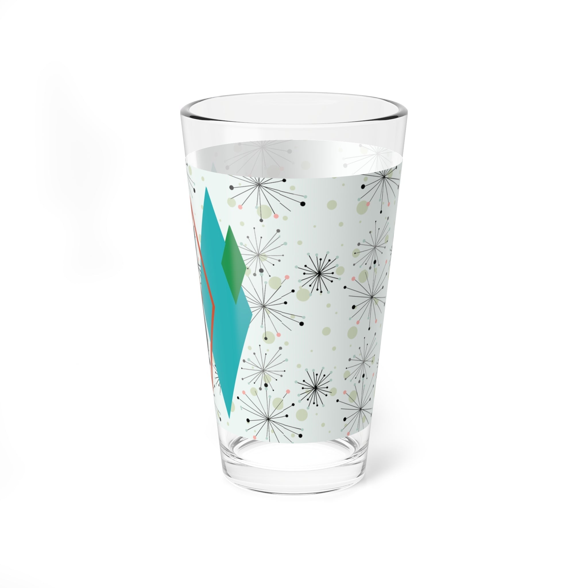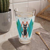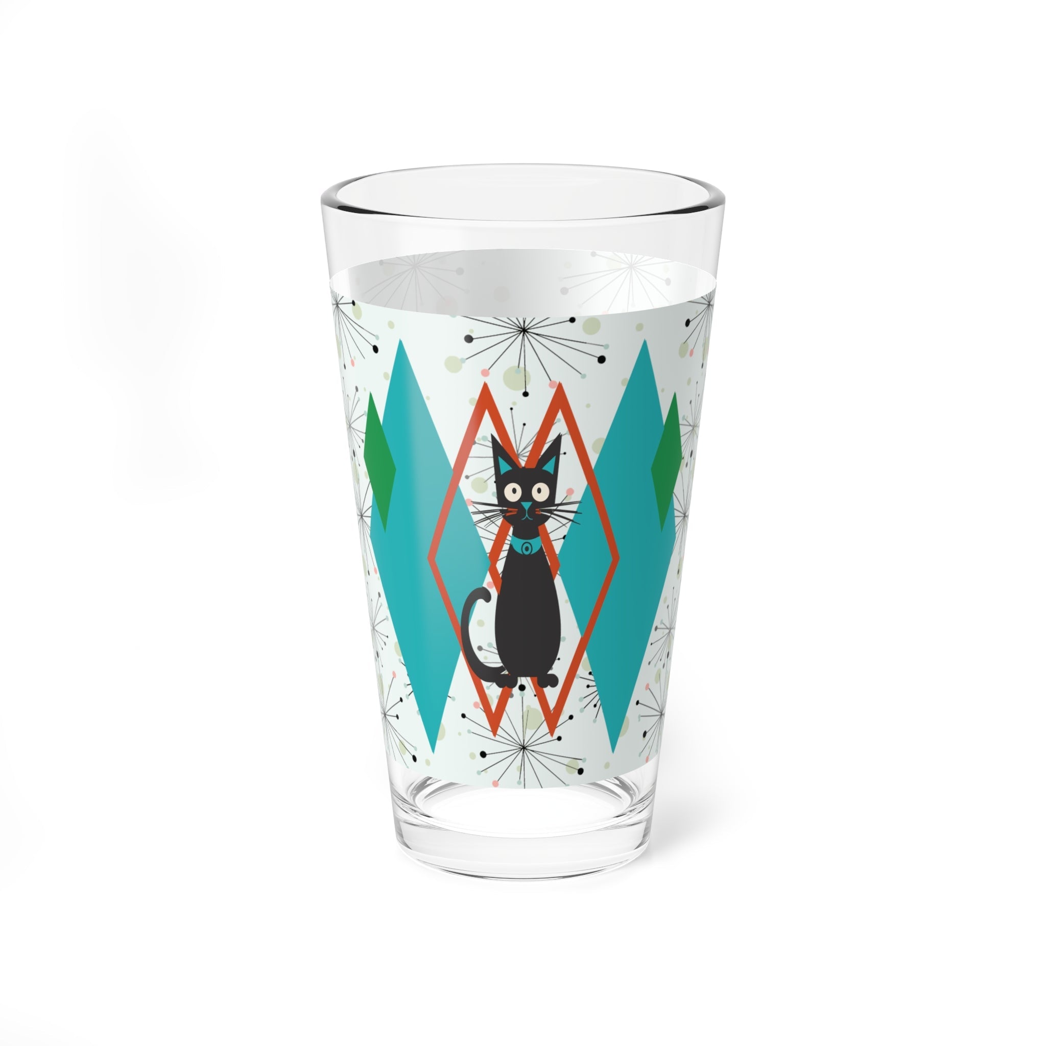 Vaso de pinta retro con diseño de gato atómico, color verde azulado y diamante, artículos de bar modernos de mediados de siglo, artículos de la era espacial de los años 50