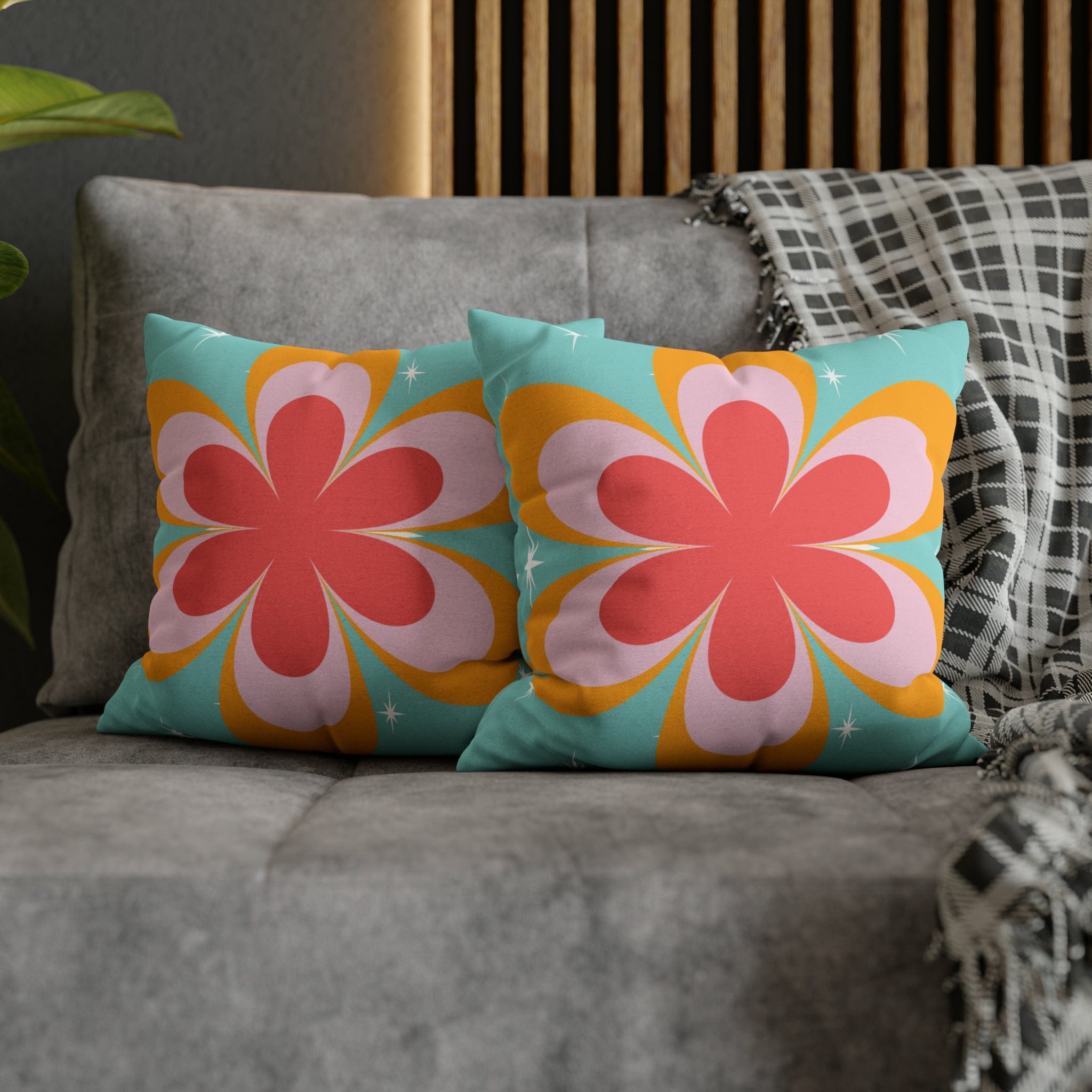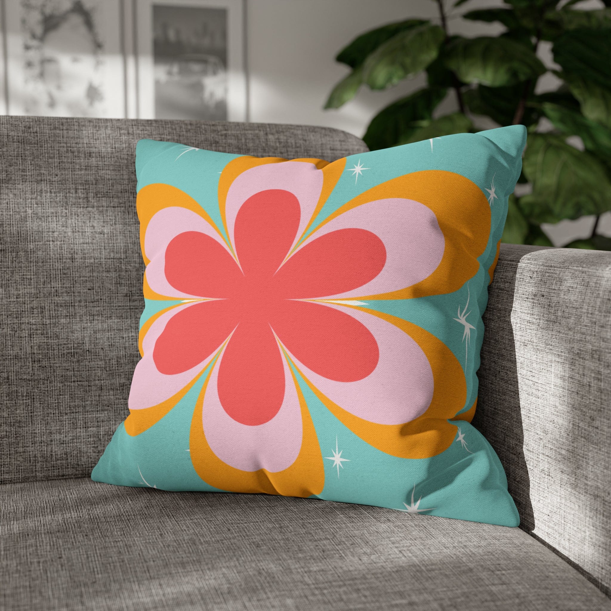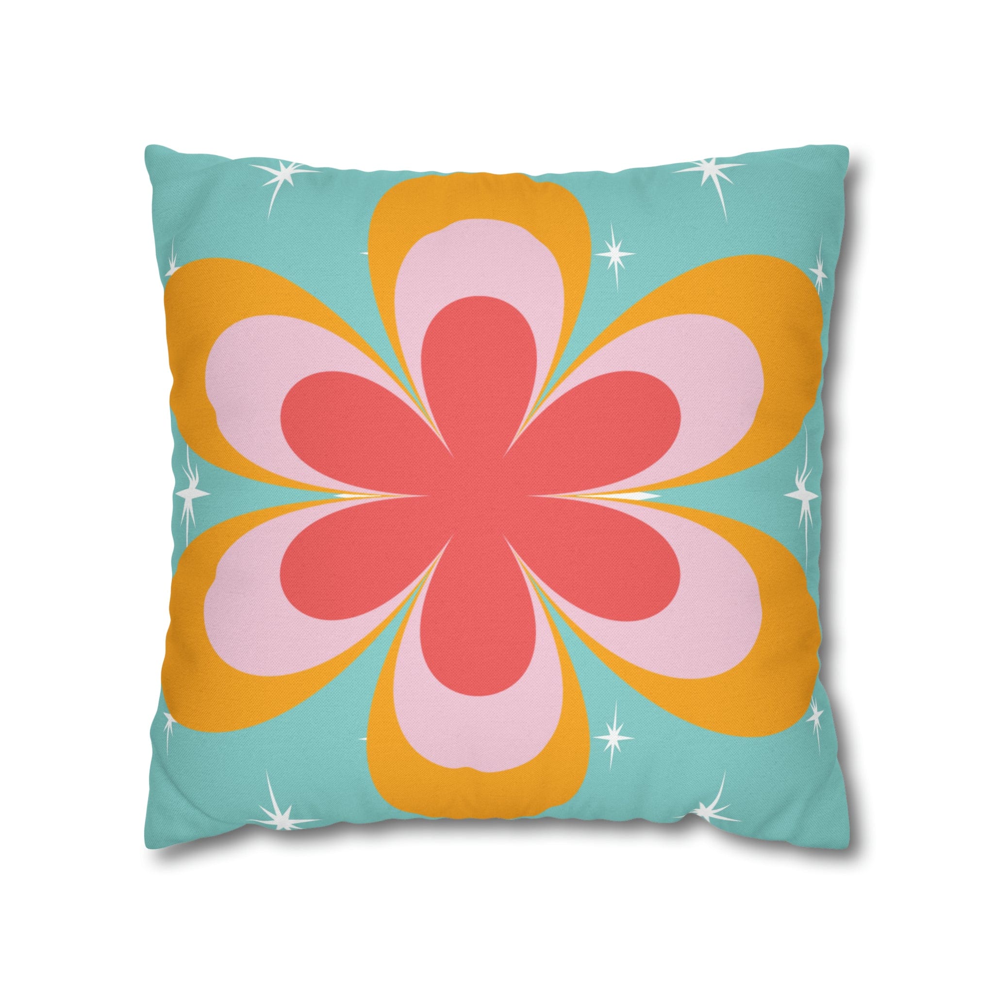 Funda de almohada con diseño retro de margaritas y flores, con detalles en coral estrellado de mediados de siglo, azul agua y amarillo mostaza.